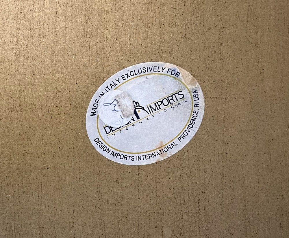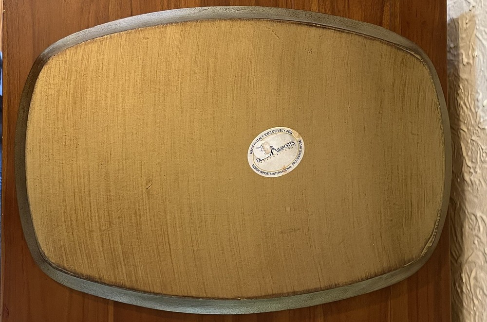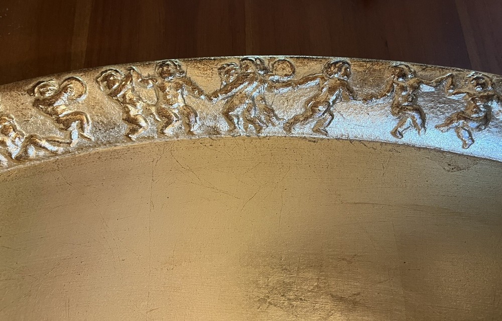 Very nice gold tray with raised border of carved dancing people. Purchased in Providence RI for $84. Made in Italy. Dimension is 19 inches in length by 13 1/4 inches in width. Weight is almost 2 lbs. (L)