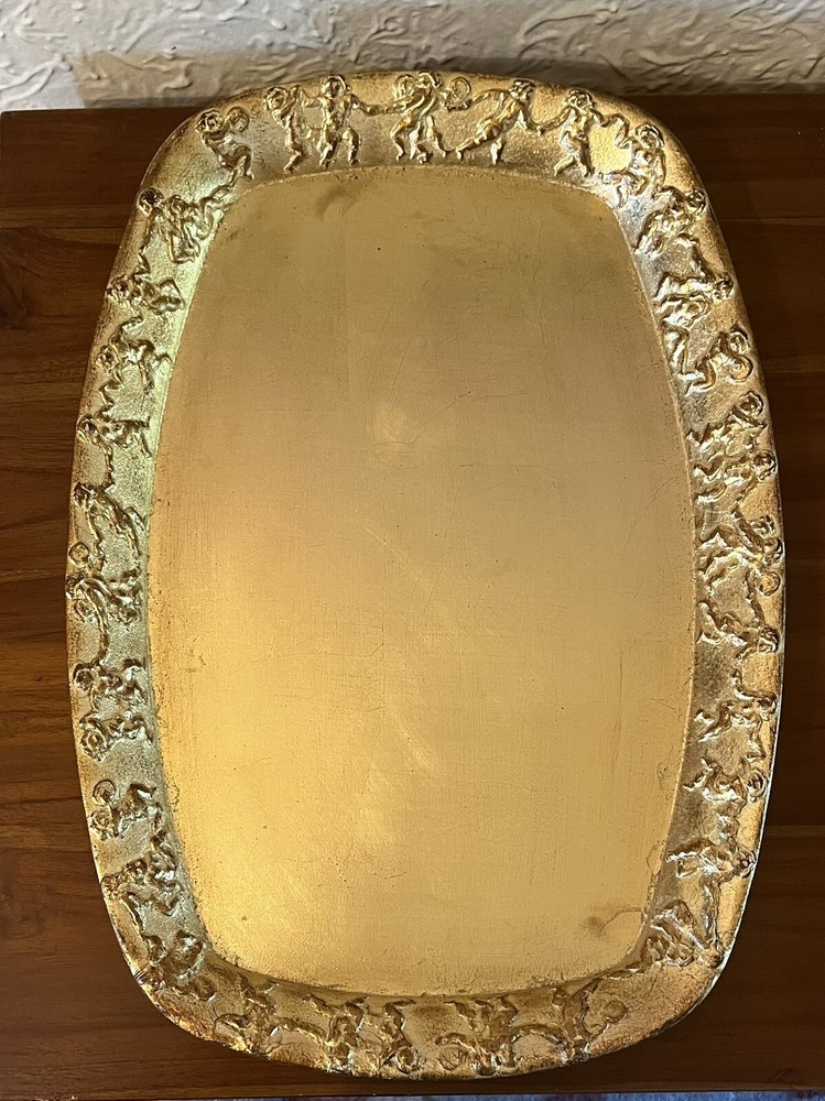Very nice gold tray with raised border of carved dancing people. Purchased in Providence RI for $84. Made in Italy. Dimension is 19 inches in length by 13 1/4 inches in width. Weight is almost 2 lbs. ...