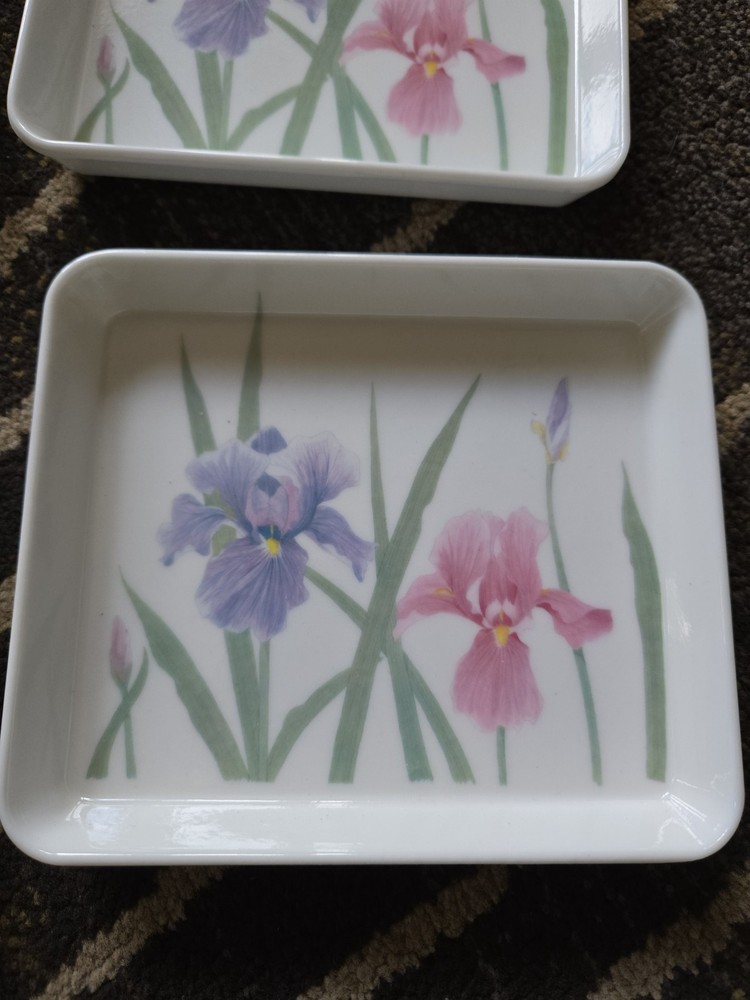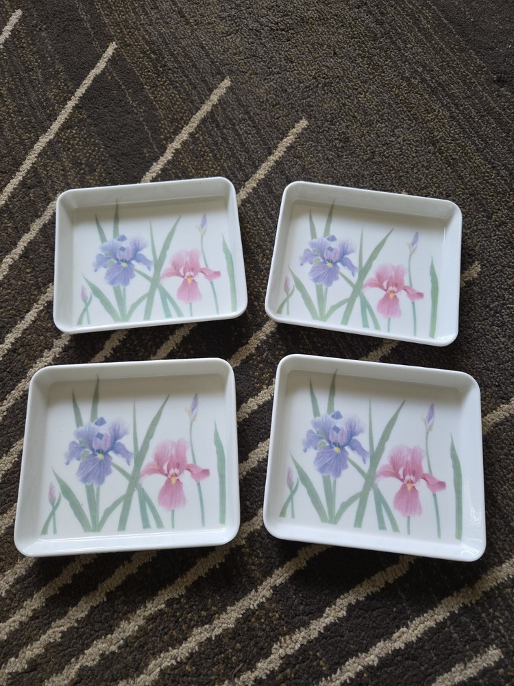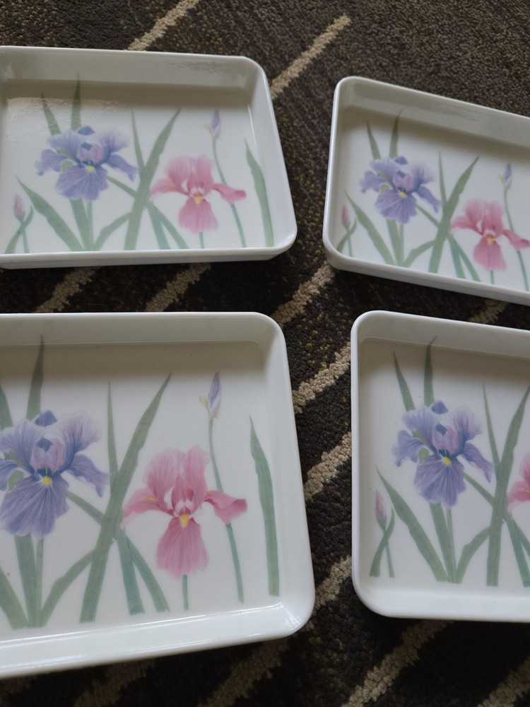 Beautiful Design Imports Iris Melamine Snack Tip Trays Italy Pink Purple Flowers Set of 4. 5.75in X 4.75in