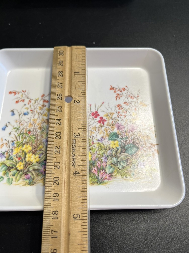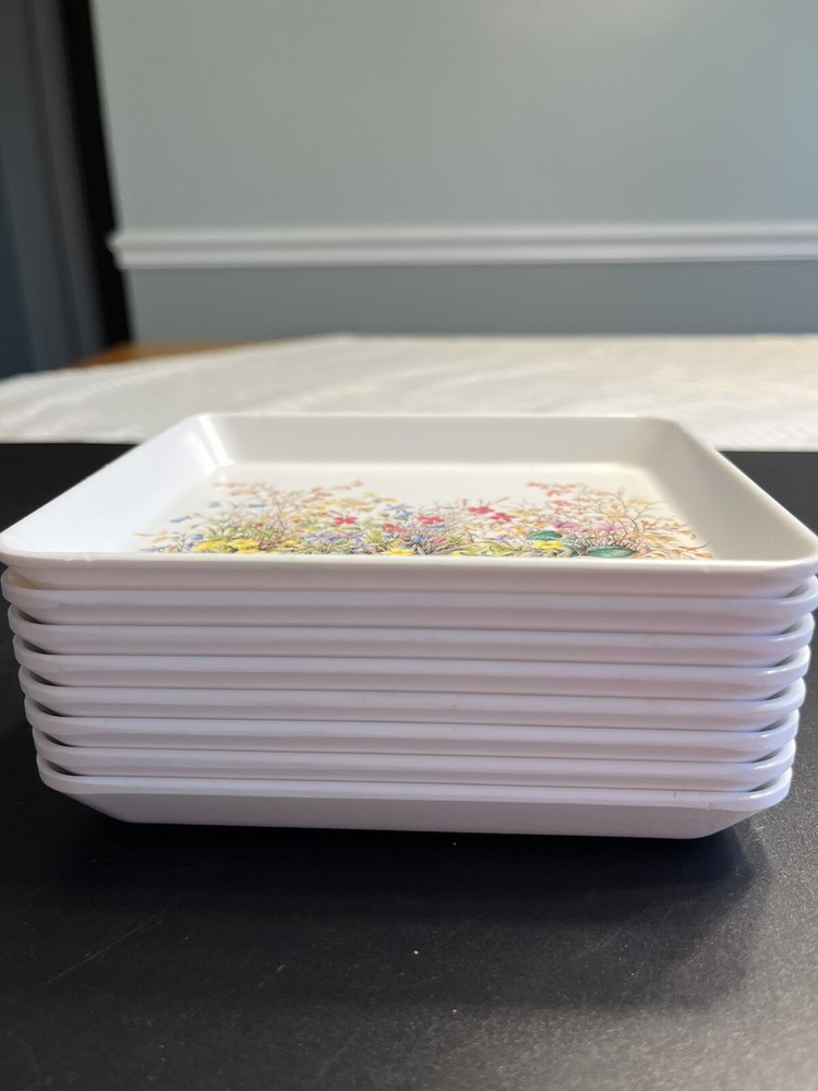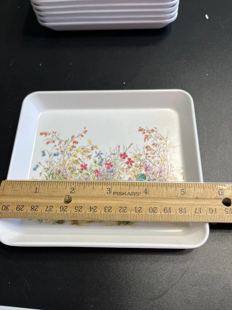 Add a touch of vintage charm to your home with this set of 8 Floral Melamine Rectangular Snack Trays from Design Imports. Perfect for all occasions, these trays feature a beautiful floral pattern and come in a variety of colors to match any decor. Each tray has a single tier and is made of durable melamine material, ensuring they will last for years to come. These original, licensed reproduction trays are ideal for serving snacks or desserts to your guests. They include a convenient tray feature that makes them easy to carry from the kitchen to the dining room. Made in Italy, this set is a must-have for any collector of dinnerware and serveware.