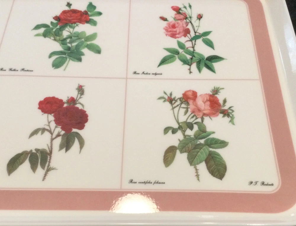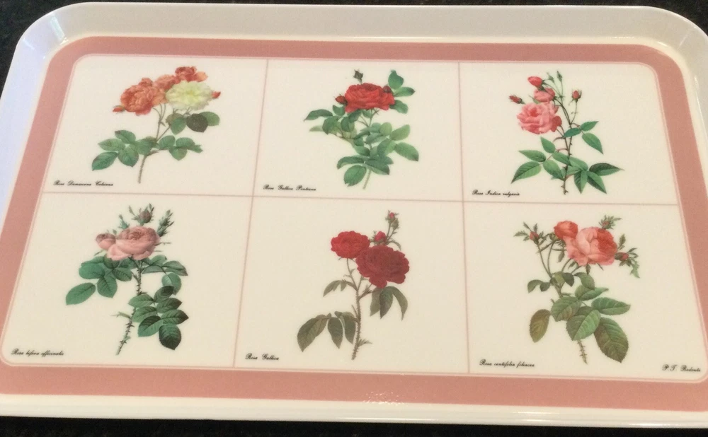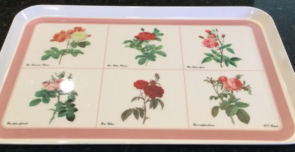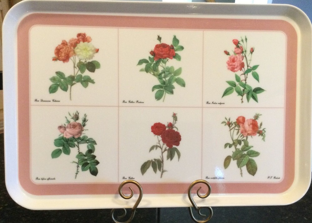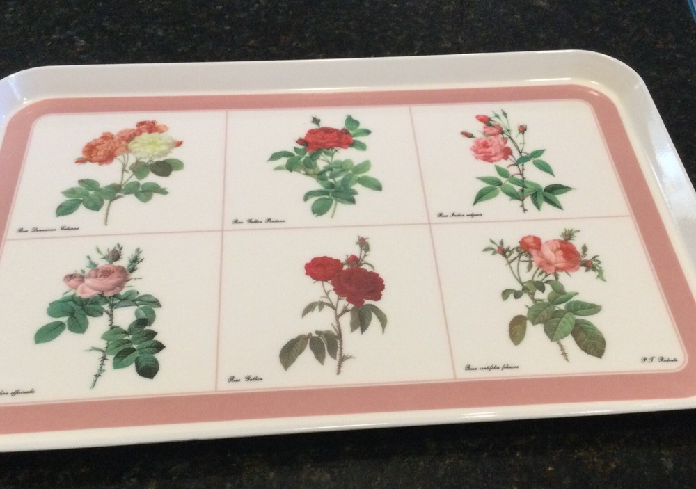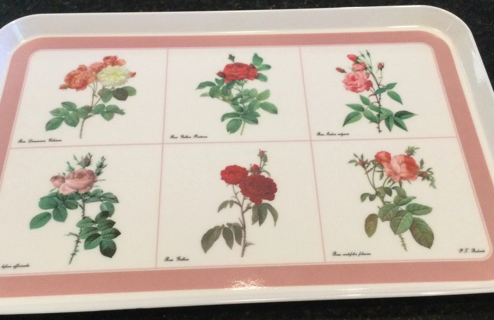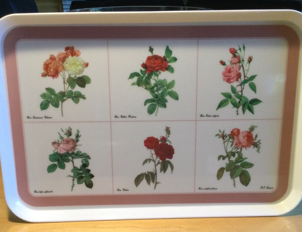 This Design Imports LTD serving tray is a must-have for any collector or lover of vintage dinnerware. The tray features a beautiful botanical pattern with roses in shades of pink, red, and white with green leaves. It is made of durable melamine material and has a rectangular shape that measures approximately 17 inches in length and 12 inches in width. Botanical drawings of roses are by Artist P. T. Redout’e. The tray is perfect for serving drinks or displaying decorative items, and its vintage design adds a touch of elegance to any table setting. It was made in Italy and has a deep edge of 1 inch, making it a great addition to any kitchen or dining room. Perfect addition to your vintage cottage or she-shed decoration. Excellent Used Condition!