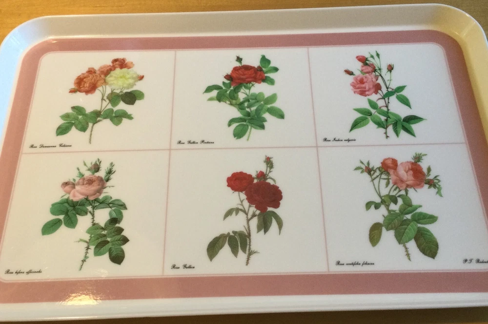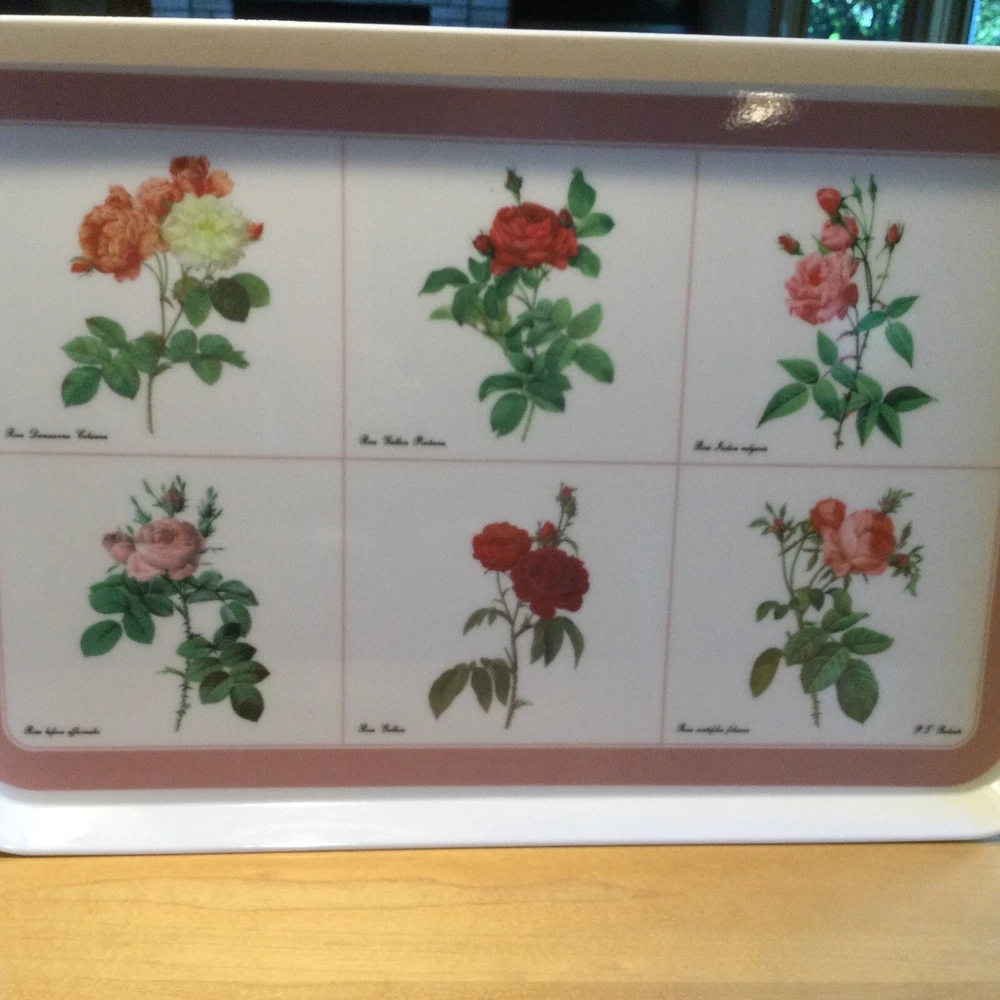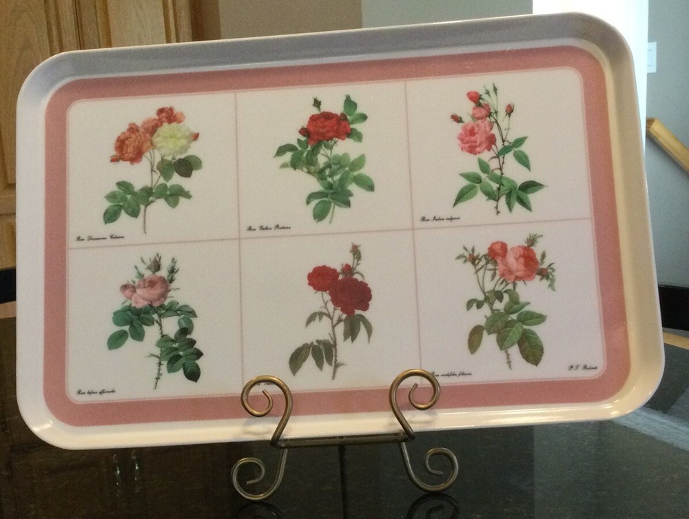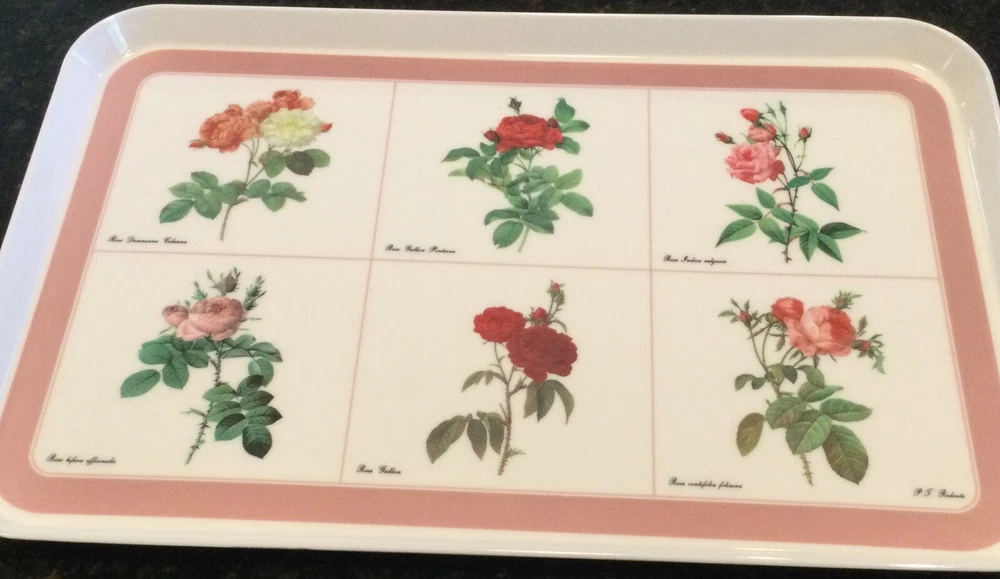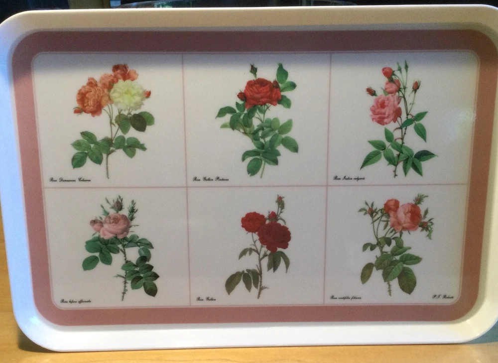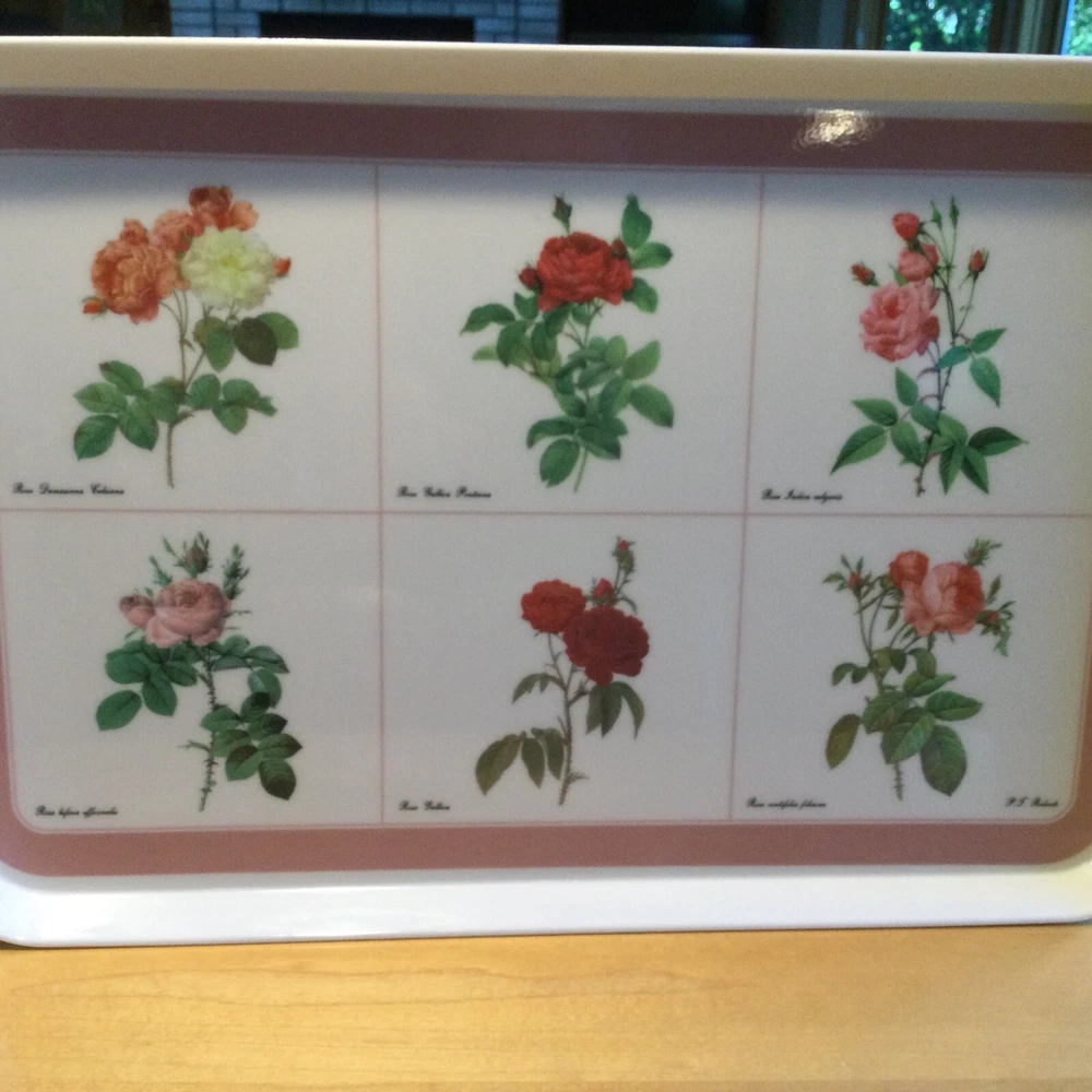 This Design Imports LTD serving tray is a must-have for any collector or lover of vintage dinnerware. The tray features a beautiful botanical pattern with roses in shades of pink, red, and white with green leaves. It is made of durable melamine material and has a rectangular shape that measures approximately 17 inches in length and 12 inches in width. Botanical drawings of roses are by Artist P. T. Redout’e. The tray is perfect for serving drinks or displaying decorative items, and its vintage design adds a touch of elegance to any table setting. It was made in Italy and has a deep edge of 1 inch, making it a great addition to any kitchen or dining room. Perfect addition to your vintage cottage or she-shed decoration. Excellent Used Condition!