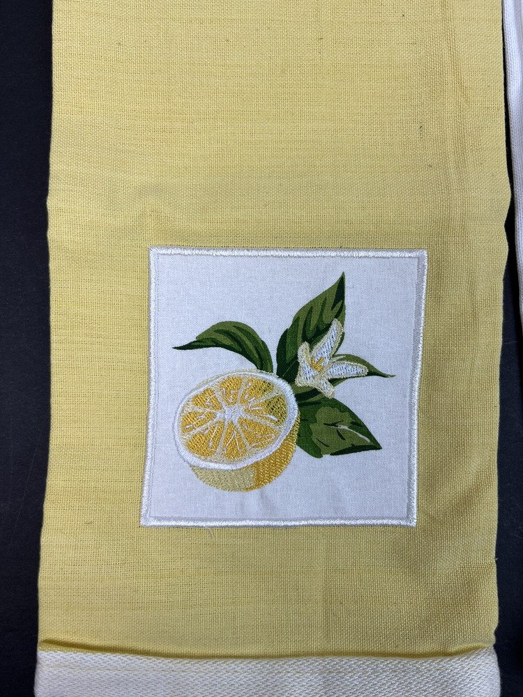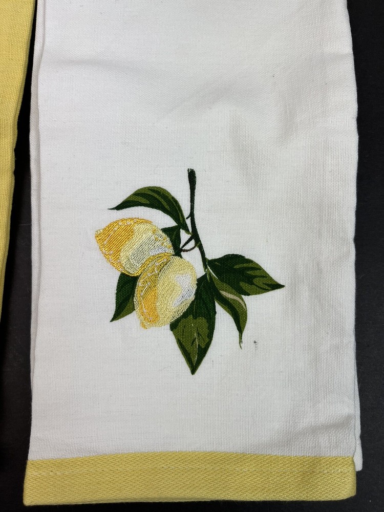 - Design Imports Lemon Bliss Embellished Dishtowel Set of 2 - Brand new with tags - One yellow towel with an embellished lemon slice and one white towel with an embellished lemon branch - Made of 100% Cotton - Each towel measures 18" x 28"