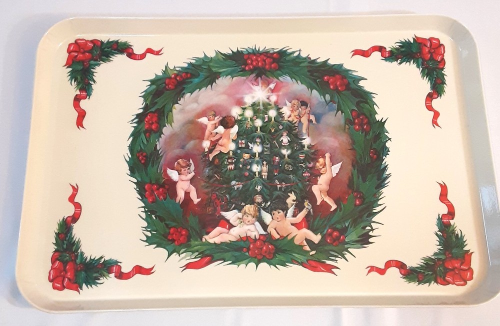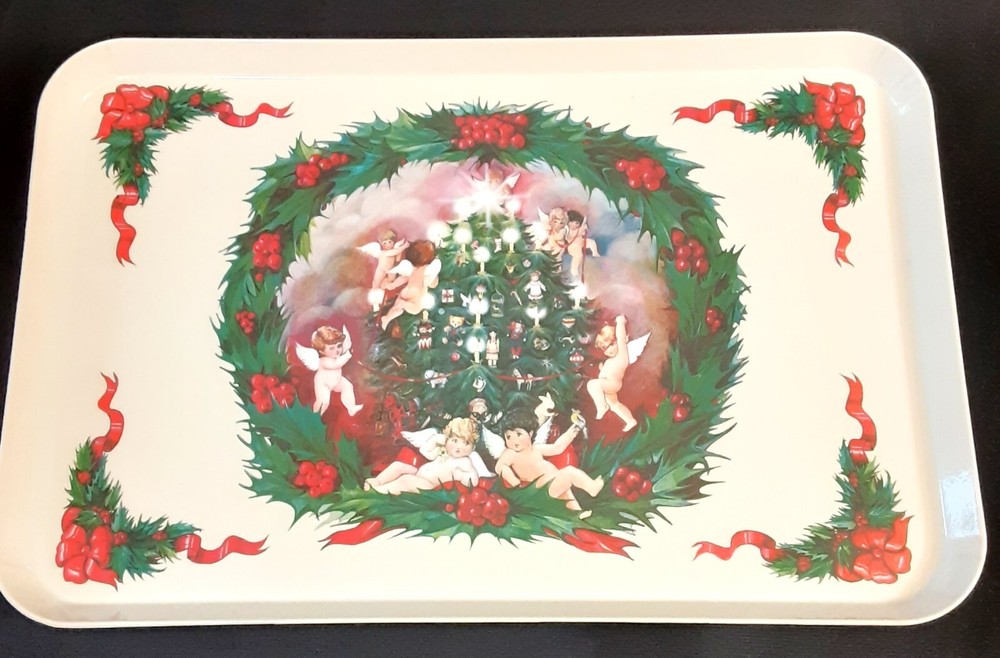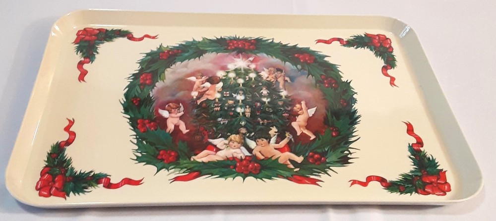 Design Imports Melamine Serving Tray Christmas Wreath Made in Italy 17.5" long and 11.5" wide .75" tall This tray, made in Italy for Design Imports, is in great shape. Features cherubs surrounding a Christmas tree, encircled by a holiday wreath. Background is white/ivory, and the green and red colors are vibrant and bright.