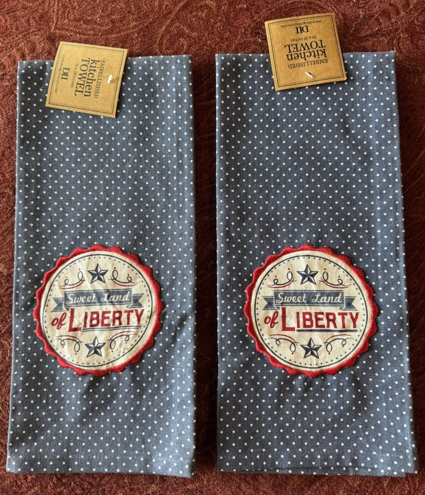Design Imports Patriotic July 4th Dish Towels 2 Brand New Americana Independence Day Embellished Towels; 100% Cotton;Measures 18"x28"; New with Tags...