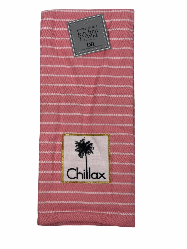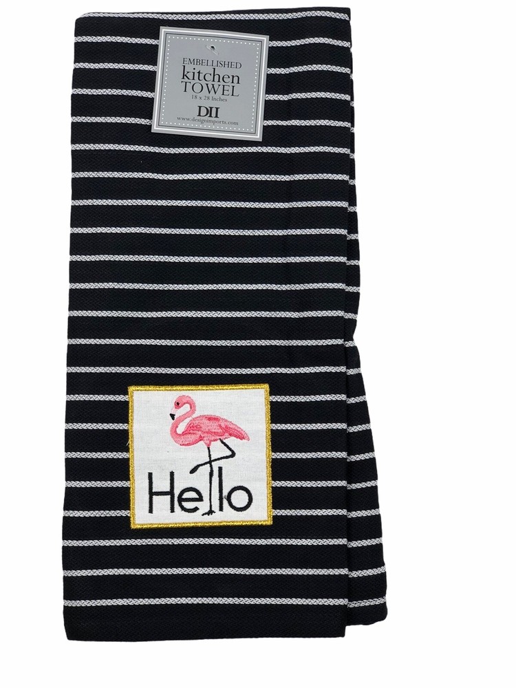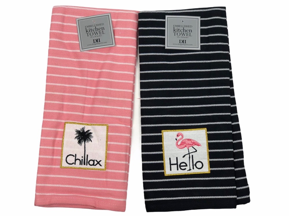 - Design Imports Black and Pink Flamingo and Chillax Palm Tree Dishtowel Set of 2 - Each towel measures 28" x 18" - Made of 100% Cotton. Machine wash cold separately. Gentle Cycle. Tumble dry low. Low...
