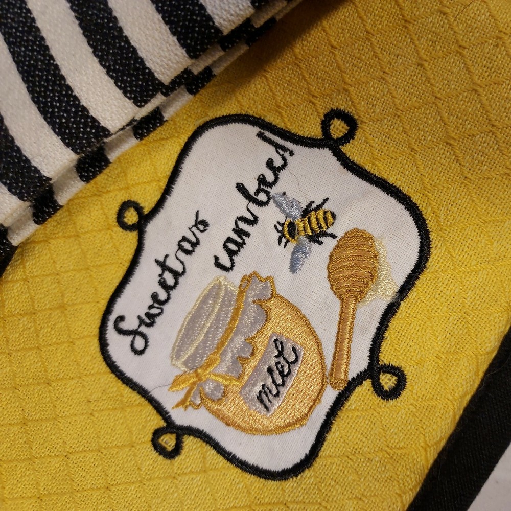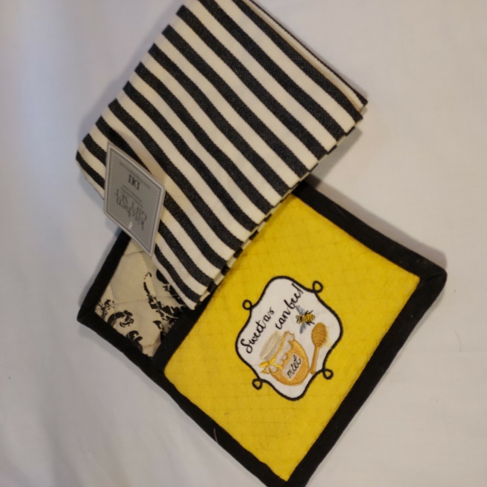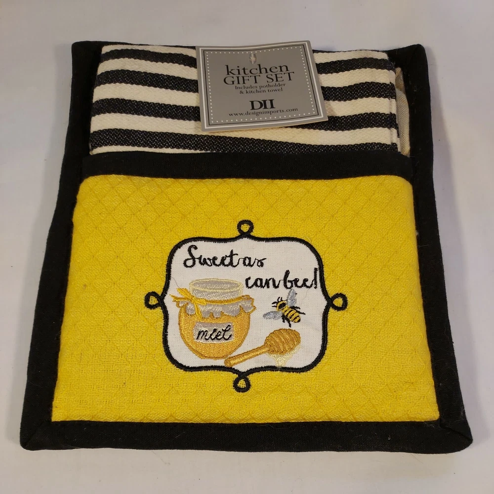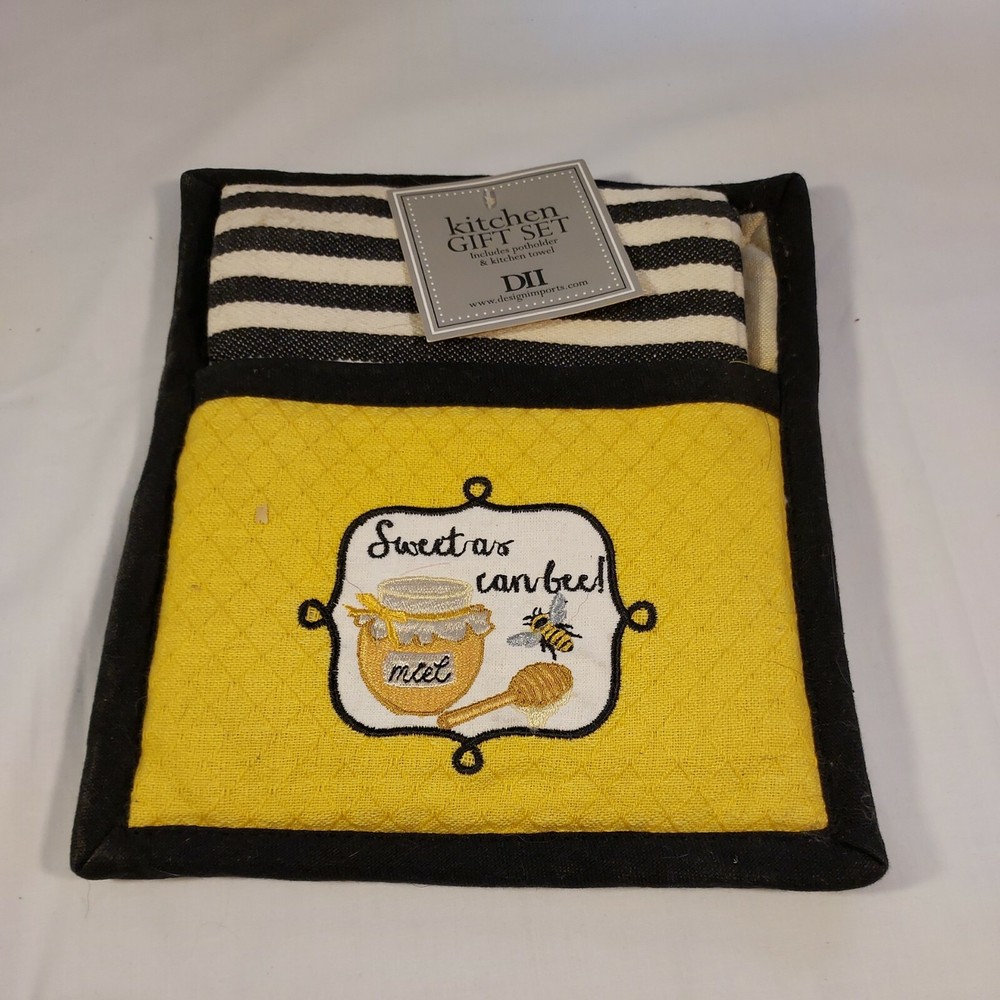 Sweet as Can Bee Embroidered Pot Holder and Striped Towel Tucked inside Design Imports India Kitchen Gift Set Thick Quilted with pocket to use as oven mitt. Works as a trivet....