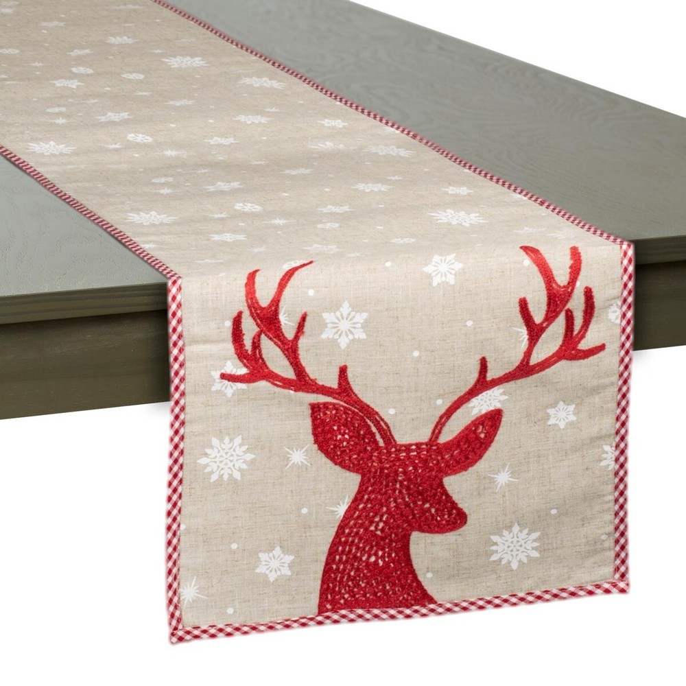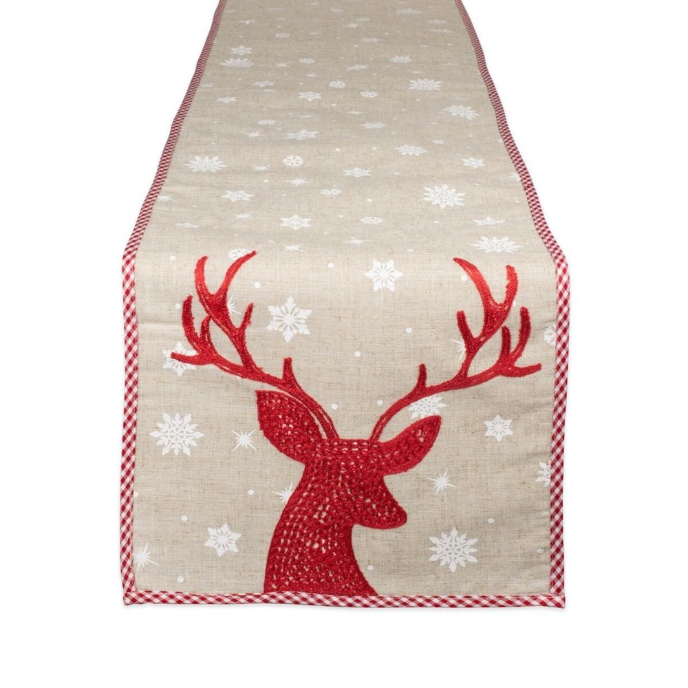 Design Imports Red Reindeer Embroidered Table Runner 14-inch x 70-inch - Red New Design Imports Red Reindeer Embroidered Table Runner 14-inch x 70-inch A striking Reindeer is embroidered at each end of this table runner with delicate snowflakes printed throughout for a perfect holiday pop at your dinner table. Gingham red and white trim perfectly frame this table runner that can be used all through winter and the Holiday season. It can be dressed up or down to create the perfect look for your table! 80% Polyester 20% Linen Measures approx. 14"W x 70"L Imported RETURN POLICY: Returns will only be accepted if the item is in brand new condition with the original packaging that it was sent to you. If the item has been used it will not be accepted as a return. Returns will only be accepted if the item is unopened. There will be a 20% restocking fee on all returns. COMBINED SHIPPING: WE DO COMBINE SHIPPING IF YOU PUT THE ITEMS INTO THE CART IT WILL AUTOMATICALLY COMBINE AND DISCOUNT THE SHIPPING FOR YOU. To return an item, you must contact us within 30 days of receiving the merchandise. Please inspect your merchandise the moment it arrives. We will issue you a RA (Return Authorization) number and provide instructions for the return. Once the RA number is issued, your package must be post-marked within 5 days of the return authorization date. If you exceed the above specified time frame (ie. Did not contact us 30 days after receiving the merchandise or packages was not post-marked within 5 days of RA authorization date) or we receive an unauthorized refused package or an undeliverable package, you will be subjected to a 20% restocking fee. The restocking fee is based on the merchandise total amount (shipping fee not included). Items that are returned without a RA number are not eligible for a refund. Please note that refunds are given for the cost of the merchandise (merchandise plus tax) only. Shipping charges are non-refundable for returns.