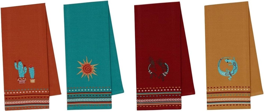 Design Imports Southwest Table Linens, 18-Inch by 28-Inch Dishtowels, Set of 4, 1 Cactus Embroidered, 1 Sun Embroidered 1 Kokopelli Embroidered and 1 Lizard Embroidered