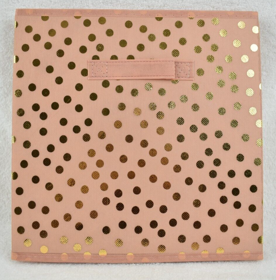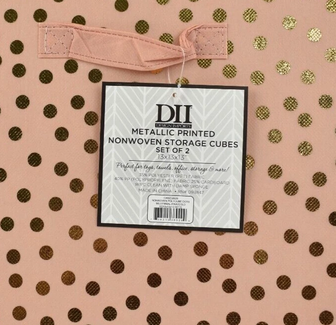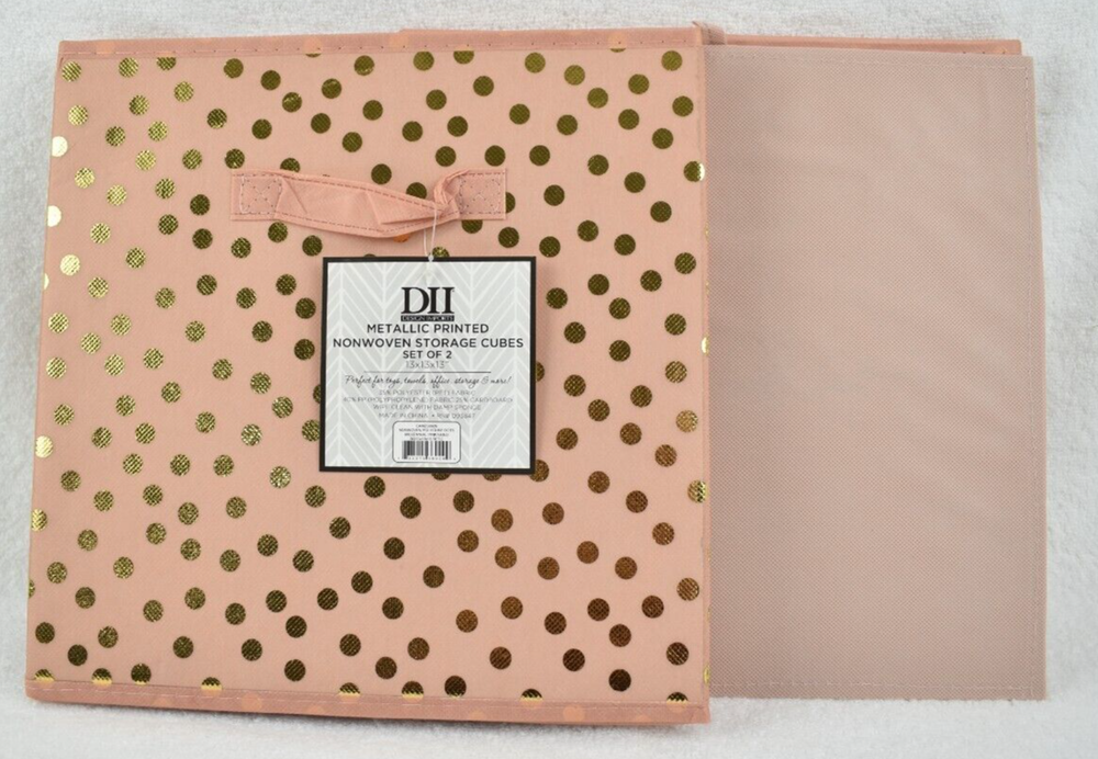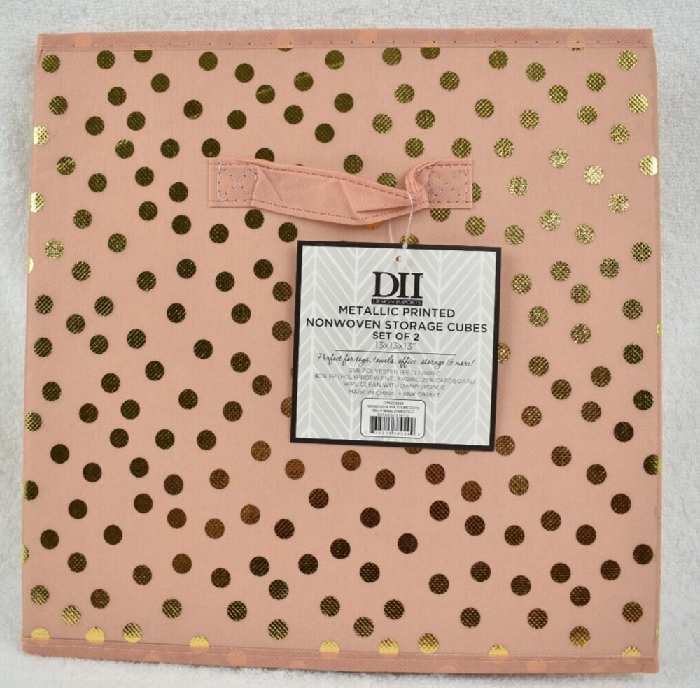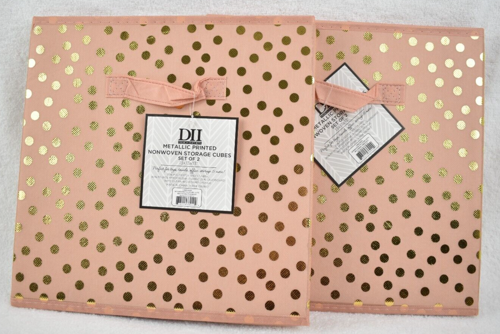 Design Imports Storage Cubes / 13"x13"x13" / Metallic Print / Pink /w Gold Dots *These are an open box/display item. There are 2 cubes, but there is only one bottom insert included that goes in the cube. A piece of cardboard or particle board could be cut to size and would serve the same purpose for the bottom insert. Please enlarge all of the pictures and look at them closely. Thanks for looking! _________________________ Items I sell: Everything I sell is pre-owned, much of which comes from estate sales, unless otherwise specified. While I will try to describe everything to the best of my ability, I am sure there may be times I might miss something on an item, so please be sure to look at all pictures closely. If for some reason you are not satisfied with the item you've purchased, please contact me so we can get the issue resolved. Payments: All payments are due within 3 days of an auctions end, or due immediately upon purchase of the item using buy it now. Shipping: I will be happy to combine shipping on any items. Before you purchase, just let me know what items you are interested in, along with your zip code, and I will let you know what the total shipping costs will be. I ship items the next day after purchase unless the next day is a Sunday or holiday. I ship globally through eBay's Global Shipping Program. Shipping quotes I provide are for the USA only. If you live outside of the USA, please check what the shipping will cost to your location before you bid as shipping overseas will greatly increase your overall cost. Returns: All return postage is to be paid by the buyer, no exceptions.