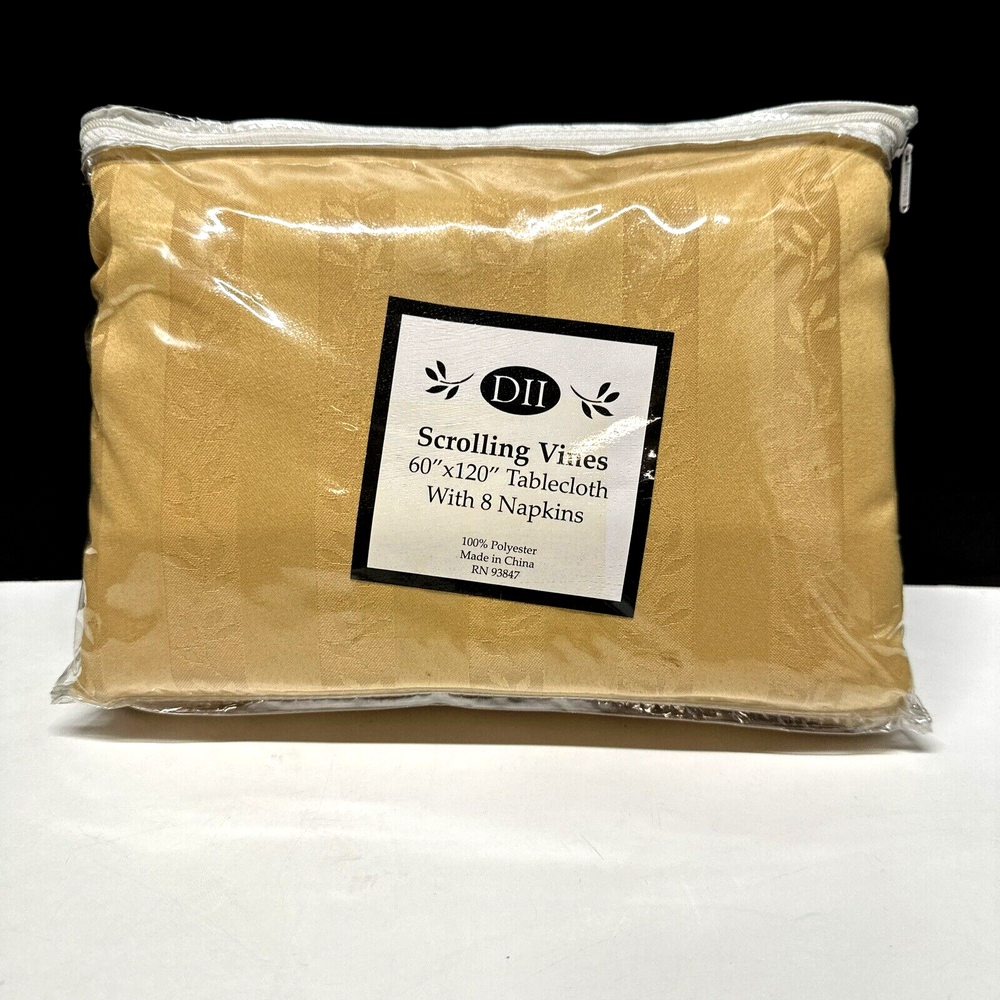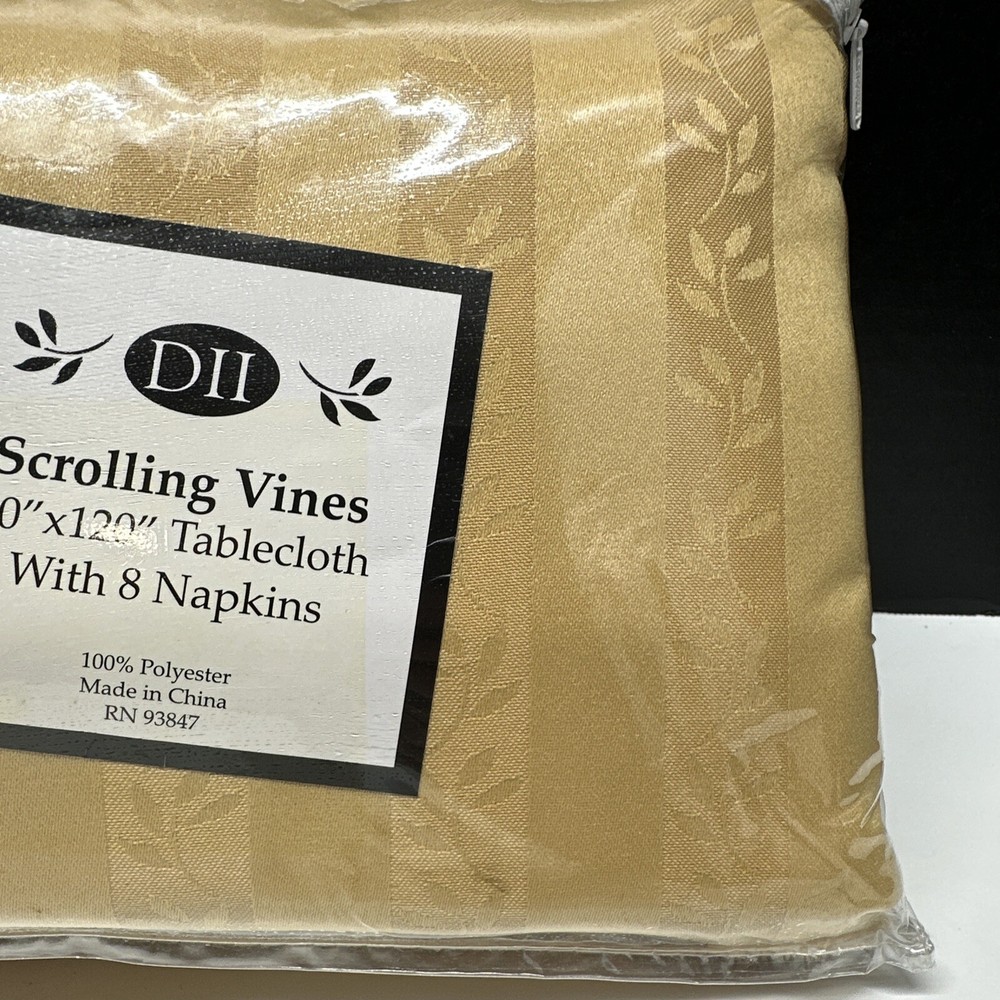Add a touch of elegance to your dining table with this beautiful Design Imports Tablecloth. The rectangular tablecloth is made of 100% polyester with a solid gold color and stripes on the edges. It measures 120 inches in length and 60 inches in width, making it perfect for larger dining tables. The tablecloth comes with 8 napkins and features a scrolling vines pattern, which adds a casual everyday theme to your dining room. It is machine washable, making it easy to clean and maintain. This tablecloth is perfect for family dinners or casual gatherings with friends. We strive to put quality items in our store for you to purchase, however if you are unhappy with your purchase return the item within 30 days of purchase thru eBay for a refund. We ship, if possible, the same day as payment or next day, if necessary, Monday thru Friday. Ships Quickly