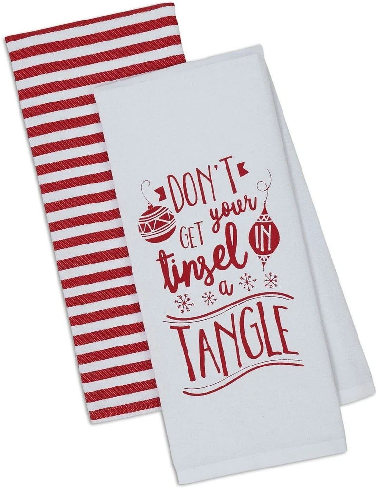- Design Imports "Don't Get Your Tinsel in a Tangle" set of 2 Christmas Holiday Dish Towels - Brand new with tags - Each towel measures 18" x 28" - Made of 100% Cotton....