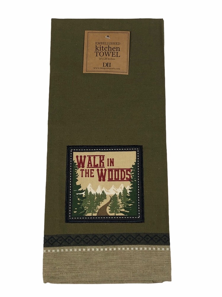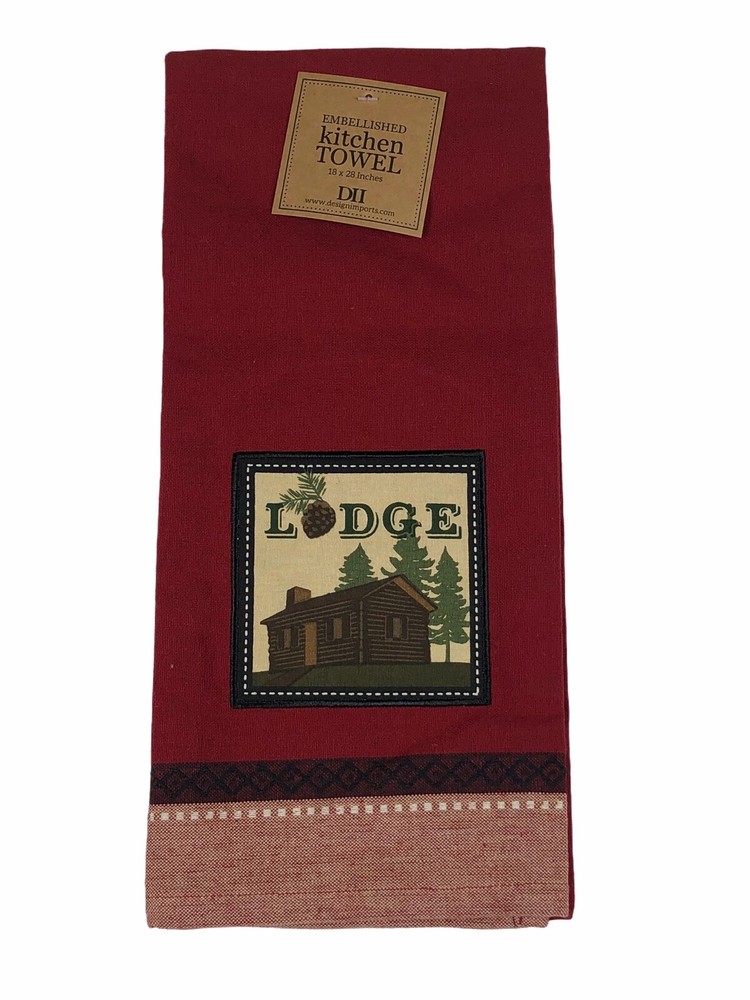 - Design Imports Embellished Dishtowels Set of 3 - Includes 3 different towels. One towel is red with a "lodge" graphic, one towel is olive green with a "walk in the woods" graphic, and another towel is dark green with "the moose trail lodge" graphic - Brand new with tags - Each towel measures 28" x 18" - Made of 100% Cotton. - Machine wash cold separately. Gentle Cycle. Tumble Dry Low. Low iron.
