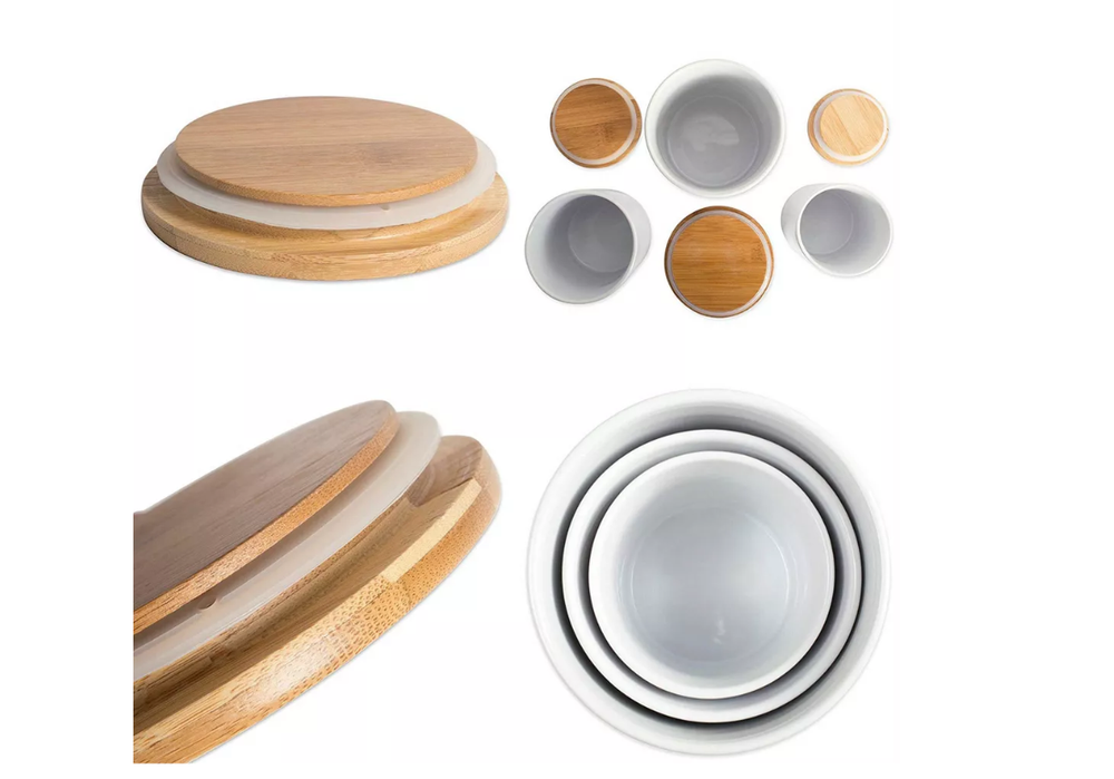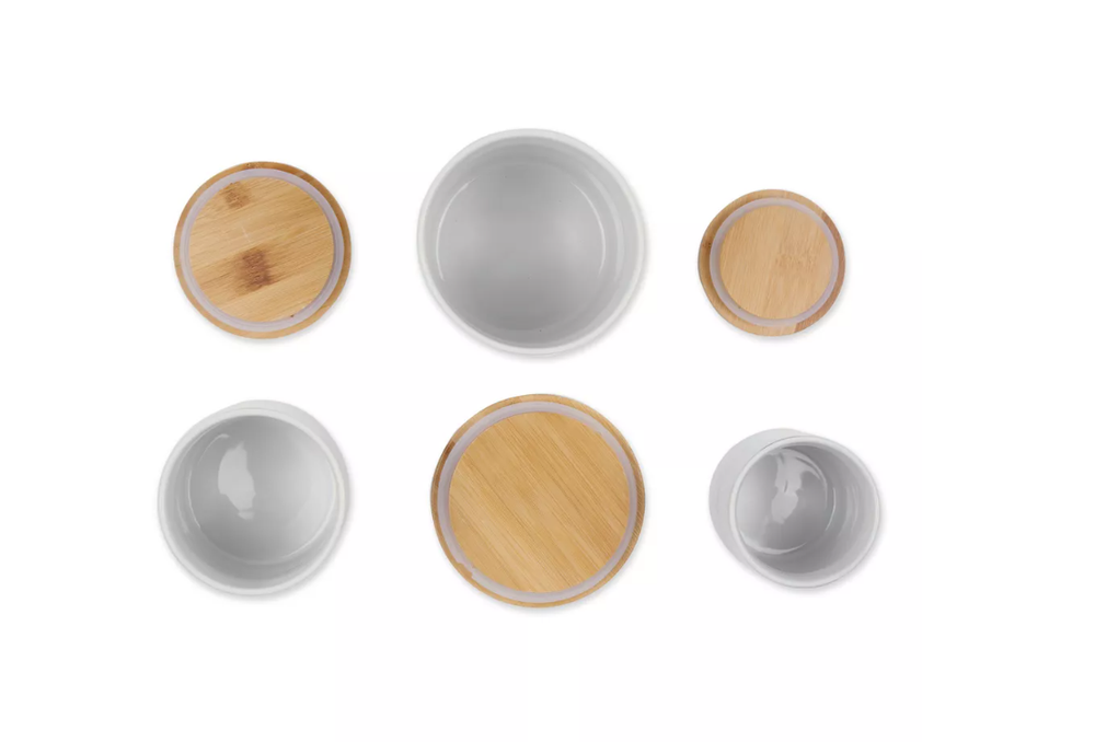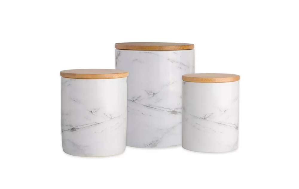 Highlights Set includes 3 canisters. Coffee Canister measuring 4.5 x 4.5 x 5.5 inches and holds 4.5 cups. Sugar Canister measures 4 x 4 x 4.5 inches and holds 3 cups. Tea Canister measures 3 inches by 3 inches by 4 inches and holds 1.25 cups. Heavy duty ceramics are dishwasher safe. For the bamboo lids, simply remove the silicone attached along the lid, hand wash with soap and rinse with water. Wrap the silicone around the lid again and seal back up to use again. Lid is made of bamboo with a silicone seal ring for a decorative, finished look and to keep contents fresh. Lids are not air-tight, to seal lid effectively, press firmly down then rotate at least a quarter turn. Whether giving as a gift or using in your own home, these containers will surely add charm to any kitchen and complements from guests. Description We offer full collections of trend based designs, bringing you fresh, innovative lines of quality home products for every season. Let our products become a valuable part of your life.