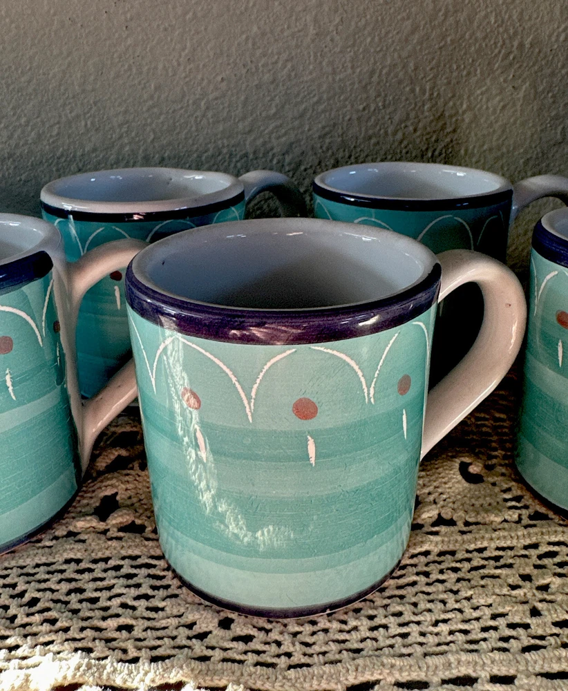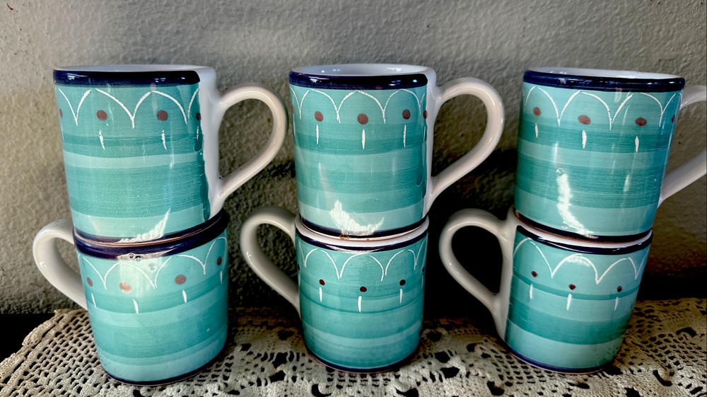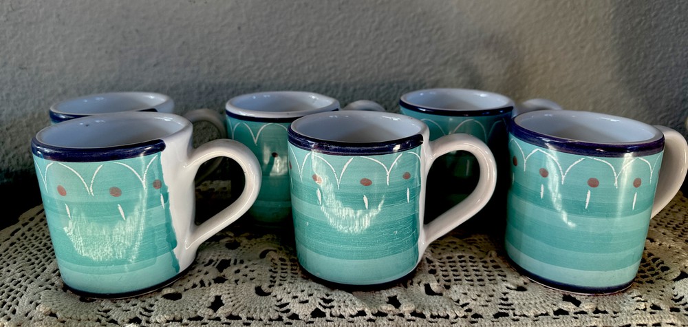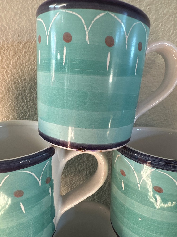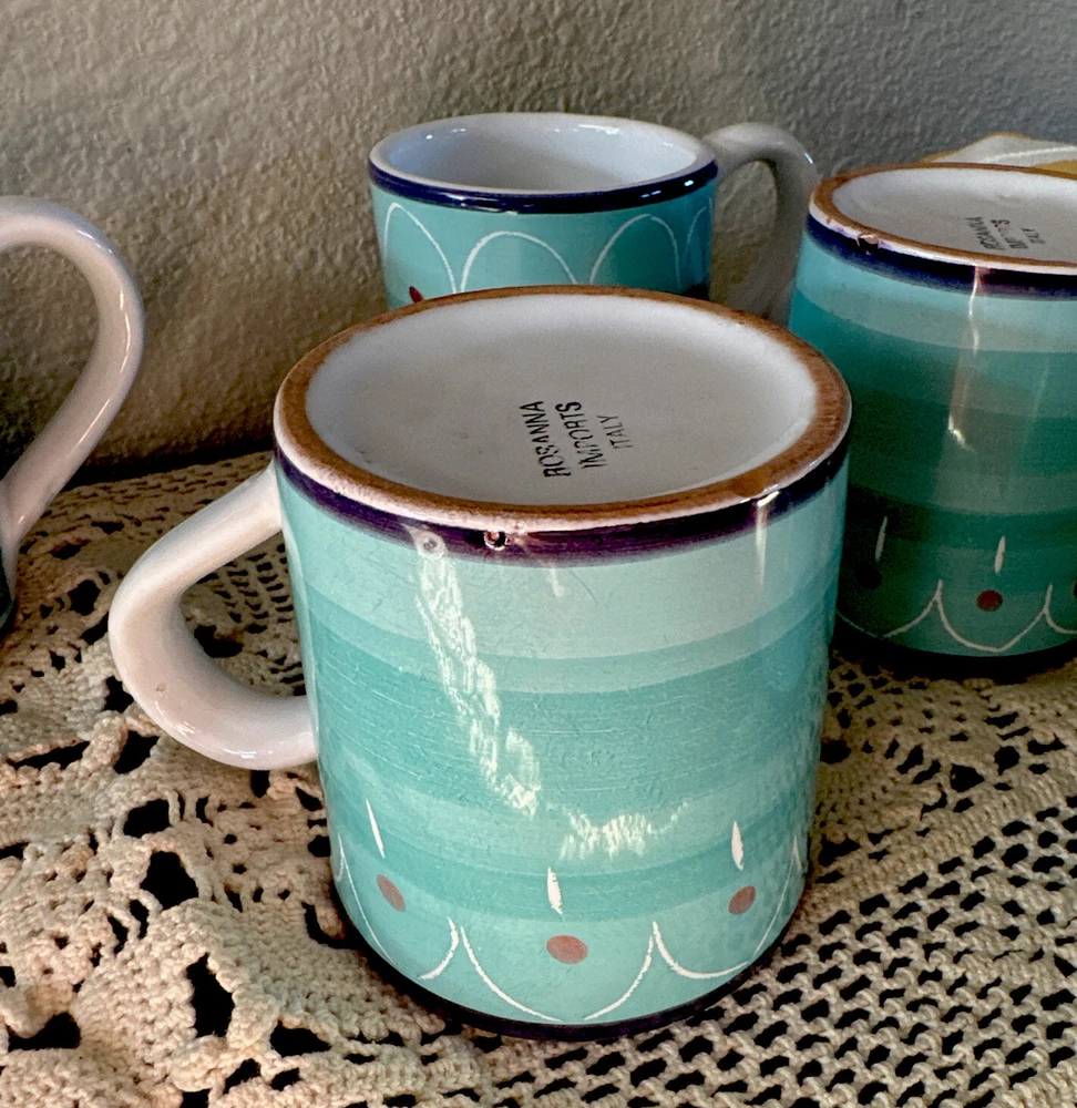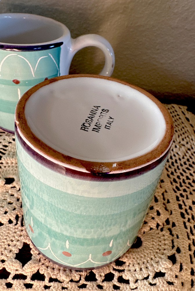 Add some Italian charm to your morning coffee routine with this set of 6 small cappuccino mugs from Rosanna Imports. The colorful multicolor pattern is perfect for any occasion and the pottery production technique ensures each mug is unique. Made in Italy, these mugs are perfect for adding a touch of sophistication to your collection. Whether you're a collector or simply looking for a stylish addition to your kitchen, these Rosanna mugs are a must-have. Size is 3” As pictured 2 have very small chips on bottom