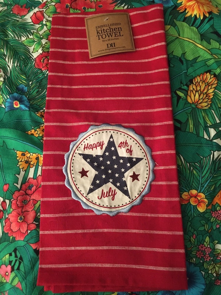 Design Imports Brand New With Tag Embellished Kitchen Towel. "Happy 4th Of July" 100% Cotton. 18 by 28 Inches Measures.