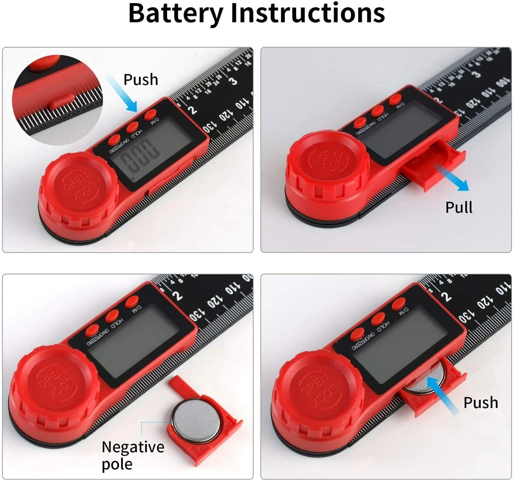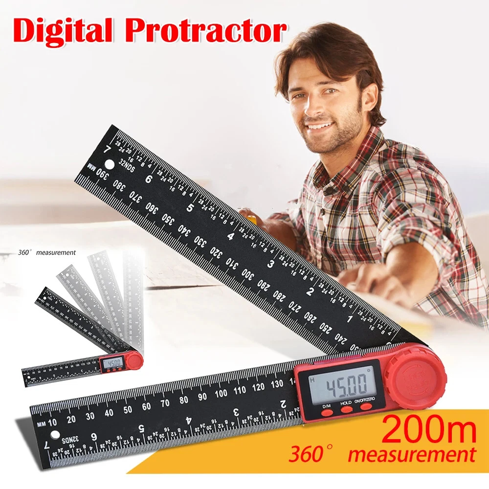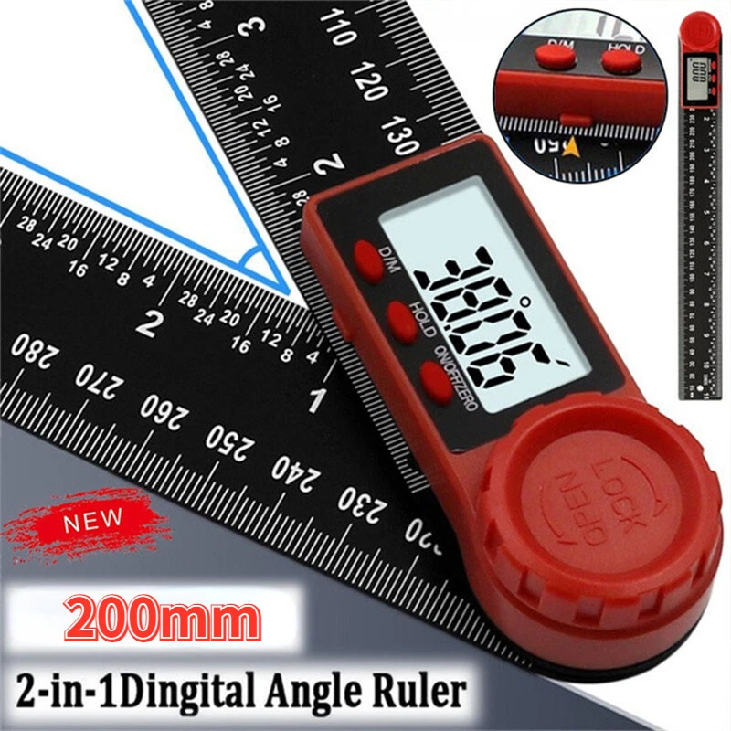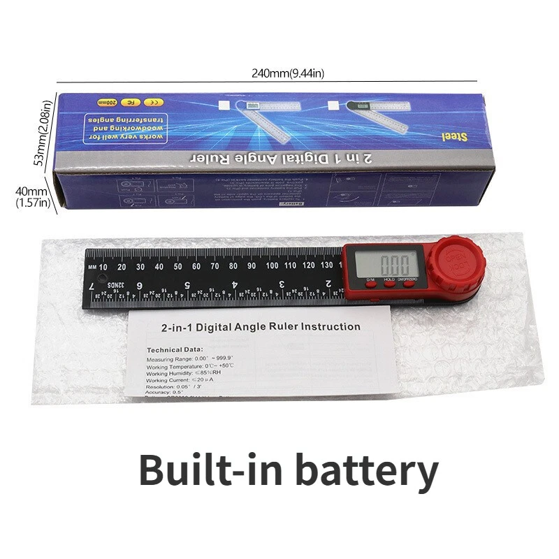 Product description Size: 8 inch/200 mm Features: Usages: Measurement of angle and length Professionally measure the inner and outer angles and angles of objects 0-360 ° complete measurement Clear LCD display, easy to read 5 minutes automatically shut down Button function: ON/OFF key, Zereo Reset key, data hold button, ° and ’ conversion button Specifications: Built-in CR2032 battery Material:Carbon fiber + ABS Measuring range: 0-360 ° Resolution: 0.05 ° Accuracy: ± 0.3 ° Length: 0-8 inch (200mm)