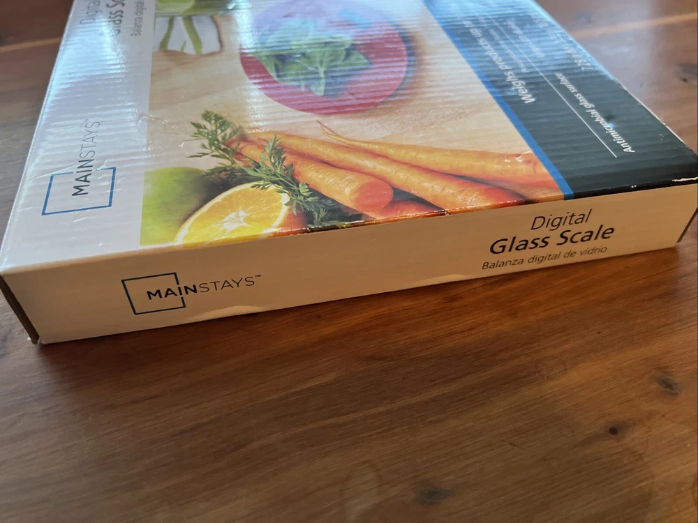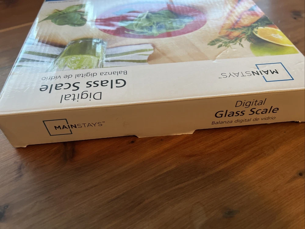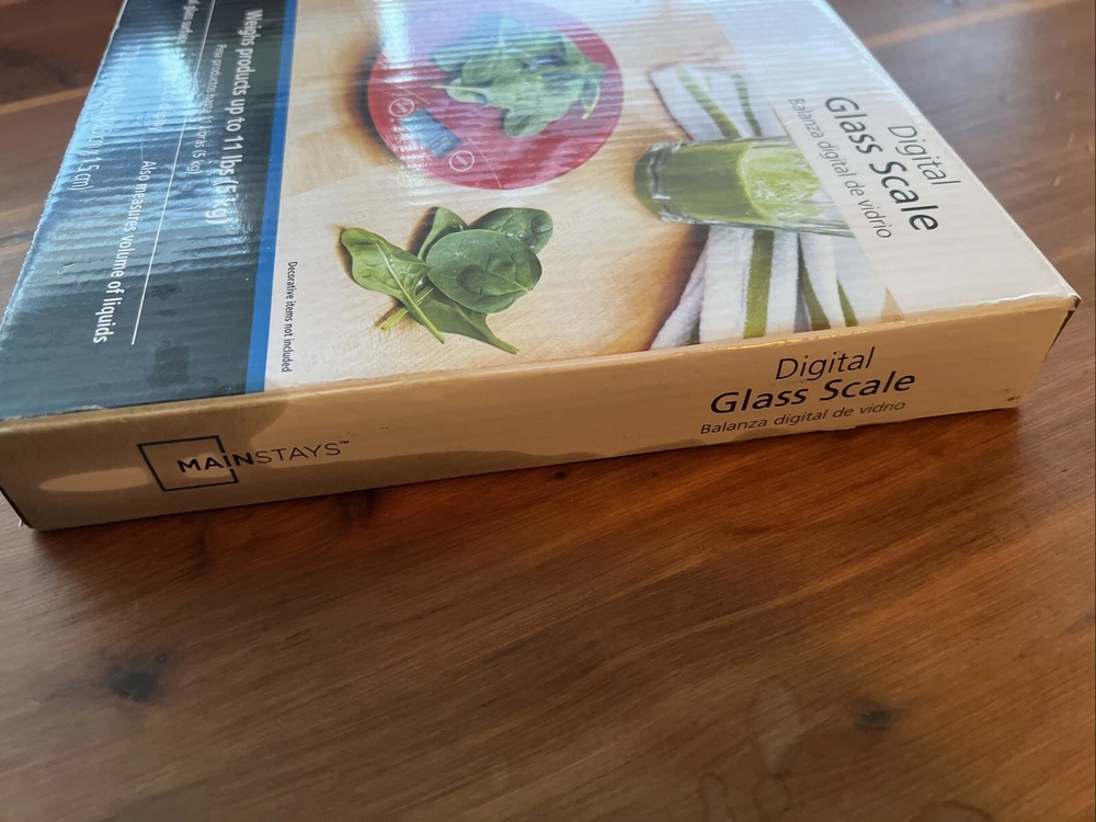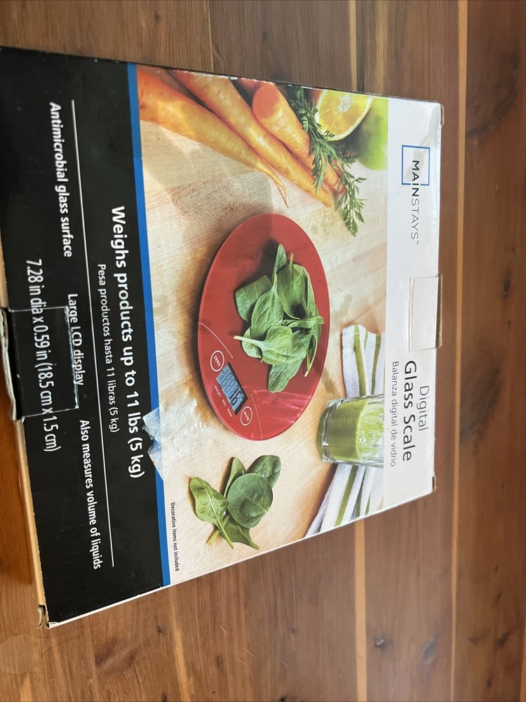 This digital glass food scale plate has a 7.25" diameter and weighs 11 lbs. It is manufactured by Mainstays and has a red antimicrobial surface. The scale is powered electrically and features a digital display. The item is solid and round in shape, made of glass material, and has no custom bundle. California Prop 65 Warning applies to this item. The model number is EK9450K and it is a modern style digital scale. This scale is easy to clean and has no personalization feature. It is suitable for home and garden use, and falls under the category of kitchen tools and gadgets.