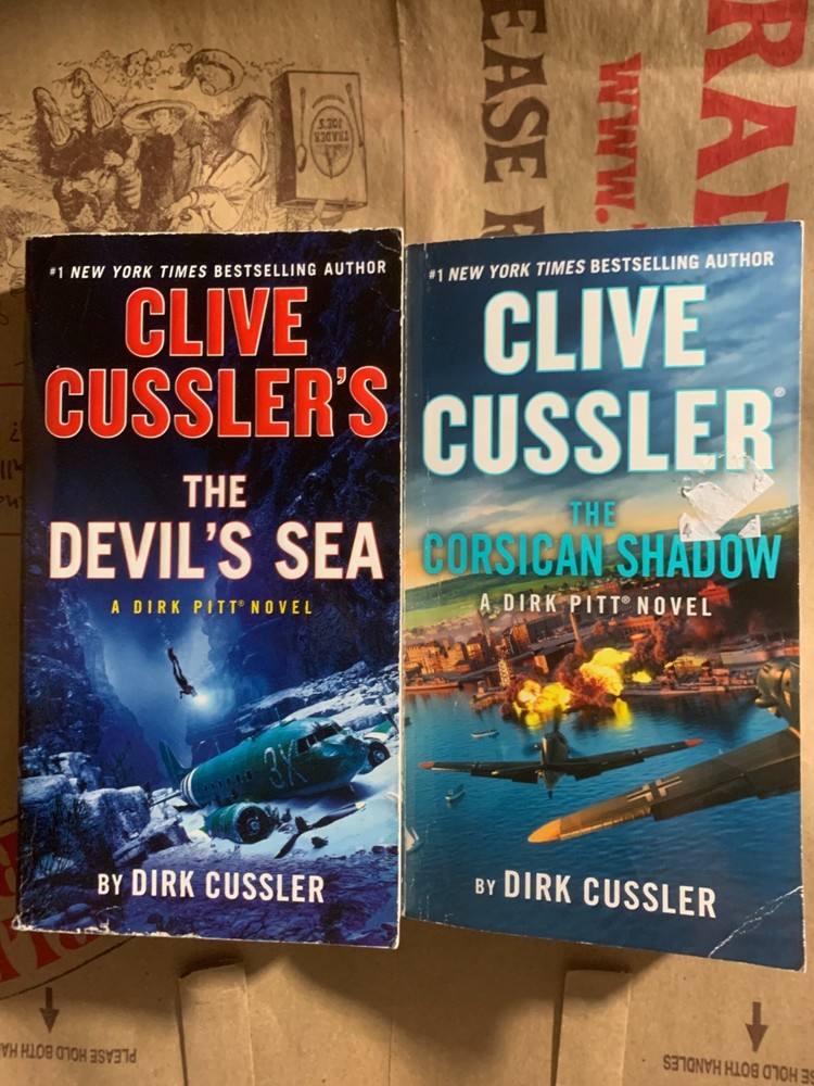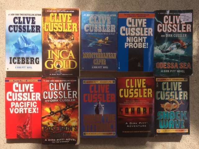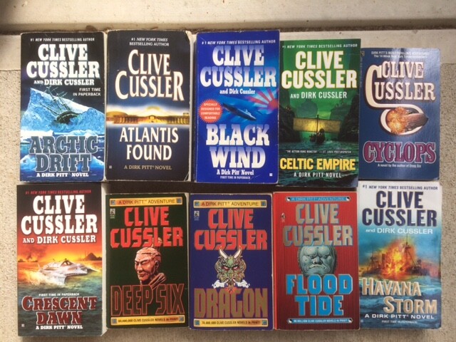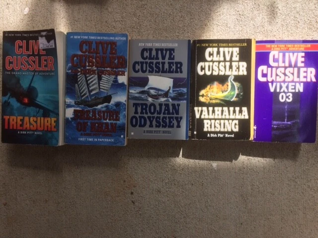 The first 27 novels in the Dirk Pitt series in chronological order: 1. Pacific Vortex 2. The Mediterranean Caper 3. Iceberg 4. Raise the Titanic 5. Vixen 03 6. Night Probe 7. Deep Six 8. Cyclops 9. Treasure 10. Dragon 11. Sahara 12. Inca Gold 13. Shock Wave 14. Flood Tide 15. Atlantis Found 16. Valhalla Rising 17. Trojan Odyssey 18. Black Wind 19. Treasure of Khan 20. Arctic Drift 21. Crescent Dawn 22. Poseidon's Arrow 23. Havana Storm 24. Odessa Sea 25. Celtic Empire 26. Devil's Sea 27. The Corsican Shadow The pictures are just an example. Actual books you get may have different covers. Check out our other Clive Cussler lots.