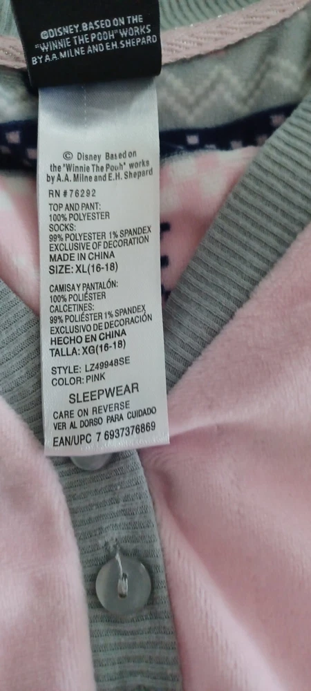 Disney Eeyore Sleepshirt Bust 44" Length 25" Arm Length 27" XL (16-18) Disney character, Eeyore Embroidered Pink Long sleeve V neck Pullover Polyester fleece Machine washable Made in China Whimsy Classic Casual Soft Comfy 111