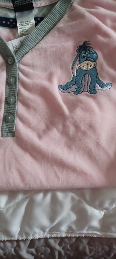 Disney Eeyore Sleepshirt Bust 44" Length 25" Arm Length 27" XL (16-18) Disney character, Eeyore Embroidered Pink Long sleeve V neck Pullover Polyester fleece Machine washable Made in China Whimsy Clas...
