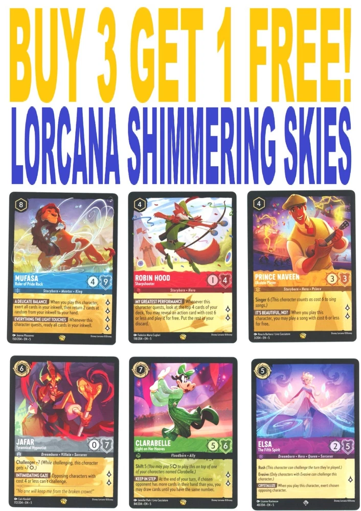 This is a "You Pick/Choose" Listing for Disney Lorcana - Shimmering Skies non-foil cards 1/204 through 204/204. All cards are pack fresh and immediately sleeved. Please ask ANY questions you may have before buying! Thank you! BUY WITH CONFIDENCE - TRUSTED SELLER!!! ***IN ORDER TO TAKE ADVANTAGE OF THE BUY 3 GET 1 FREE DEAL, YOU MUST ADD AT LEAST 4 CARDS TO YOUR CART BEFORE CHECKING OUT***