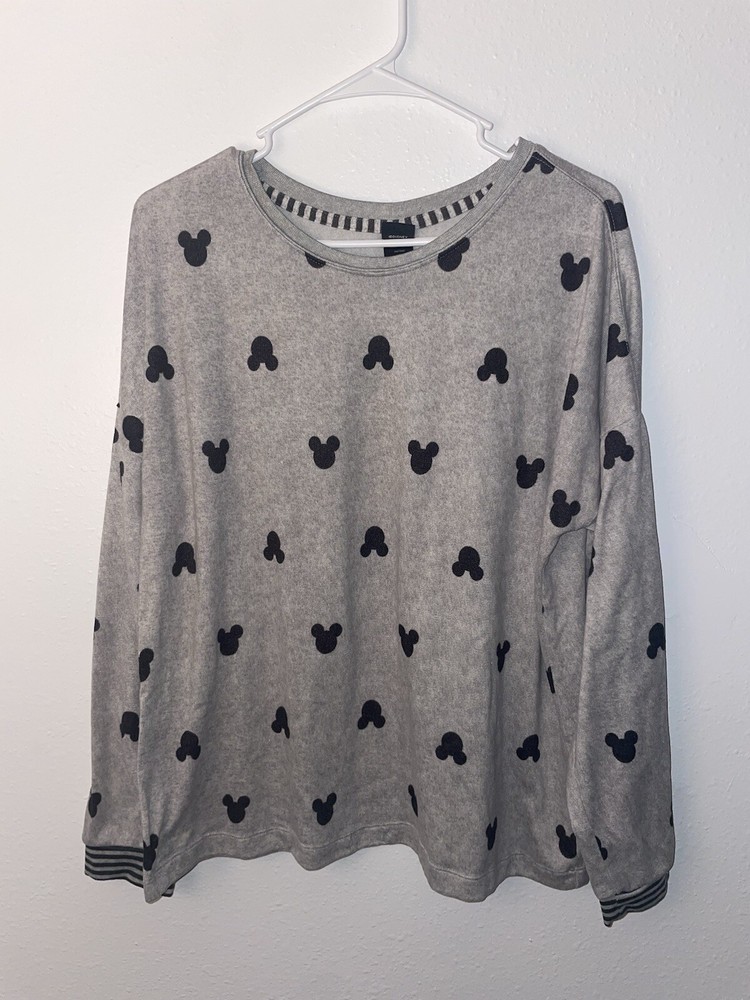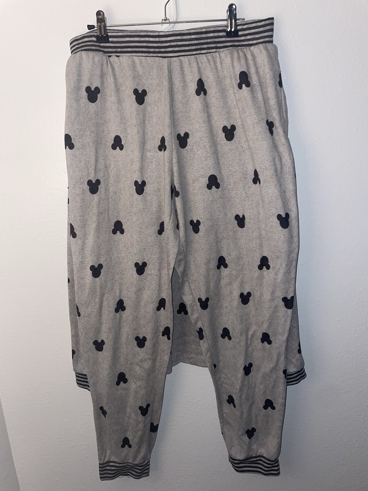 This Disney Ladies 2 Piece Cozy Lounge Pants Pajama Set in size L features a gray color with Mickey Mouse faces. The set includes a pullover top and elastic waist bottoms, both made of a knit fabric blend of polyester and spandex. The top has a round neck and long sleeves, while the bottoms are lightweight and machine washable. Perfect for winter and fall, this pajama set is a comfortable and stylish choice for Disney fans. ✨excellent condition!