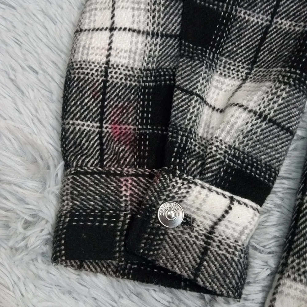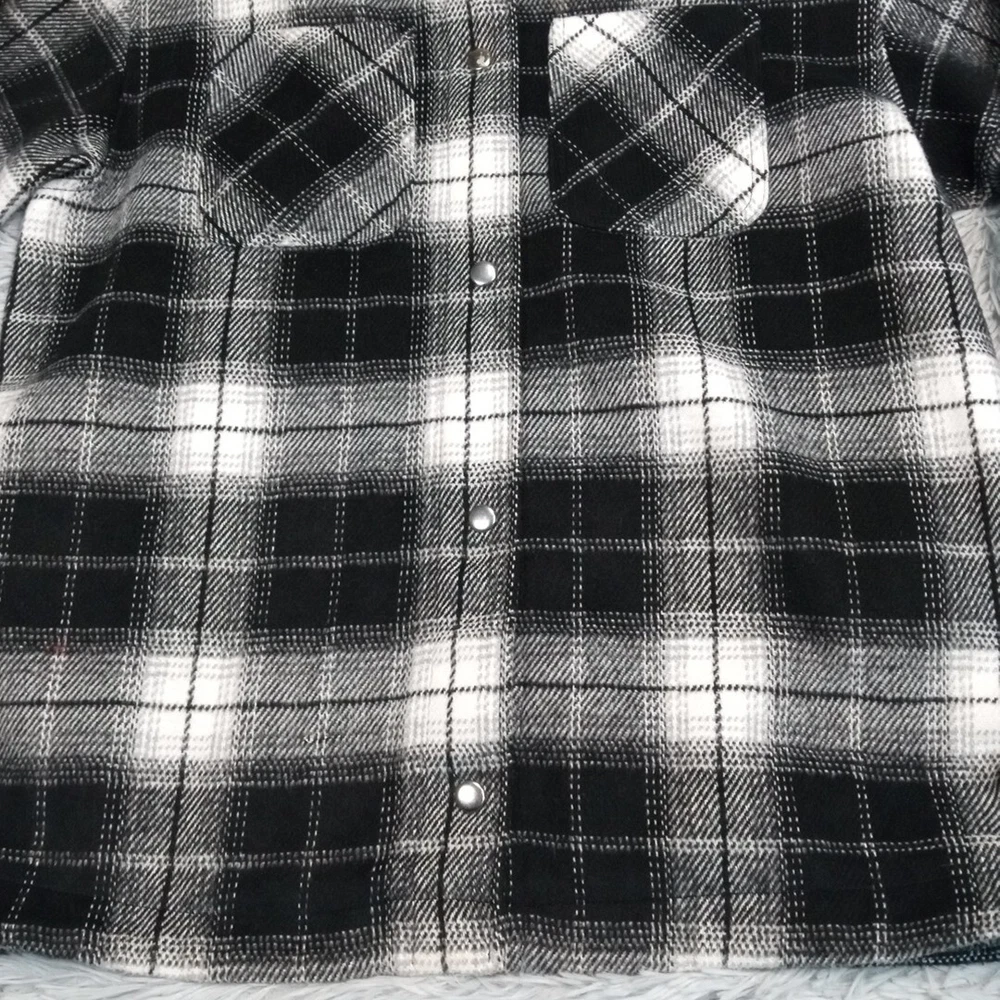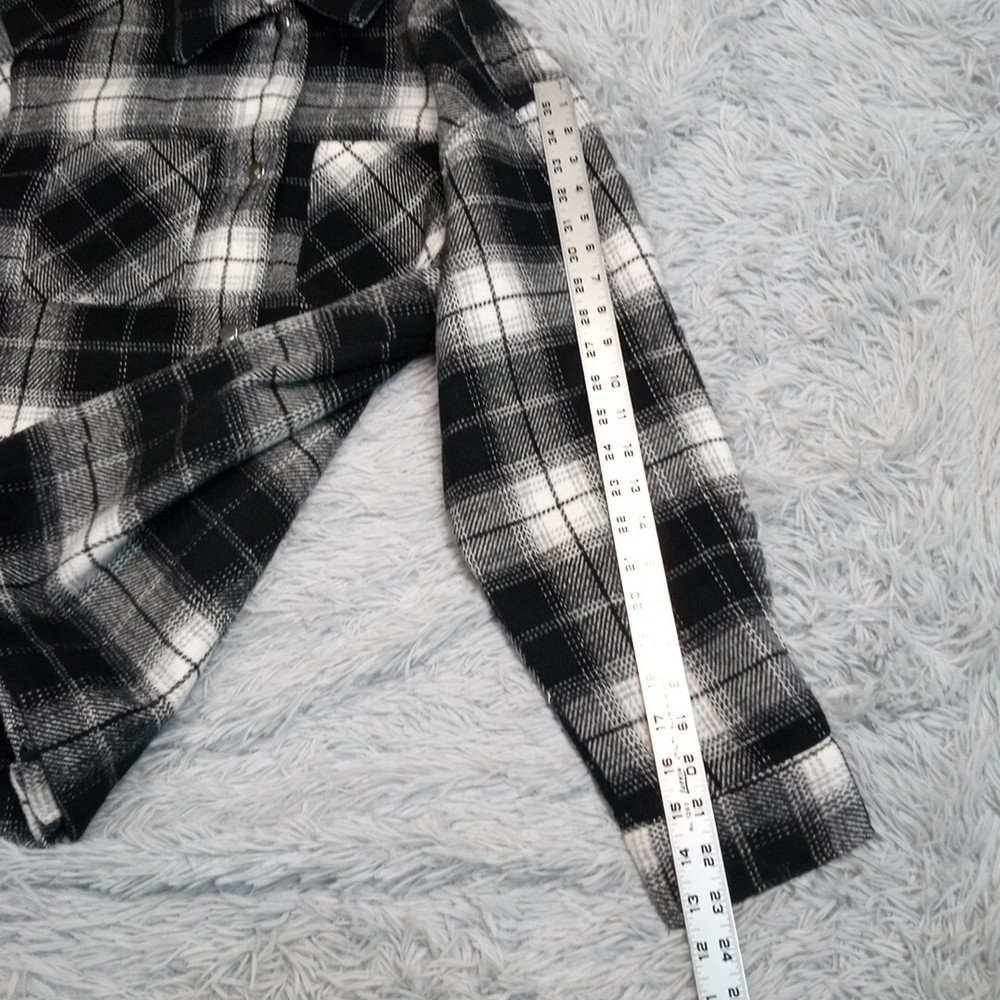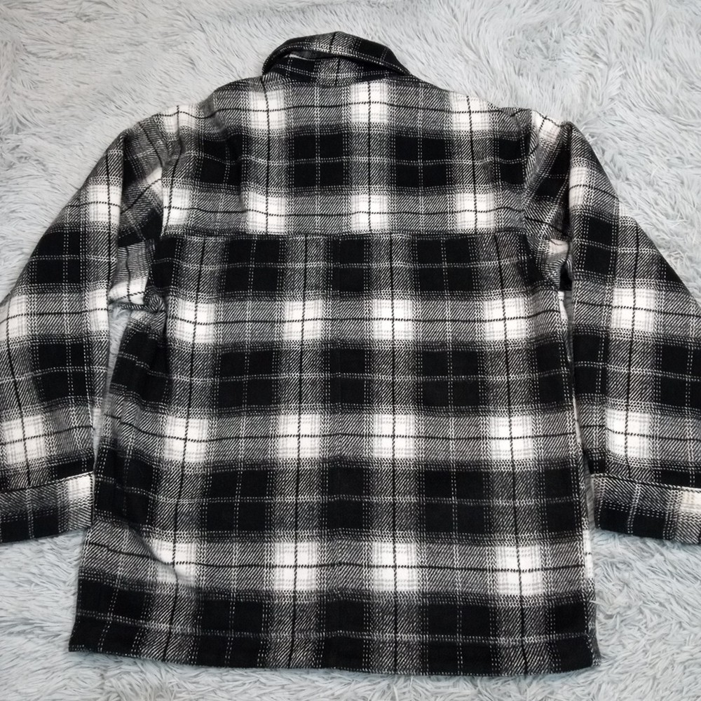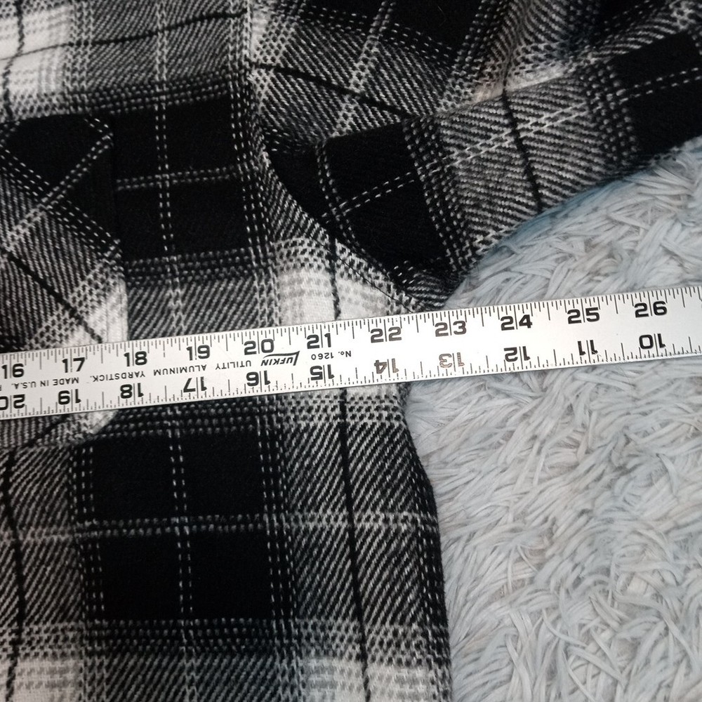 Divided Jacket Womens S Black Plaid Shacket Cozy Comfort Snaps Grunge Punk Chore Good Condition. Spots. Please review photos for measurements and condition. Item will be shipped within one business day. We ship items daily Monday-Friday. * Product color may vary slightly due to photographic lighting or your monitor settings.