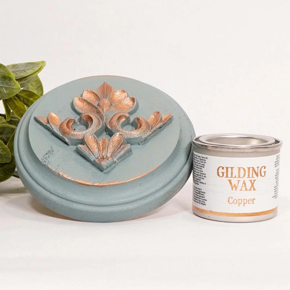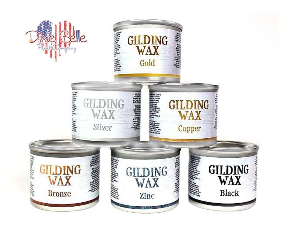 Dixie Belle Gilding Wax - 1.3oz (40ml) Bring a metallic luster to your piece with Dixie Belle Gilding Wax . This oil-based product will radiate across all types of projects and create scintillation on any piece. Use this product on ornate carvings to enhance texture or detail with a metal-like flare. Add a touch of beauty, shimmer and sheen to your painted projects. Each color comes in a 40 ml (1.3 oz) container. You can apply Gilding Wax with your finger, cloth, sponge or brush. Let the Gilding Wax dry for 30 - 60 minutes. Lightly buff after 12 hours to produce a beautiful gilded finish. If the lid is left off and material becomes dry, add a little paint thinner or mineral spirits and mix. Use Gilding Wax in a well ventilated area! Available in six colors: Gold, Copper, Bronze, Black, Silver, Zinc: Gold: Consider this a pot of gold for furniture detail. This colored wax gleams of luxury and is bound to cast a glowing shadow on your projects . After using this product, your masterpiece will surely be deemed "royalty". Copper: A penny for your thoughts? How about a pot full of pennies? Polished and perfected, this copper metallic wax is the perfect addition for your rustic DIYs. Bronze: Define your pieces with this rich metallic brown. This luscious wax is ideal for adding natural and aged perfection to a piece. Black: Accent your pieces with heightened depth or add age using this rich and lavish black wax. Apply to every day furniture for a timeless and elegant feel. Silver: Build on additional shimmer and shine by applying this striking silver to your pieces. Leave your pieces looking refreshed and buffed with this silver metallic wax. This wax will add additional bling to anything Zinc: Cast the essence of the midnight ocean across your piece with this deep and fulfilling color. This color is as rich as the seas but it is shown in waves throughout the black tone. Let the depth of the ocean speak within your piece by using this unique wax. Antique Gold: