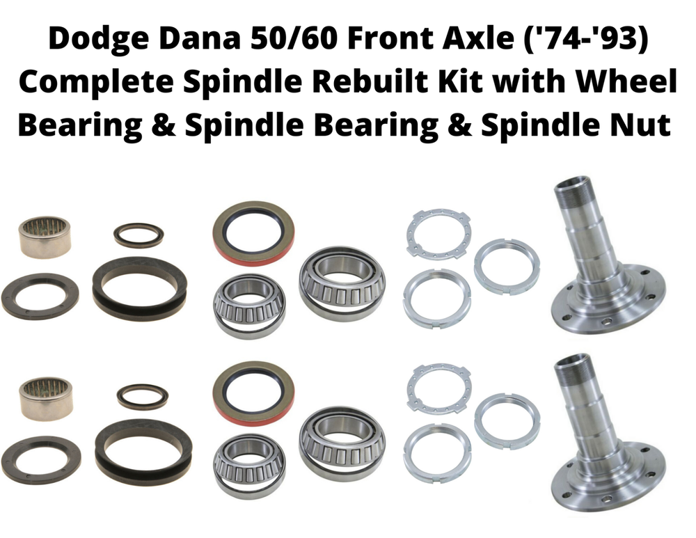 Dodge ('74-'93) DANA 60 Front Axle Complete Spindle Rebuilt Kit (Wheel bearing, Spindle Bearing, Spindle Nut, D60 Spindle Fits 1974-1993 Dodge with Dana 60 Front 7.5" tall 7.00" flange 6 bolt holes 2.255" and 2.020" bearing journals Compatible with Differentials: Dana 60 Front, Disconnect Design, 1998 and older Dana 60 Front, Standard Rotation - 30 Spline Dana 60 Front, Standard Rotation - 35 Spline Includes: Inner Wheel Bearings/Races Outer Wheel Bearings/Race Inner Wheel Seal Spindle Bearing Kit w/ Seals