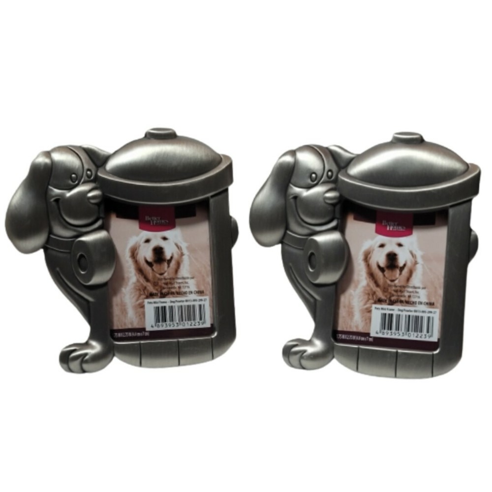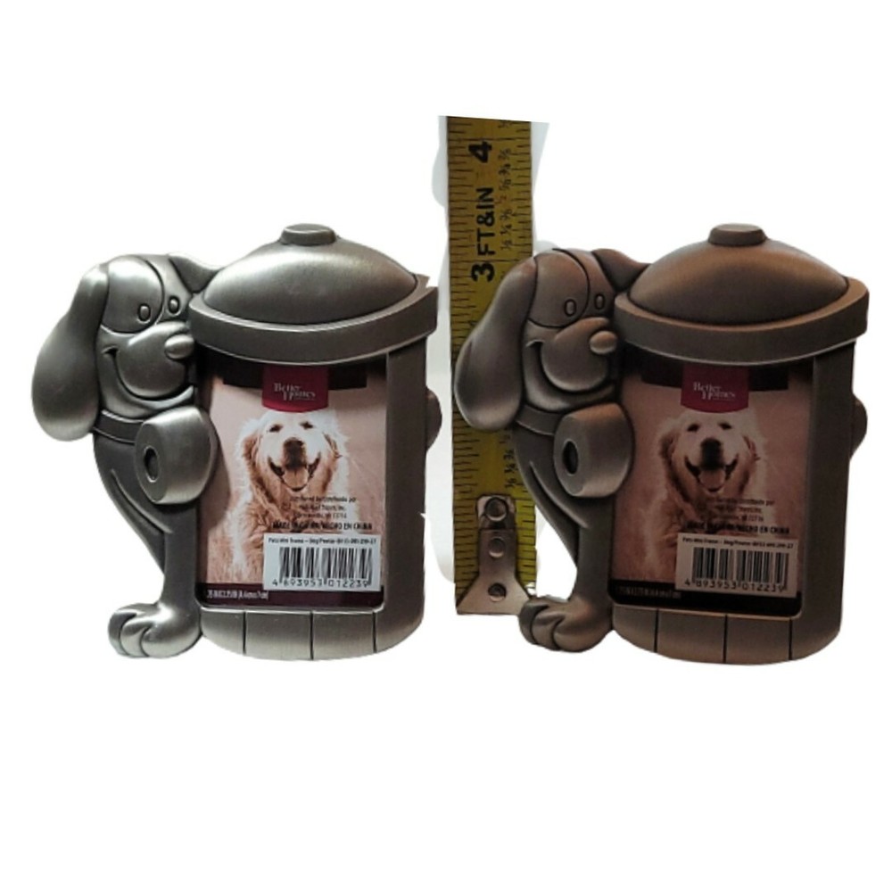 This set of two mini picture frames from Better Homes and Garden features a charming design of a dog and a fire hydrant. The frames are made of pewter and are approximately 3.5 inches in length, 5.4 inches in height, and 3 inches in width. They are perfect for displaying one small photo each and will add a touch of whimsy to any room. The frames are in excellent shape and have a pewter finish. They are ideal for collectors of antique or decorative items.