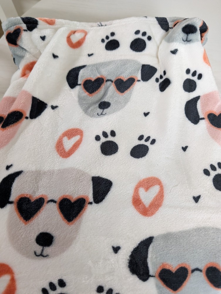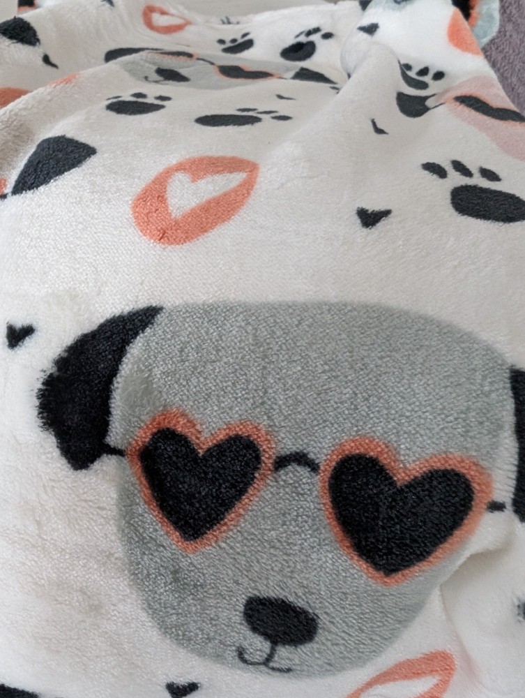 Adorable! Plush super soft blanket with dogs wearing sunglasses and hearts....