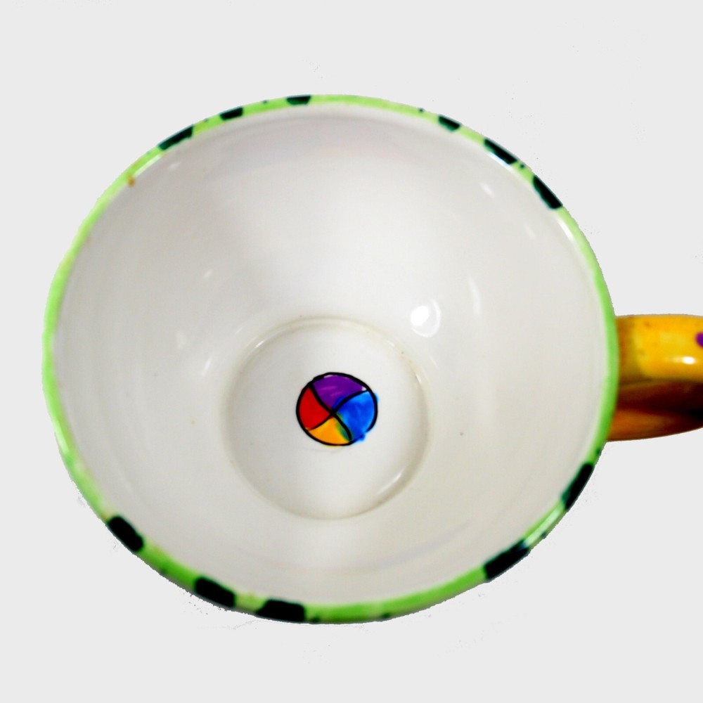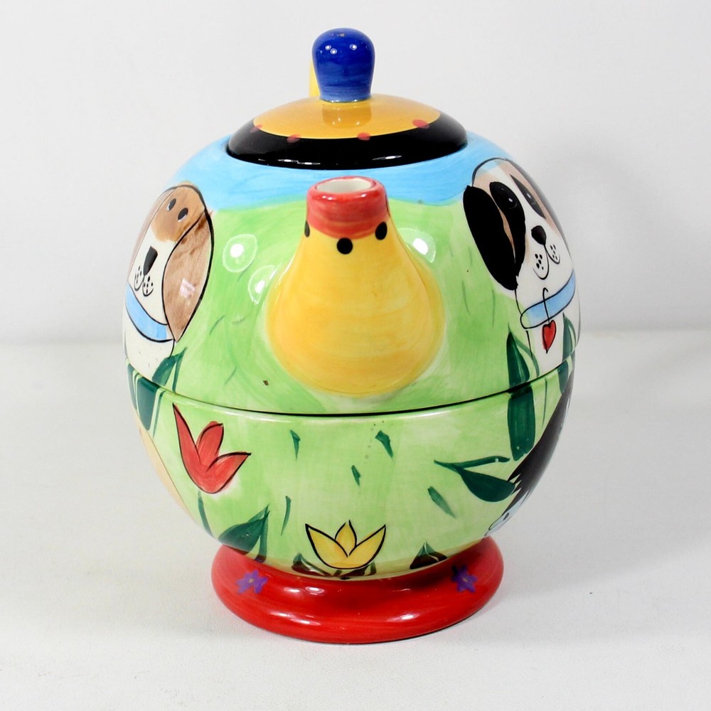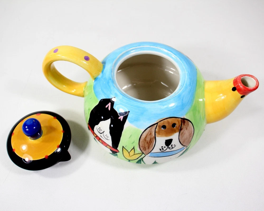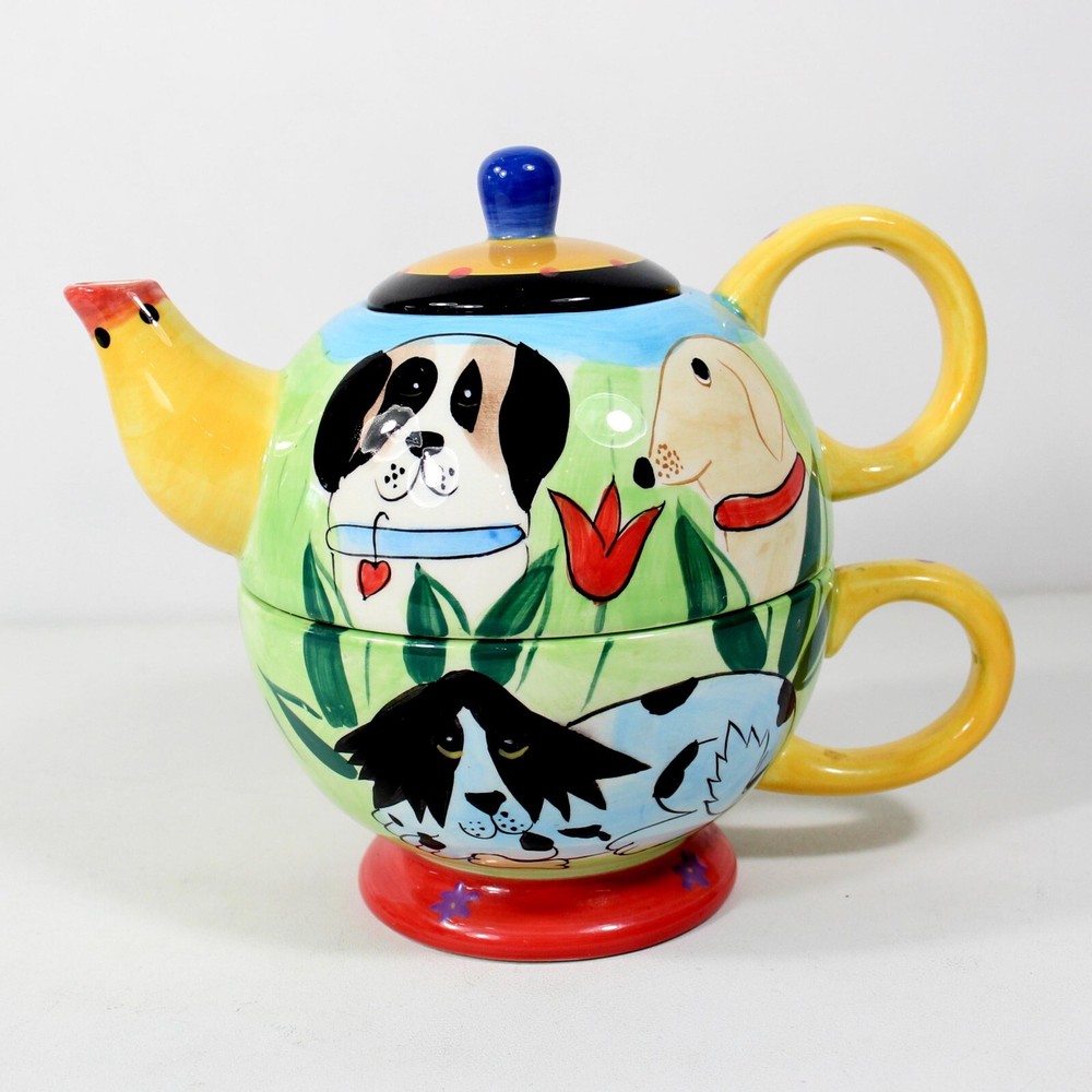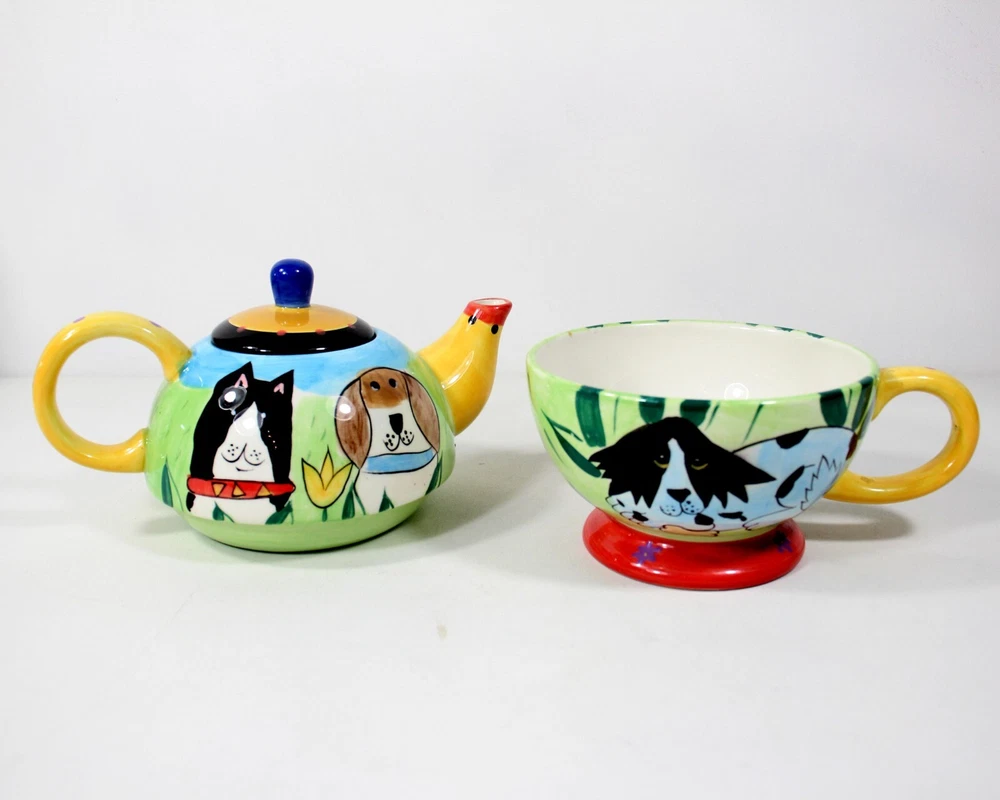 This fun and whimsical Dogzilla tea pot with cup set is colorfully handpainted by Candace Reiter Designs Henniksen Imports. Cup is 5" diameter. Pot and cup are 6" tall. It has never been used and is in excellent condition.
