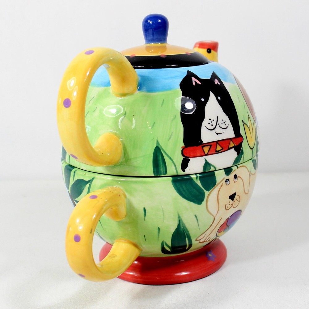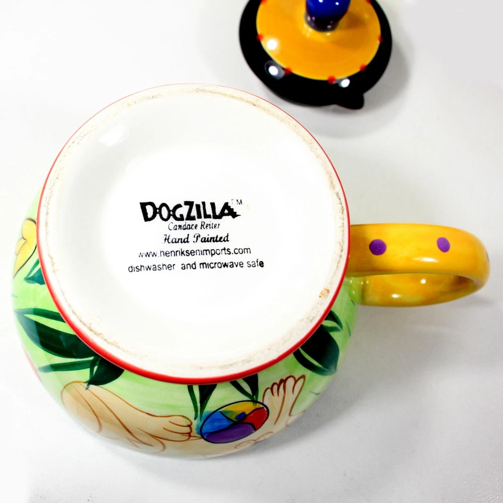 This fun and whimsical Dogzilla tea pot with cup set is colorfully handpainted by Candace Reiter Designs Henniksen Imports. Cup is 5" diameter. Pot and cup are 6" tall. It has never been used and is i...