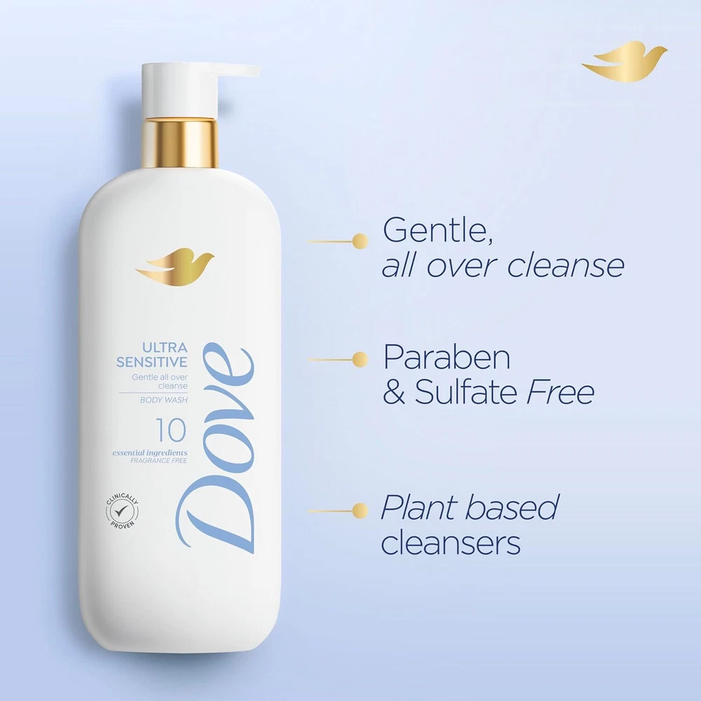 MADE FOR SENSITIVE SKIN: Gentle all over cleanse for even the most sensitive skin CAREFULLY FORMULATED: Carefully formulated with only 10 essential ingredients and is fragrance free GEL, SERUM WASH: this gel body wash transforms into bubbly lather to gently cleanse and give sensitive skin a little extra love CLINICALLY PROVEN INGREDIENTS: Co-created with dermatologists and beauty experts EXPERT CARE: From the #1 dermatologist recommended body wash brand Dove Ultra Sensitive Body Wash is carefully formulated with only 10 essential ingredients and is fragrance free to gently cleanse even the most sensitive skin. This gel body wash transforms into bubbly lather to gently cleanse and care for sensitive skin. Has your skin been missing out? New Dove Serum Shower Collection is infused with active skin care ingredients to supercharge your body care routine. Quench thirsty skin with hydrating serum + hyaluronic acid, help prevent acne with acne clearing salicylic acid treatment, or recharge skin’s glow with brightening serum + vitamin C. Dove teamed up with leading dermatologists and beauty experts to create a new shower collection that brings expert skin care into your shower. Infused with the ingredients you already love using on your face (hello, hyaluronic acid!), these body washes, scrubs and beauty bars care were created for your unique needs. Because we think beautiful, visibly healthy skin is a head-to-toe kind of thing. Dove is the #1 Dermatologist recommended body wash brand. This cleanser is made with naturally-derived gentle skin cleansers, no sulfates or parabens and is PETA-certified vegan.