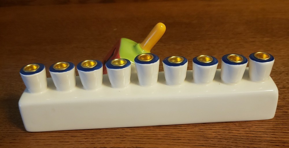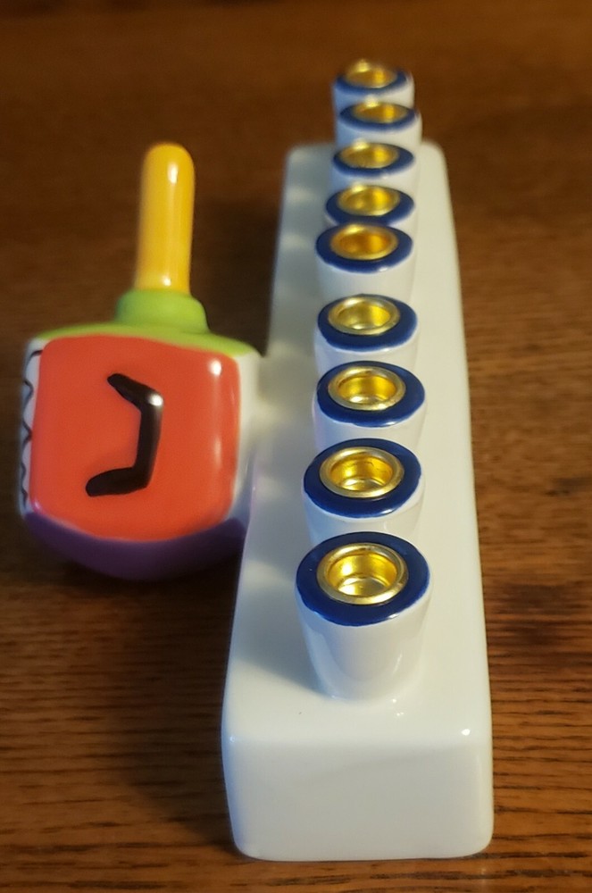 This is a whimsical Menorah by David Heger. It is 7 1/2" long, 3 1/2" deep and 3 1/2" tall. It is in very good condition with no chips or cracks....