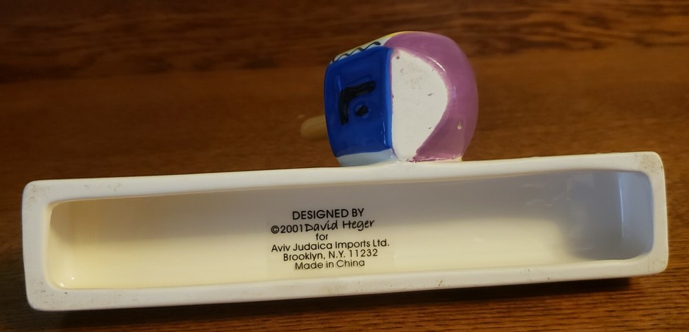This is a whimsical Menorah by David Heger. It is 7 1/2" long, 3 1/2" deep and 3 1/2" tall. It is in very good condition with no chips or cracks.