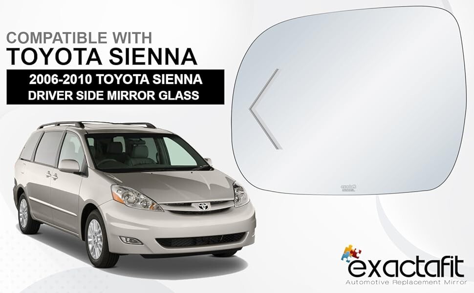 This exact-fit side mirror glass is a game-changer for my 2008 Sienna! The installation was effortless—no modifications needed—and the quality is impressive. The chrome finish cuts glare perfectly, and the laser-etched branding adds a premium touch. Saved me money by replacing just the glass instead of the whole assembly. Fits like OEM, looks great, and feels sturdy. Highly recommend for a quick, affordable fix!