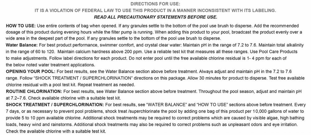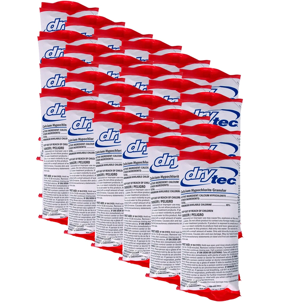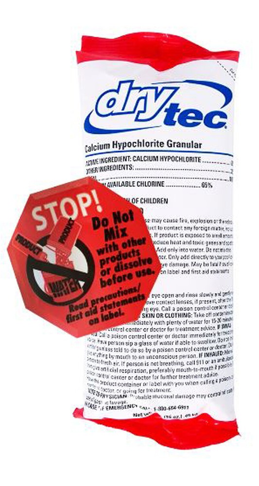 Dry Tec 68% Calcium Hypochlorite Granular Swimming Pool Shock - Choose Quantity Our Dry Tec 68% Calcium Hypochlorite formula works similarly to Sock-It, however, Dry Tec does not run the risk of bleaching vinyl pool liners. This allows for the shock to be evenly broadcast over your pool's surface. Note: DO NOT MIX! 1 bag (1-pound each) Fast-Acting Quick-Dissolving Swimming Pool Sanitizer Kills bacteria, controls algae and destroys organic contaminants in pools 68% calcium hypochlorite Recommended Dosage: 1 pound per 10,000 gallons of water HOW TO USE: Use entire contents of the bag when opened. If any granules settle to the bottom of the pool use brush to disperse. Add the recommended dosage of this product during evening hours while the filter pump is running. When adding this product to your pool, broadcast the product evenly over a wide area in the deepest part of the pool. If any granules settle to the bottom of the pool use brush to disperse. WATER BALANCE: For best product performance, swimmer comfort, and crystal clear water: Maintain pH in the range of 7.2 to 7.6. Maintain total alkalinity in the range of 60 to 120 parts per million (ppm). Maintain calcium hardness above 200 ppm. Use a reliable test kit that measures all these ranges. Use our pool care products to make adjustments. Follow label directions for each product. Do not enter the pool until the free available chlorine residual is 1-4 ppm for each of the below noted water treatment applications. OPENING YOUR POOL: For best results, see the “WATER BALANCE” section above before treatment. Always adjust and maintain pH in the 7.2 to 7.6 range. Follow “SHOCK TREATMENT” directions on this package. Allow 30 minutes for the product to disperse. Test free available chlorine residual with a pool test kit. Repeat treatment as needed. ROUTINE CHLORINATION : For best results, see the “WATER BALANCE” section above before treatment. Throughout the pool season, adjust and maintain pH at 7.2 to 7.6. check available chlorine with a suitable test kit. SHOCK TREATMENT/SUPERCHLORINATION: For best results, see “WATER BALANCE” and “HOW TO USE” section above before treatment. Every 7 days, or as necessary to prevent pool problems, shock treat/superchlorinate the pool by adding one bag of this product per 10,000 gallons of water to provide 5 to 10 ppm available chlorine. Additional shock treatments may be required to correct problems that are caused by visible algae, high bathing loads, heavy wind and rainstorms. Additional shock treatments may also be required to correct problems such as unpleasant odors and eye irritation. Check the available chlorine with a suitable test kit. STORAGE AND DISPOSAL: Keep this product dry in its tightly closed container when not in use. Store in a cool, dry, well-ventilated area. Keep away from heat or open flame. Nonrefillable container. Do not reuse or refill this container. Rinse empty container thoroughly with water to dissolve all material prior to disposal. Offer for recycling if available. Do not contaminate food or feed by storage or disposal or cleaning of equipment.