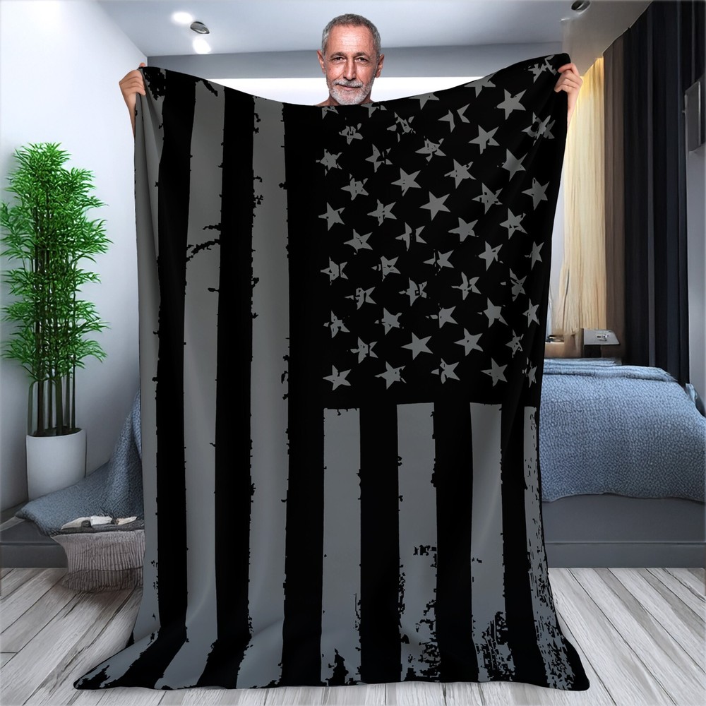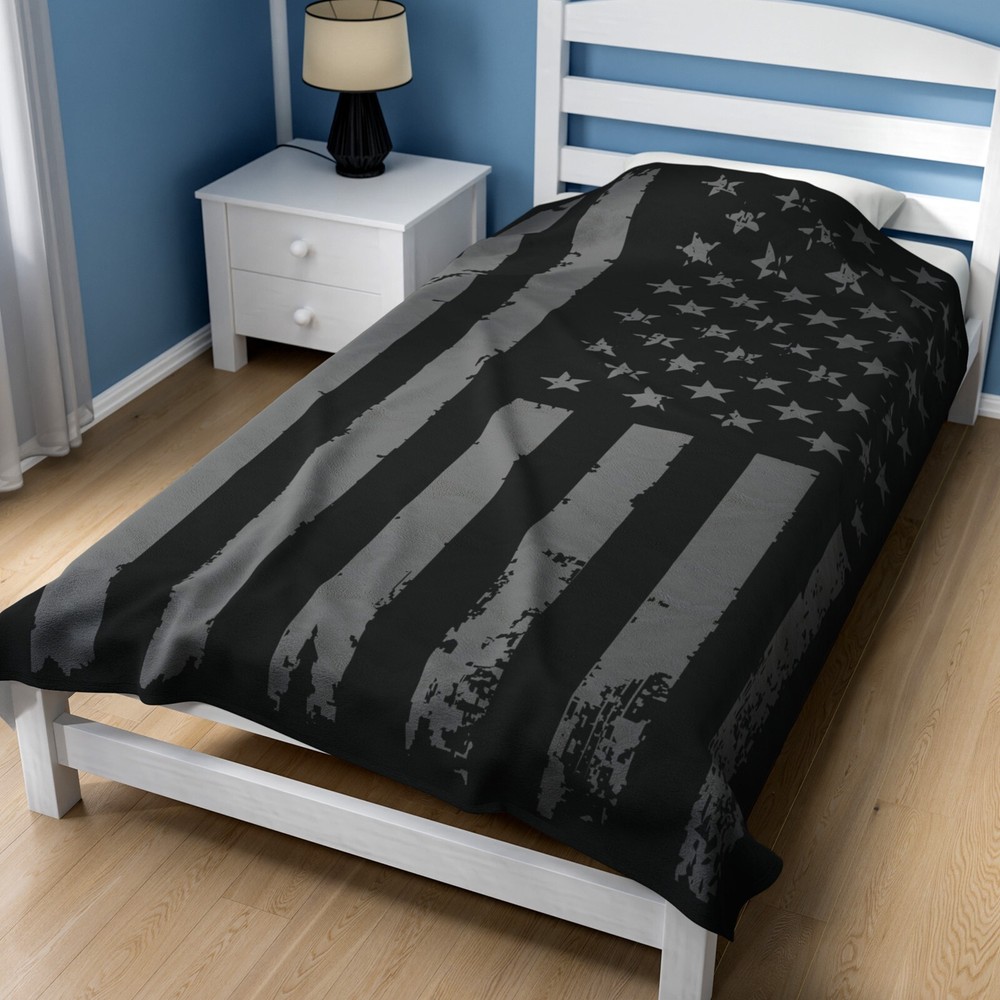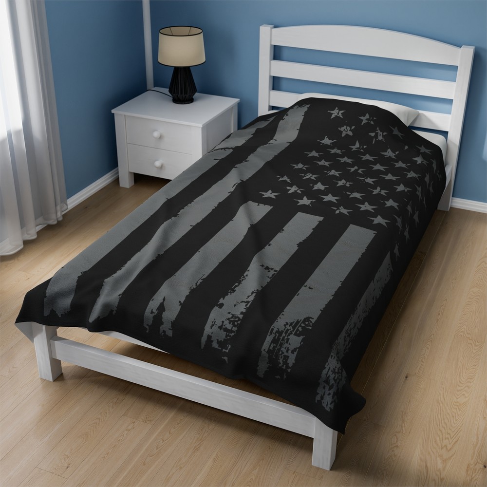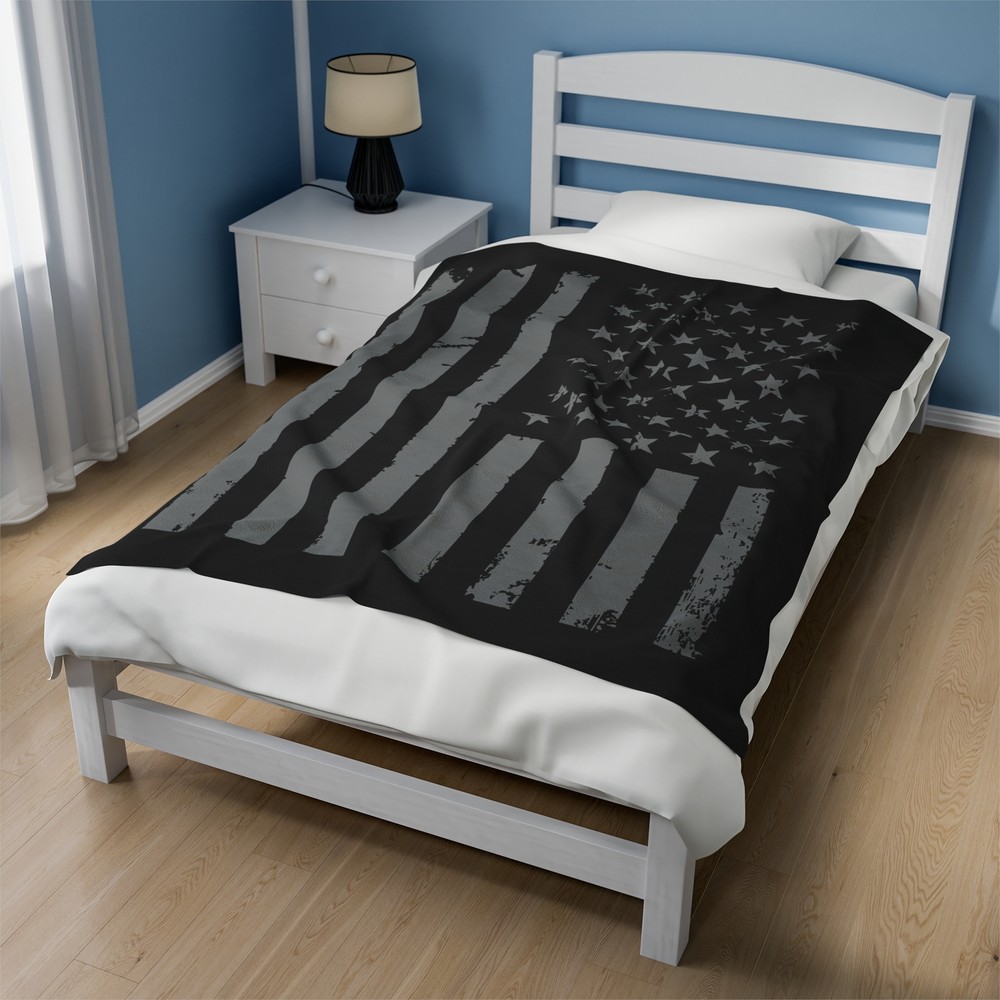 Wrap yourself in patriotism with the Duotone US Flag Blanket. Featuring a bold and modern take on the American flag in a sleek duotone design, this plush blanket combines style and comfort. Perfect for cozy nights, this versatile blanket makes a statement in your living room, bedroom, or during outdoor gatherings. Show your love for America in a unique, contemporary way while staying warm and stylish. Velveteen Plush Blanket ✔Available in 100% polyester (SPOKE) or 83% Polyester and 17% Spandex ✔Medium heavy-weight fabric (8.85 oz/yd² (300 g/m²)) that feels extra soft to the touch (thickness of the fabric may slightly vary) ✔Due to variations in the production process, blankets may arrive up to 3" shorter than their listed size ✔Quick production, just 2-7 business days ✔Made on demand, no minimum order requirements SHIPPING ✔Domestic Standard Shipping: Ready to ship post-production, shipping times are estimates and not guaranteed, excluding production time