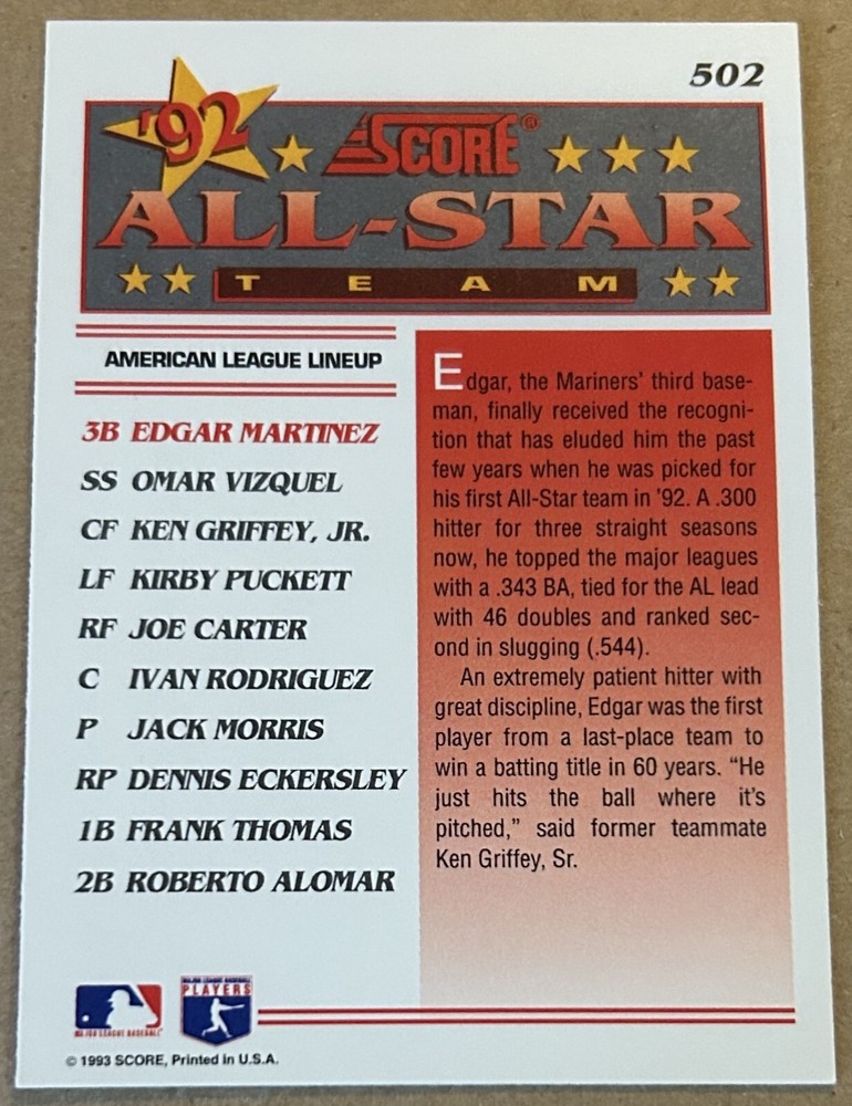 You are viewing a 1993 SCORE '92 ALL-STAR Card #502, EDGAR MARTINEZ, HOF, Card is NM-MT Condition, Please view my scans, Thanks For Looking, FREE S&H...