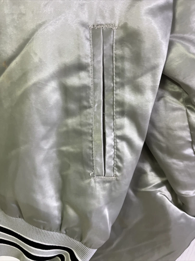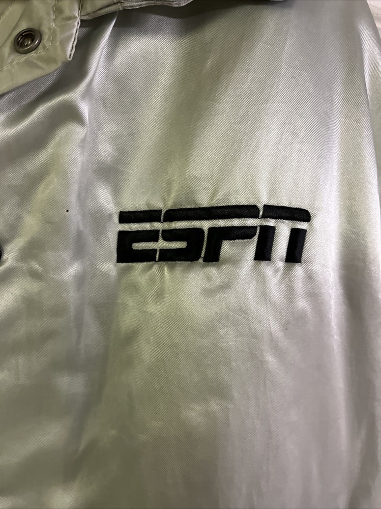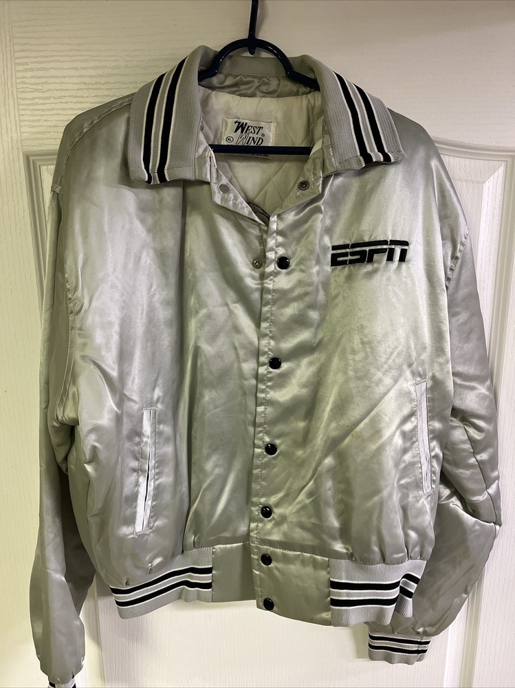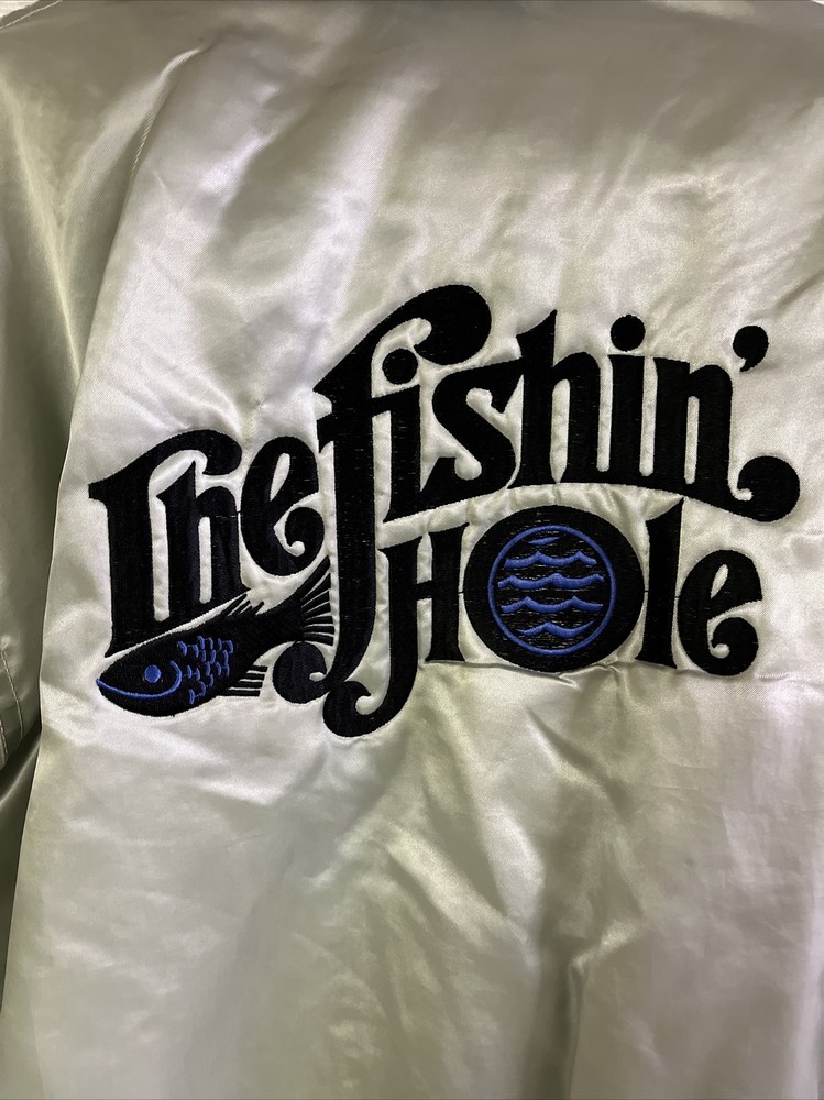 This vintage satin jacket from West Wind is a must-have for any fishing enthusiast. Made in the USA, the jacket features an embroidered logo and the words "ESPN The Fishin' Hole" on the back, paying homage to the iconic TV show. The jacket is made of nylon and lined with polyester, making it lightweight and perfect for all seasons. It has a button closure, a collar, and is accented with the West Wind Tailored By Buccaneer model label. The silver color and solid pattern make it suitable for both casual and workwear occasions. The jacket is sized XL and has features such as insulation material made of polyester, suitable for winter, summer, fall, and spring. The theme of fishing is apparent, making it ideal for any fishing excursion. This jacket is a unique item from the Clothing, Shoes & Accessories, Men, Men's Clothing, Coats, Jackets & Vests category on eBay.