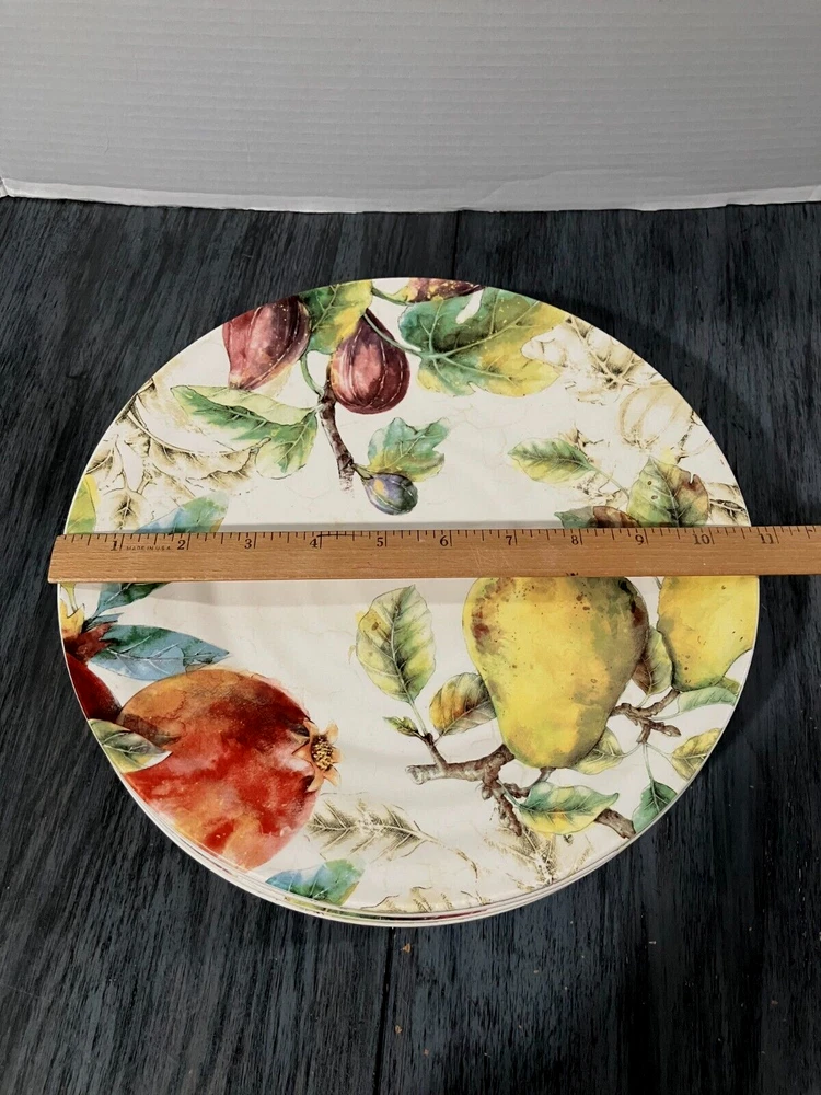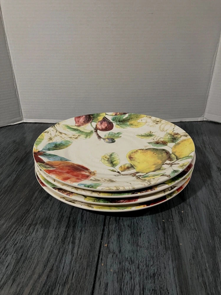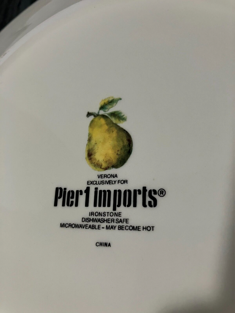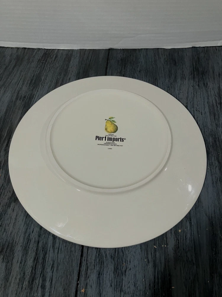 Here is a beautiful 4 - piece ( EUC) PIER 1 IMPORTS ** Verona ** Ironstone Dinner Plate set. Very colorful Assorted Fruit theme!! Very pretty Approx 10.75" diameter. Like new from a smoke-free home - Enjoy - Just a very nice set, very light signs of use. Dishwasher safe........ Pier 1 product lines are very charming and made to last. Please look at all photos and ask questions if needed. No returns