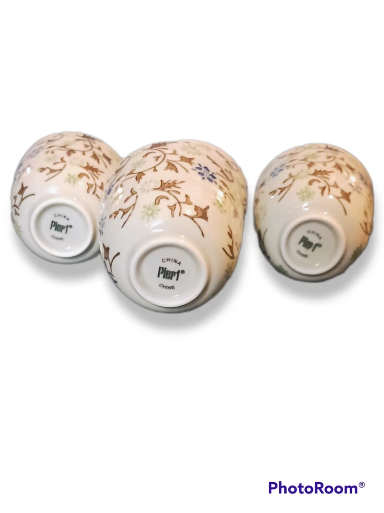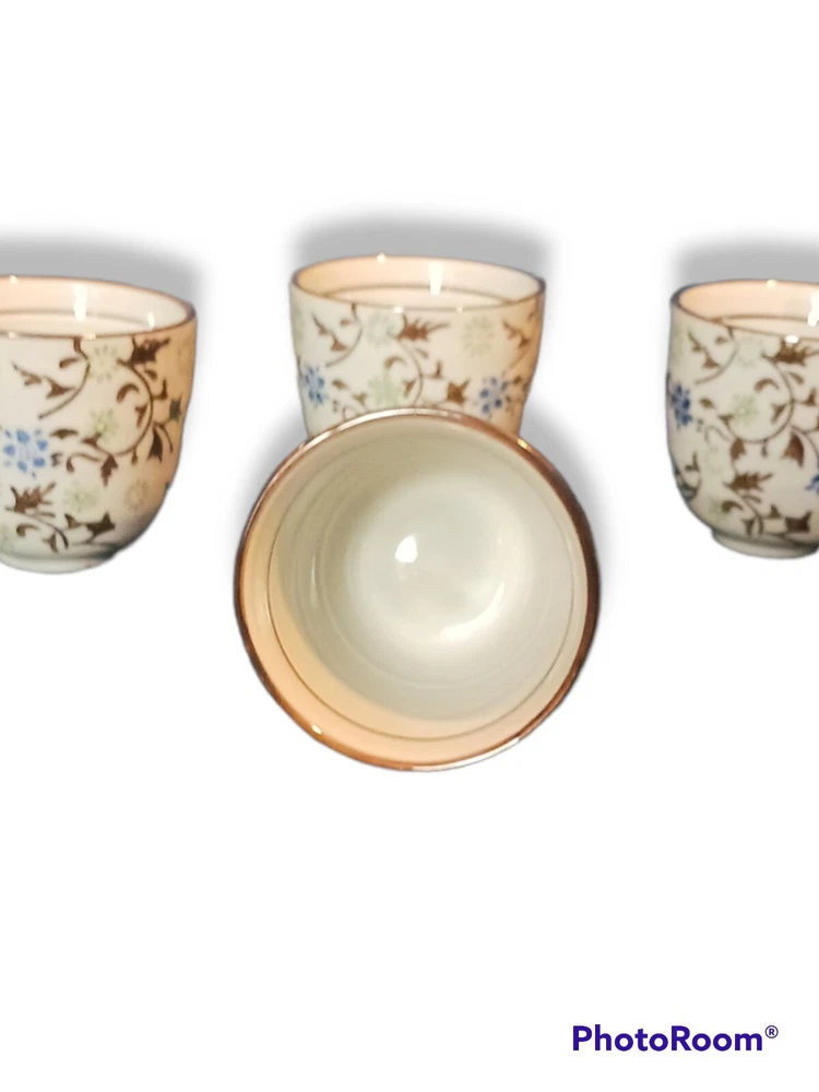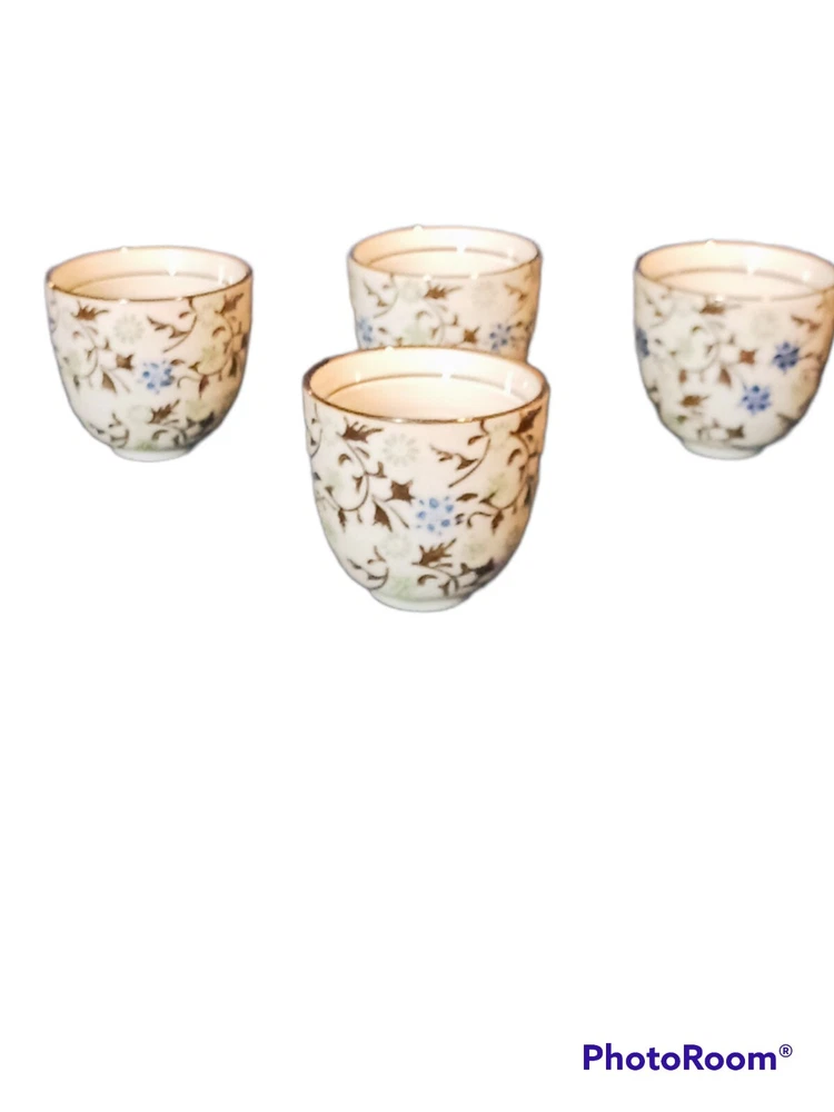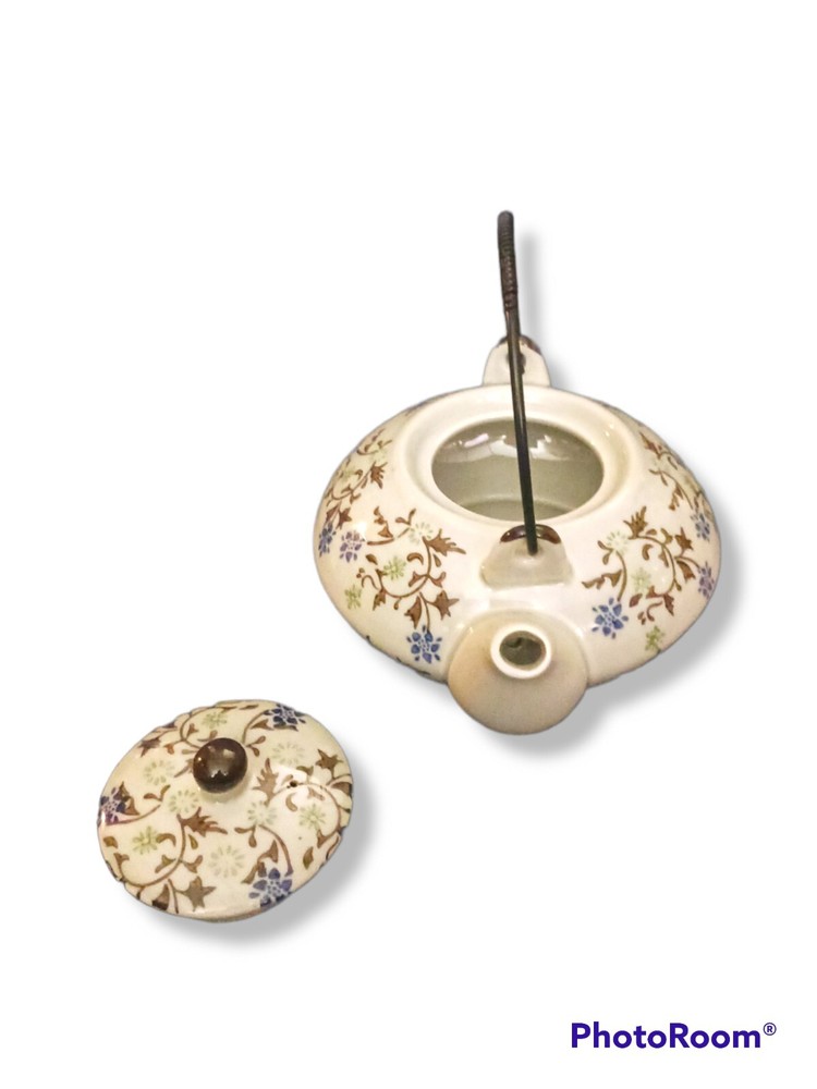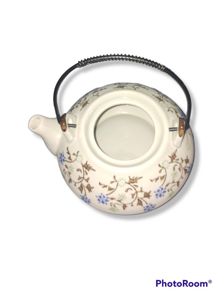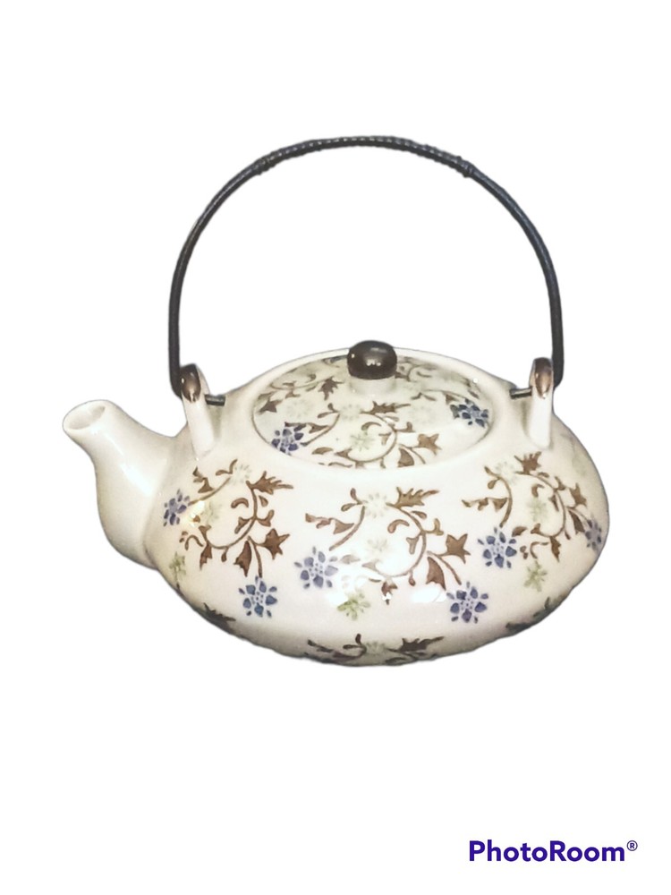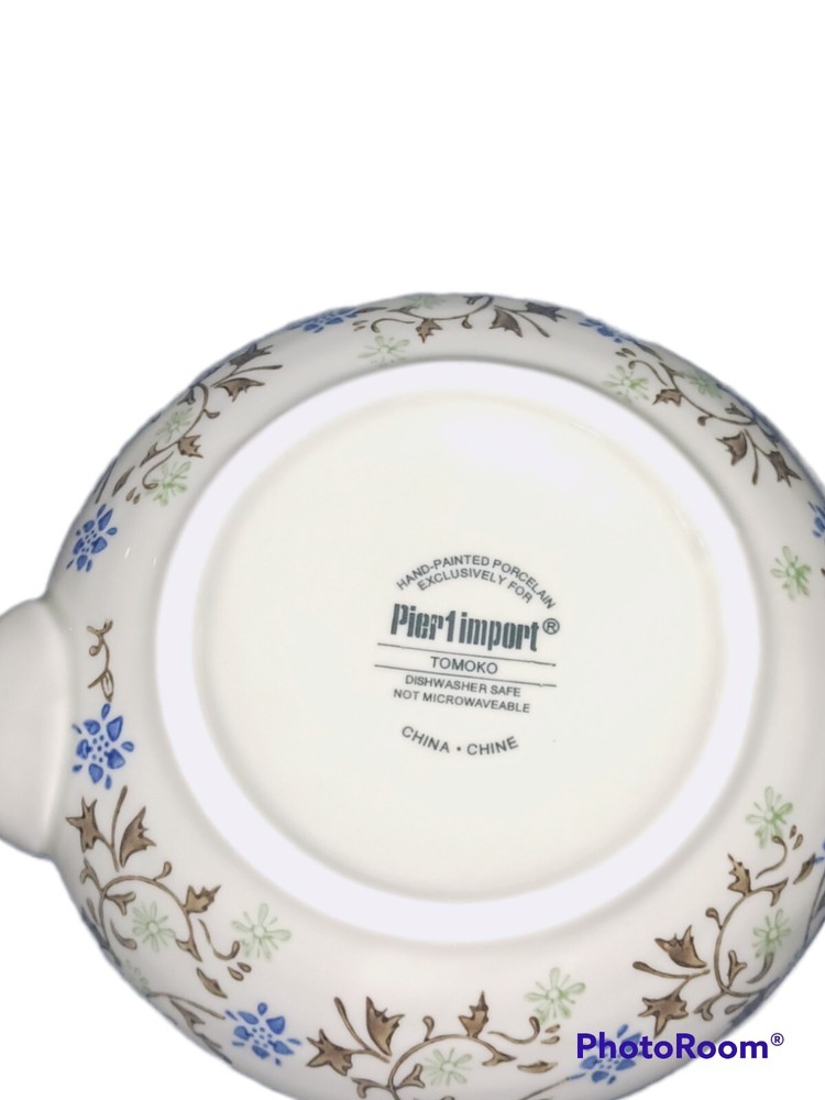 Tea set: - Tomoko - Teapot with lid and metal coil handle - 16 oz 2 serving teapot 7.5 in W x 3.5 i. H X 3 in D - (4) 4 oz Saki Cups - Pier1 - Porcelain pottery - Blue and green hand painted flowers and leaves - Made in China - Dishwasher safe. Not safe for microwave - Excellent mint condition. Never used, for decor only. No damage, stains, chips, cracks, etc. - Free shipping. Shipped via USPS within 24 hours of payment. Insurance and tracking included