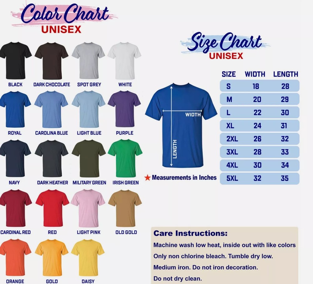 INFOR - High-quality T-shirt - 100% Cotton (fiber content may vary for different colors) - Medium fabric (5.3 oz/yd² (180 g/m²)) - Classic fit - Tear away label - Runs true to size CARE INSTRUCTIONS - Machine wash in cold water - Do not use bleach - Tumble dry low - Iron on low heat with shirt inside-out - Never iron directly over design RETURN POLICY - Our t-shirts are printed on demand, please choose the right size for you before payment. We cannot accept returns of incorrect t-shirt sizes - If you not satisfied with our product and services please do not leave negative/neutral feedback before give us an opportunity to resolve the problem first. - If for any reason you are unsatisfied with the item you purchase (damage or not as described), please contact us so we can talk about the options, simply return your order to us and we will either send a replacement or refund your money (exclude shipping rate). SHIPPING AND HANDLING - The items will shipped within 3 to 5 days after payment received. Shipping times for USA Address it takes 3 - 7 business days for shipment by UPS or USPS NOTE: As different computers display colors differently, the color of the actual item may vary slightly from the above images.