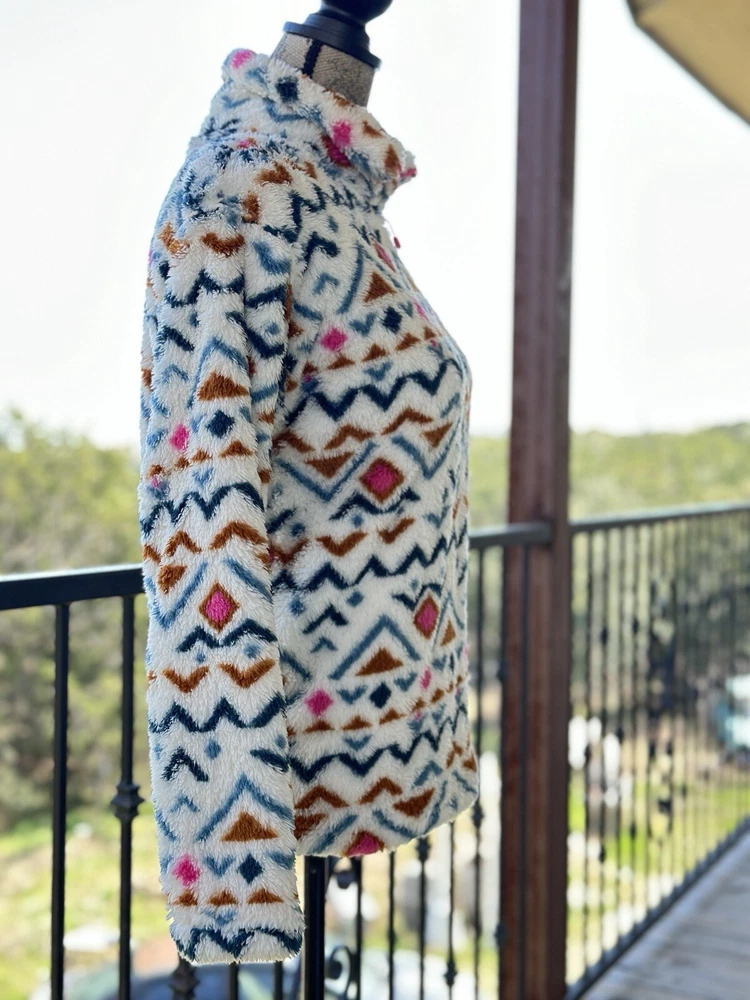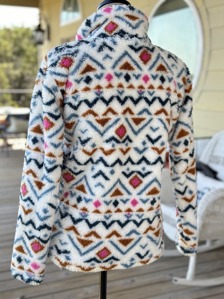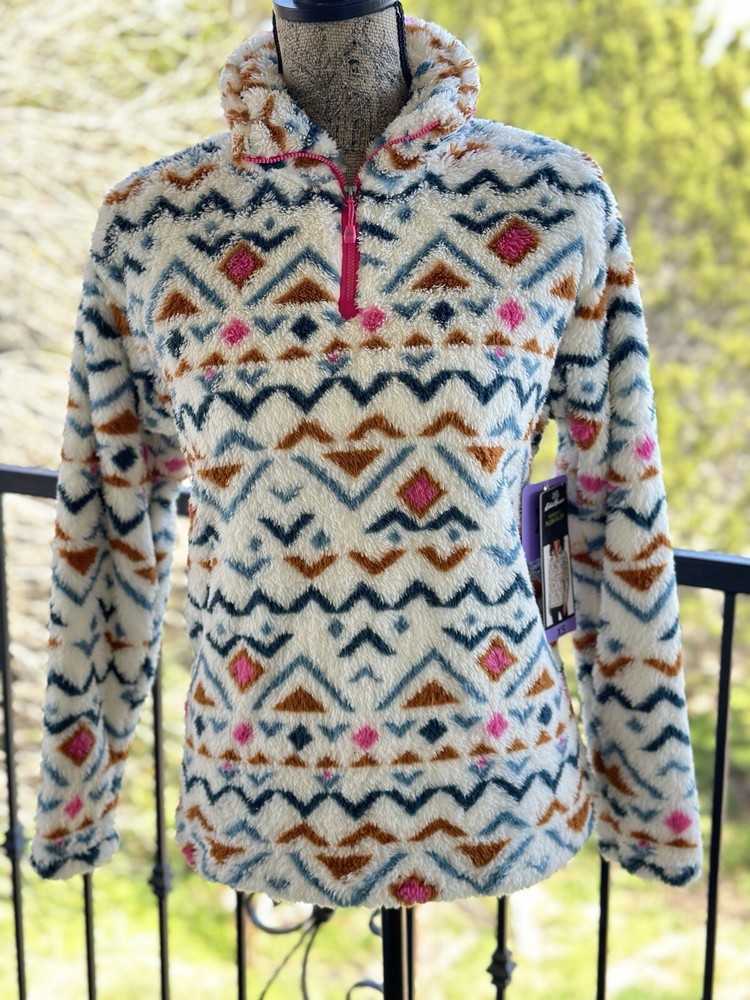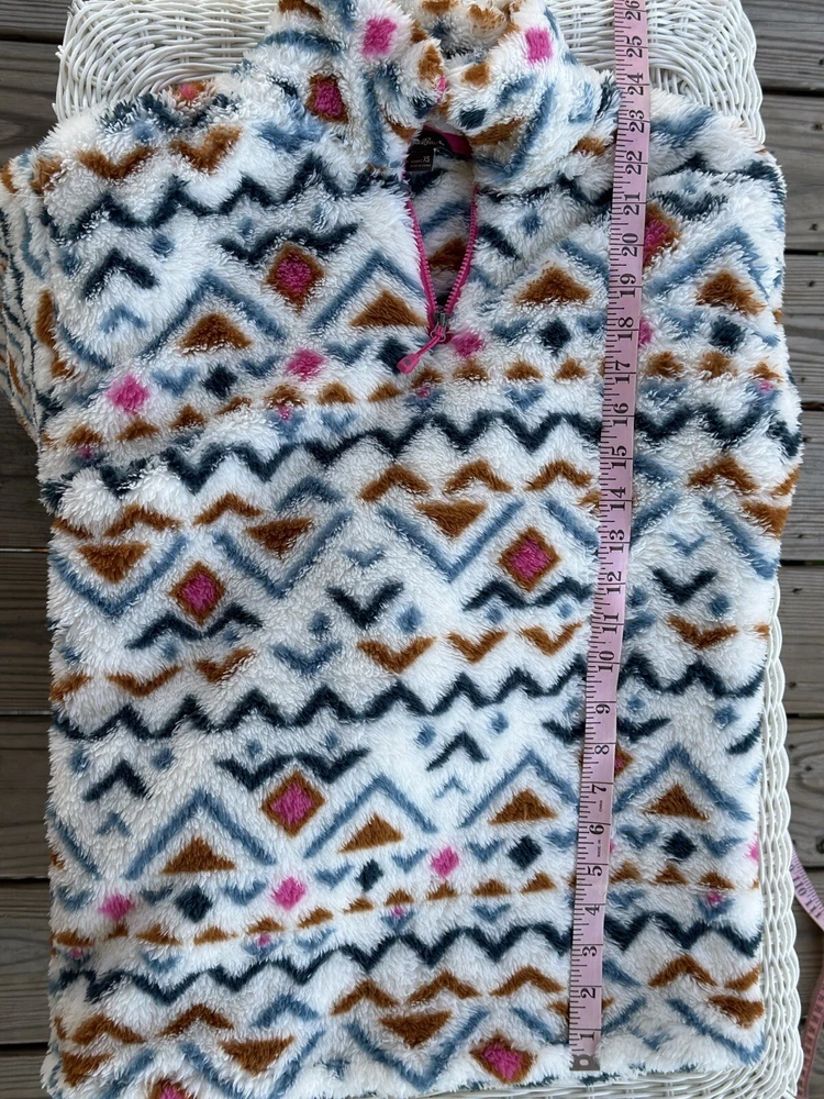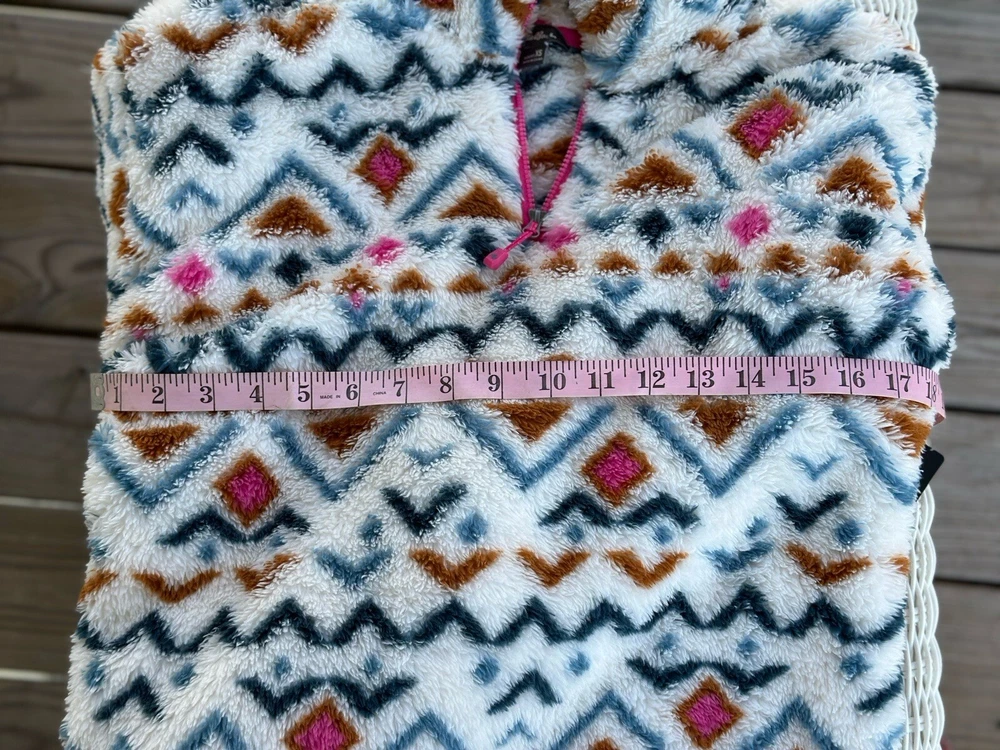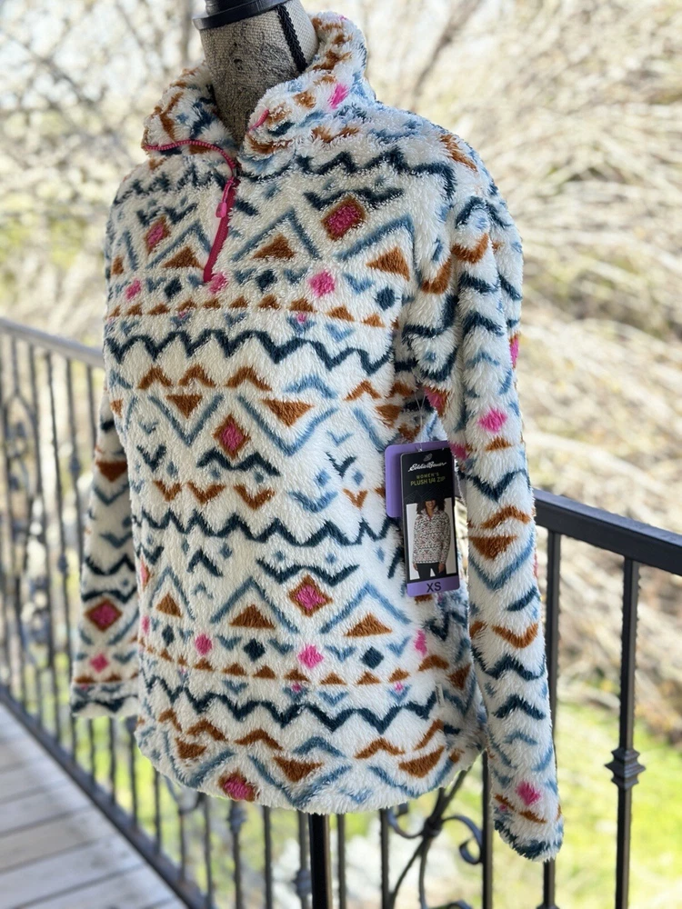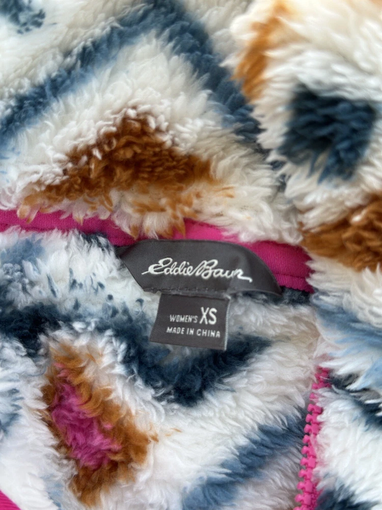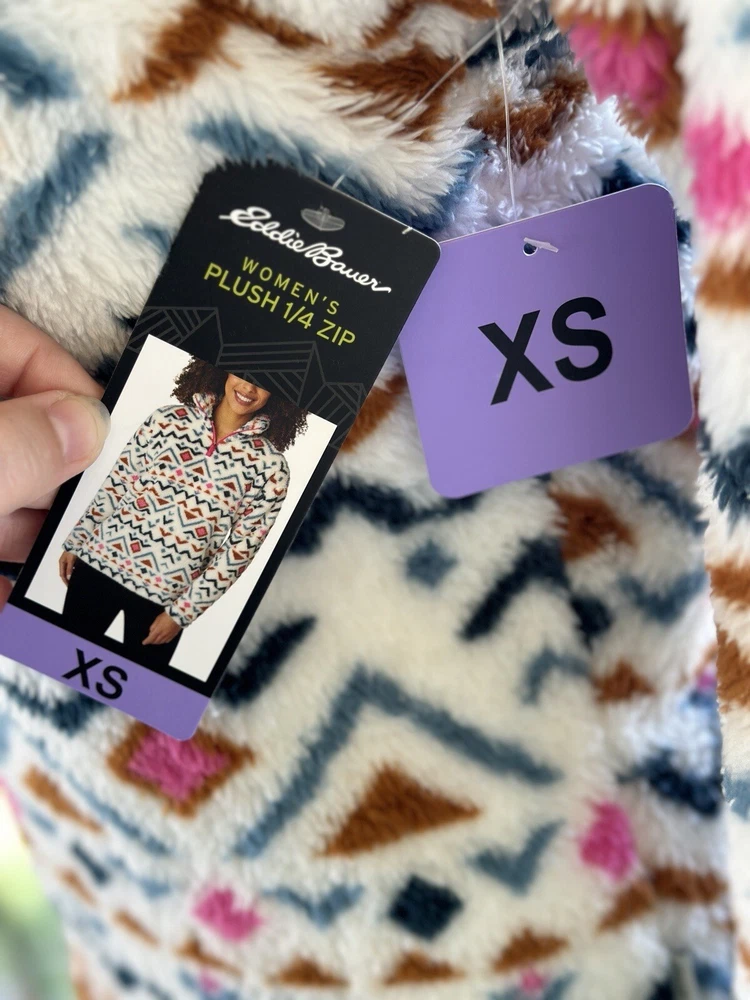 Stay cozy and comfortable this winter with this Eddie Bauer Size Extra Small Soft Faux Fur Plush Quarter Zip Fleece Pullover. The plush fleece material provides warmth and comfort during the colder seasons, while the 1/4 zip and pullover closure make it easy to put on and take off. The geometric pattern and multicolor design add a stylish touch, making it perfect for both travel and casual occasions. This pullover is new with tags and is made of polyester, making it a great addition to your winter wardrobe. Please see photos as they are a part of the description. All sales are final. Thanks for looking.