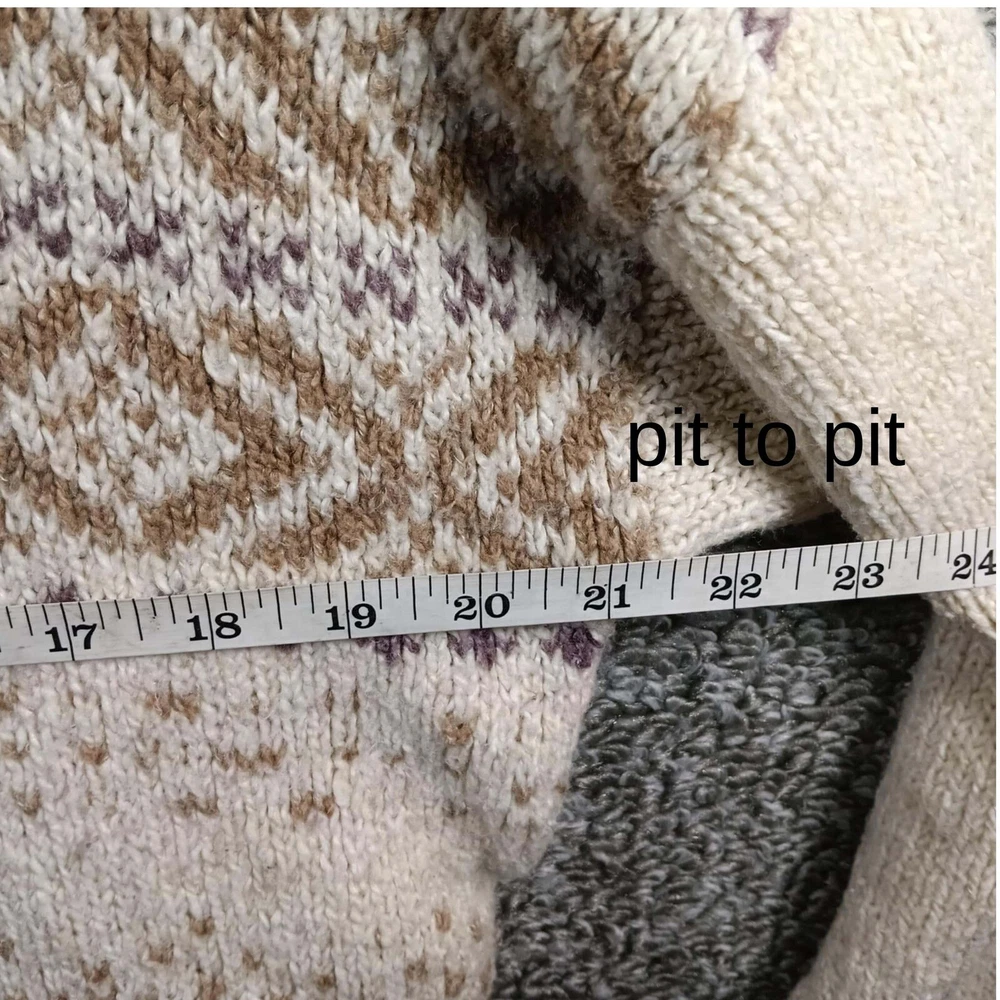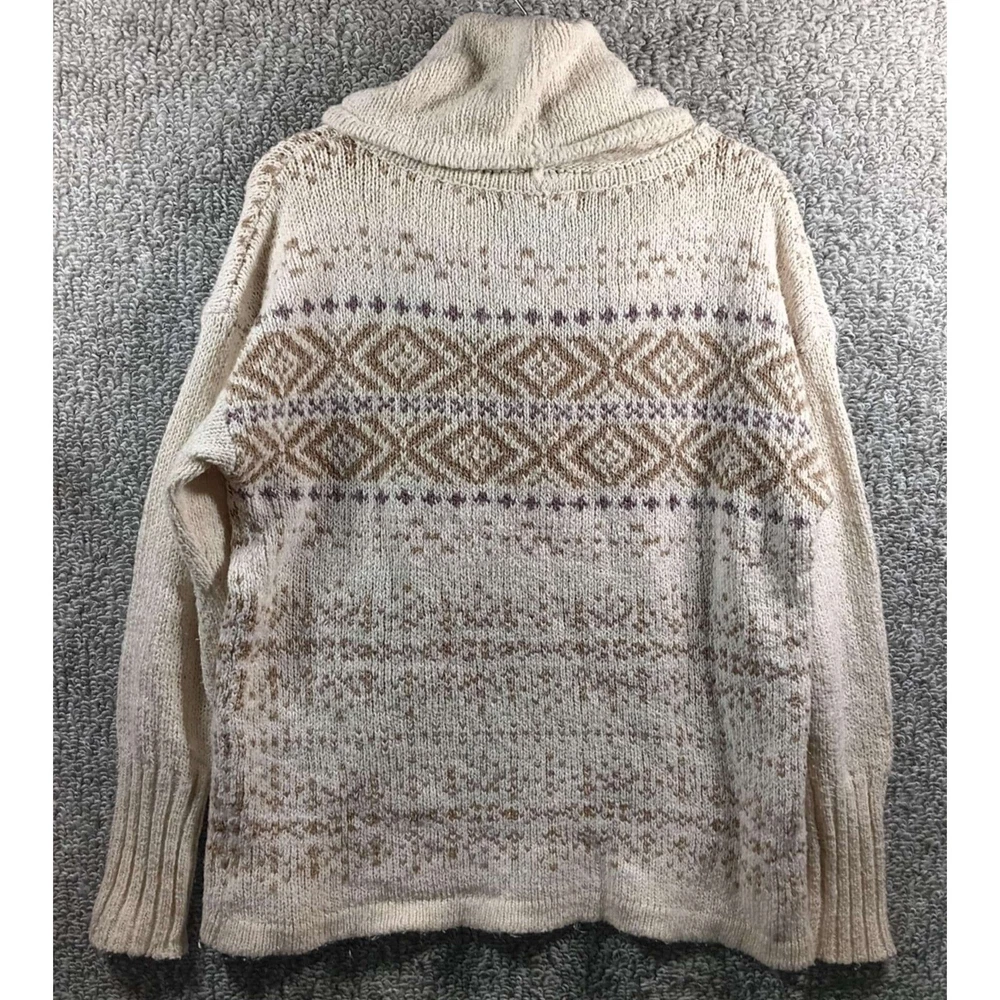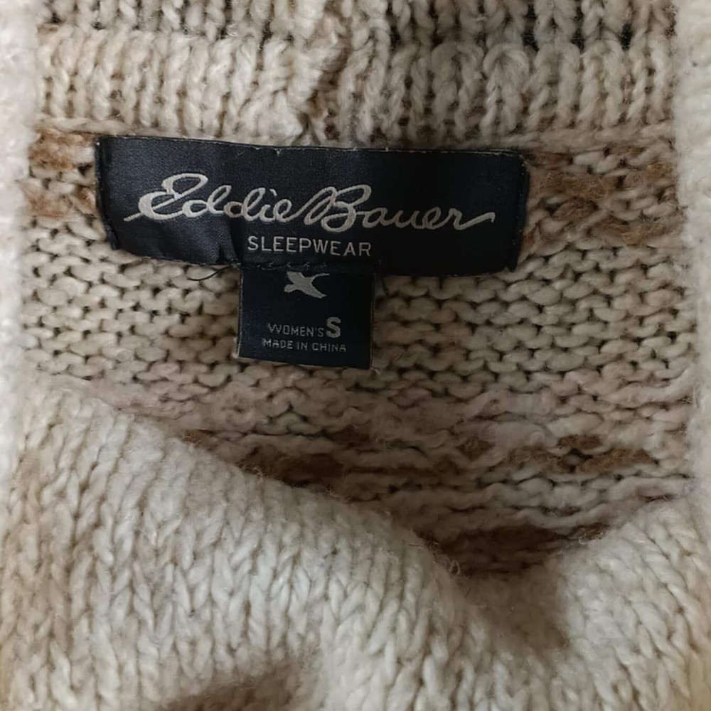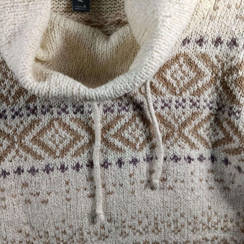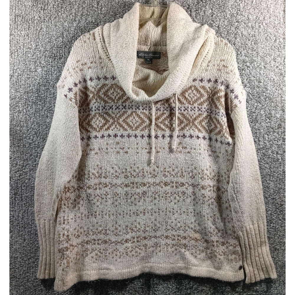 Good Condition *may have some piling Measurements in the pictures Eddie Bauer Sleepwear - brand Cowl Neck with drawstrings Pullover Sweater Fair Isle Print Cotton Acrylic Polyester Spandex Beige Tan Brown Women's Small A cozy and stylish Eddie Bauer Sleepwear sweater, perfect for relaxing evenings or casual outings. This knit pullover features a comfortable cowl neck with a drawstring, adding a touch of elegance to its relaxed design. The Fair Isle pattern in neutral tones enhances its visual appeal, making it a versatile addition to any wardrobe. Ideal for wearing at home during chilly evenings, or for a casual weekend brunch. Inventory BIN/LM/2L