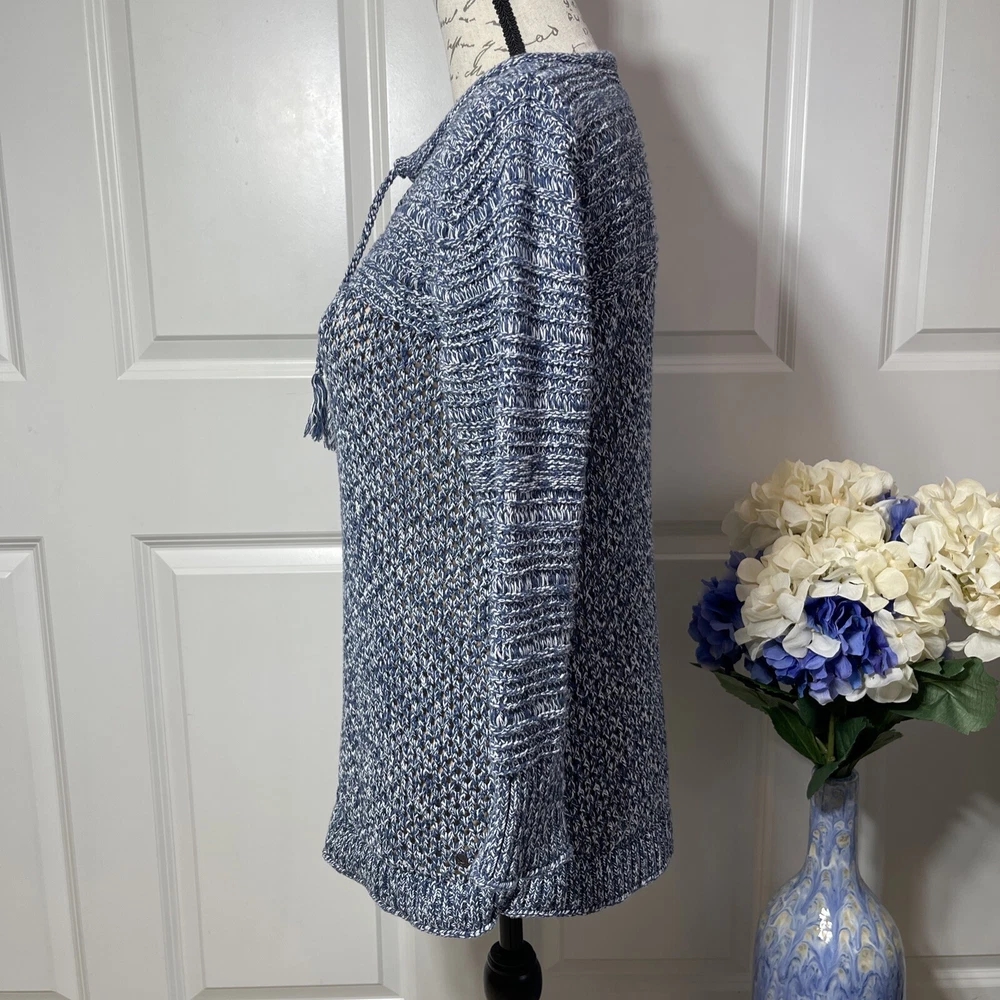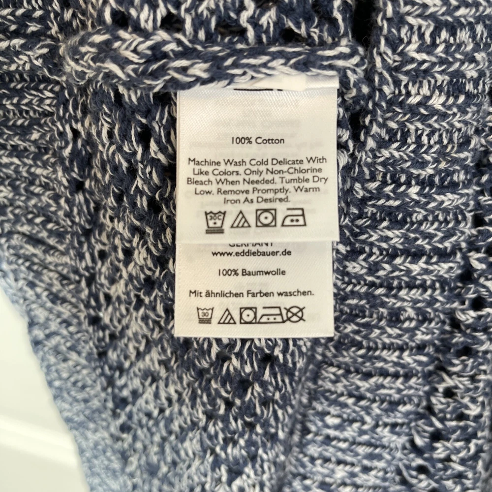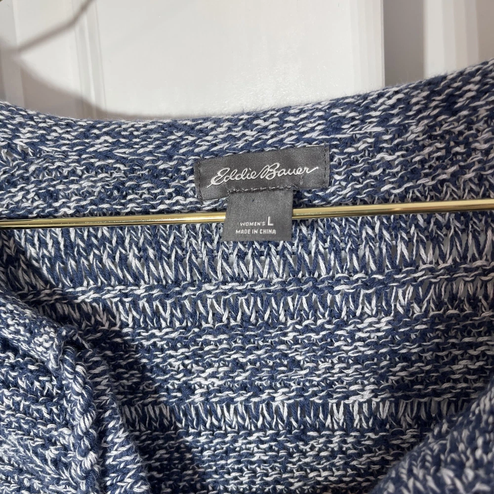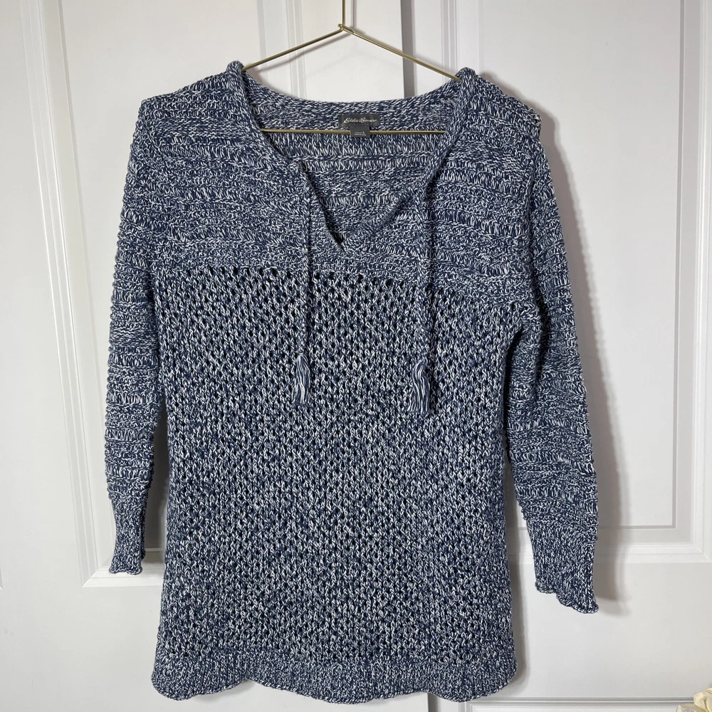 This beautiful Eddie Bauer women's sweater is perfect for casual occasions and outdoor activities. With a tie-neck style and comfortable fit, it's made of 100% cotton and features an open-knit pattern that's perfect for winter. The sweater has long sleeves and comes in size L, making it a great addition to any wardrobe. This blue pullover sweater is machine washable and easy to care for. It's perfect for any woman who wants to look stylish and feel comfortable at the same time. The sweater is made with high-quality fabric and is perfect for anyone who loves outdoor adventures. The sweater has been previously worn, but is in great condition. It is a knit sweater with two different patterns, tie at the neckline. Sleeves are more of a three-quarter inch style, not quite a long sleeve. The sweater would be perfect for hiking or a casual day out on the waterfront! bust measures 34 inches length 26 inches sleeve from armpit to cuff 13 inches Please review photos carefully and ask questions if you have any before purchase! B3