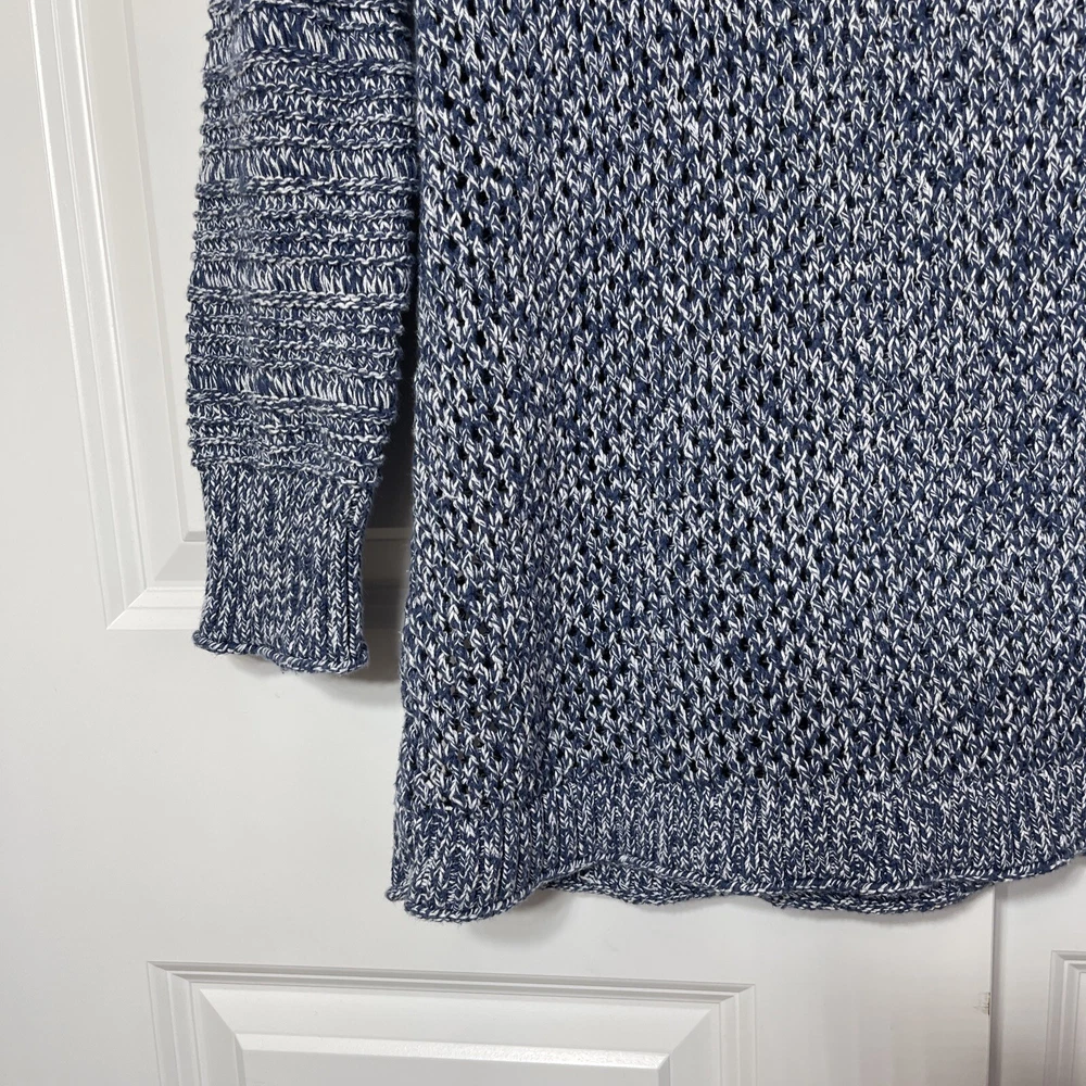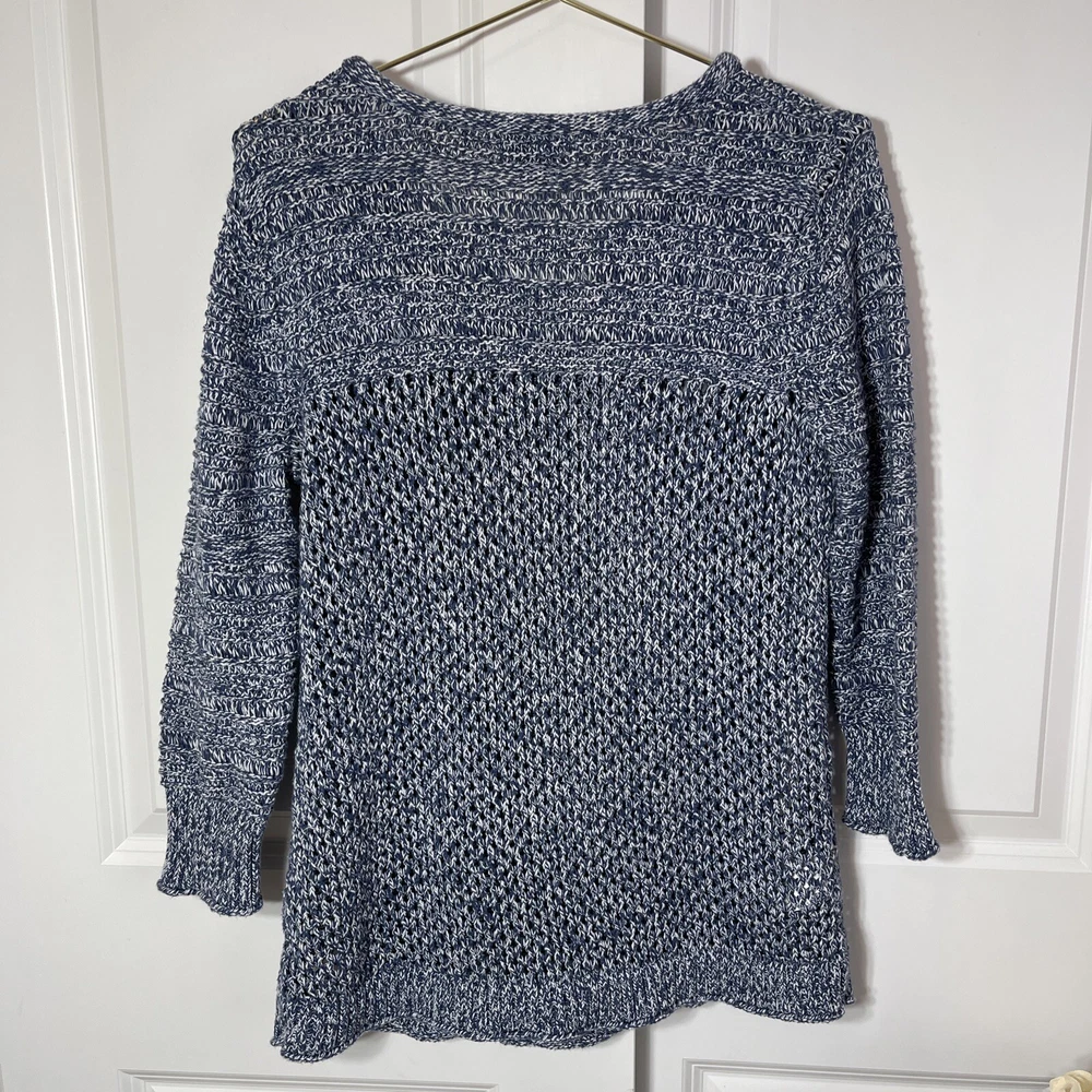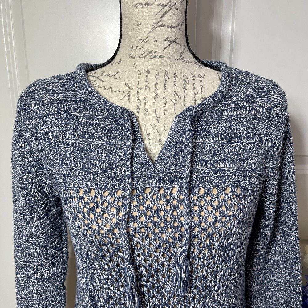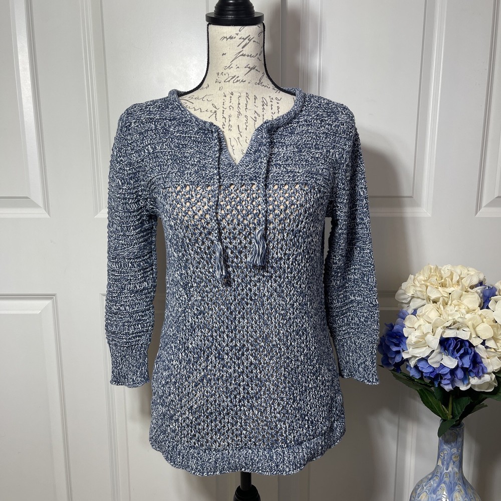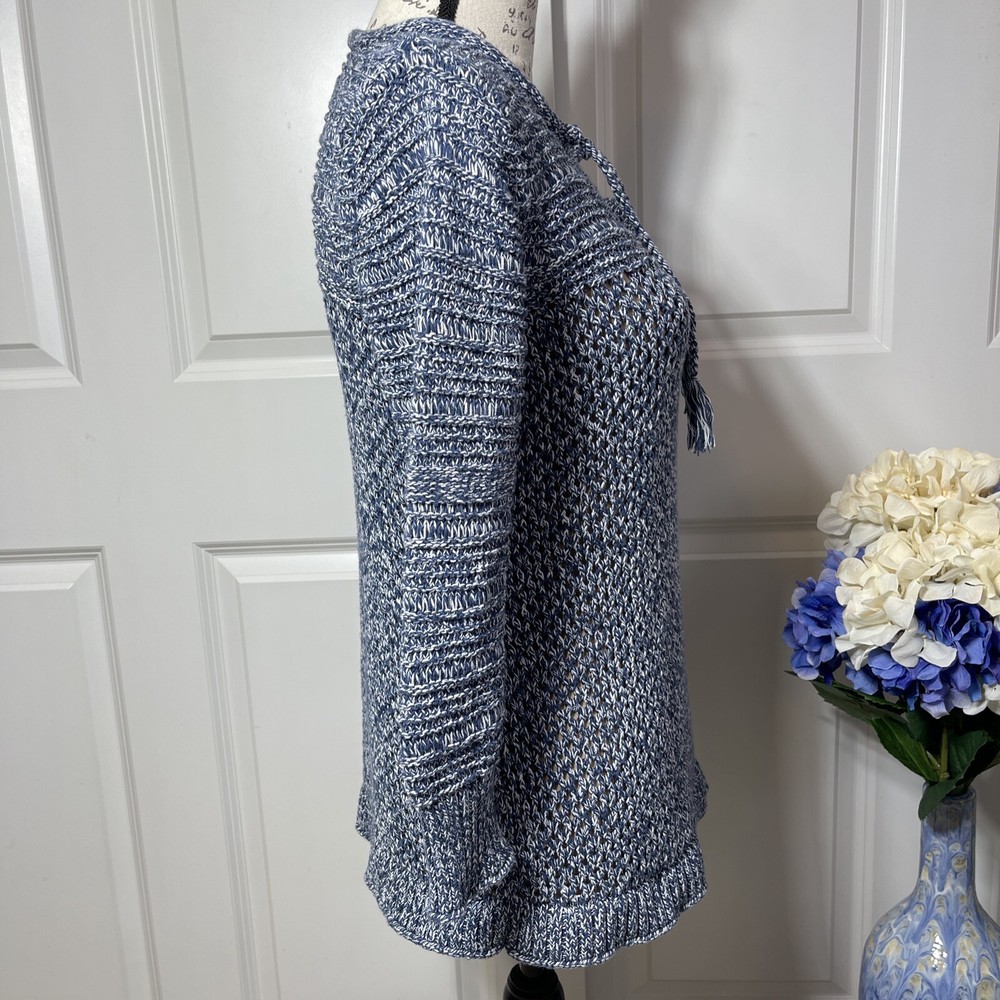 This beautiful Eddie Bauer women's sweater is perfect for casual occasions and outdoor activities. With a tie-neck style and comfortable fit, it's made of 100% cotton and features an open-knit pattern that's perfect for winter. The sweater has long sleeves and comes in size L, making it a great addition to any wardrobe. This blue pullover sweater is machine washable and easy to care for. It's perfect for any woman who wants to look stylish and feel comfortable at the same time. The sweater is made with high-quality fabric and is perfect for anyone who loves outdoor adventures. The sweater has been previously worn, but is in great condition. It is a knit sweater with two different patterns, tie at the neckline. Sleeves are more of a three-quarter inch style, not quite a long sleeve. The sweater would be perfect for hiking or a casual day out on the waterfront! bust measures 34 inches length 26 inches sleeve from armpit to cuff 13 inches Please review photos carefully and ask questions if you have any before purchase! B3