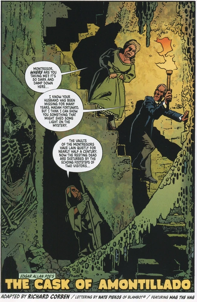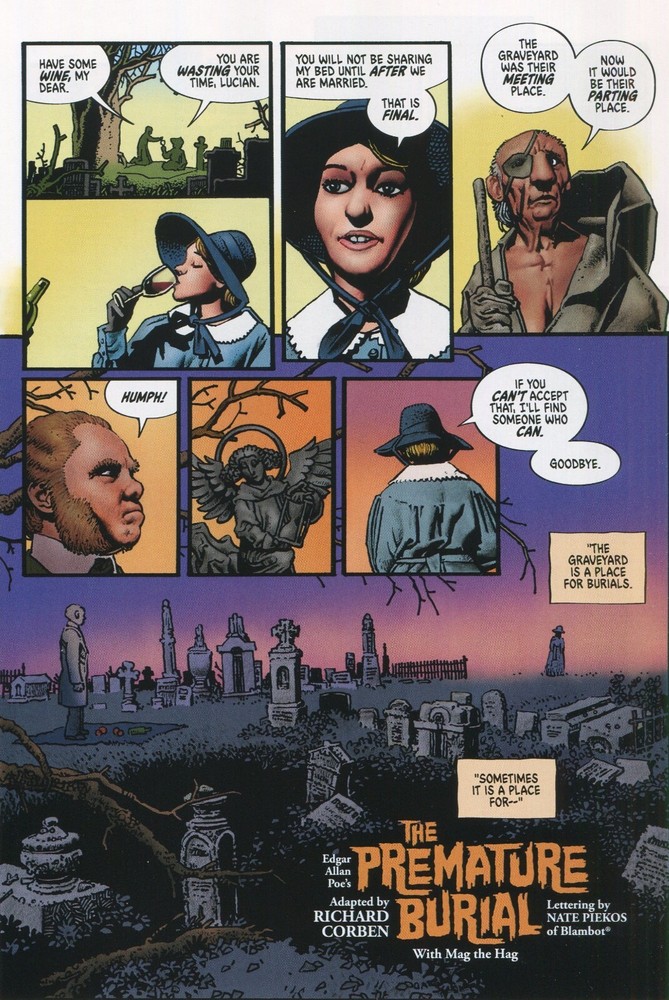 Edgar Allan Poe’s The Premature Burial One-Shot Comic Featuring 2 Morbid Tales of being Buried Alive by macabre artist extradinaire, Richard Corben. Awesome!! Cover by: Richard Corben & Beth Corben Reed Awakening in pitch darkness in a confined area... being buried alive. The fear of being buried alive is presented in two horrifying Edgar Allan Poe adaptations; "The Premature Burial" & "The Cask of Amontillado" by Richard Corben. Horror doesn't get any better! Legendary horror writer with legendary comics artist. It's everything a Edgar Allan Poe, Richard Corben, and Horror enthusiasts could hope for in a single comic. Also includes a short Richard Corben biography. Good Stuff! Now, Dark Horse Comics presents, "Edgar Allan Poe’s The Premature Burial". Prepare to experience the terrifying horror of being buried alive... Story/Spoilers: Edgar Allan Poe’s The Premature Burial Adapted by: Richard Corben Artist: Richard Corben Colorists: Beth Corben Reed w/ Richard Corben Letterer: Nate Piekos of Blambot "The Premature Burial" is a horror short story by American writer Edgar Allan Poe, published in 1844 in The Philadelphia Dollar Newspaper. Its main character expresses concern about being buried alive. This fear was common in this period and Poe was taking advantage of the public interest. The story has been adapted to a film. Lucian is frustrated that his fiance, Victoria, because she will not give him sex and she does not believe in premartial sex. In his obession and pervision, Lucian has a plan. At a graveyard outing with Victoria, Lucian tries to ply her with wine but Victoria will not have it and storms away. But getting Victoria drunk was never Lucian's plan as Victoria soon "dies" from poisoning. Soon after the burial, Lucian digs up Victoria with necrophilia on his mind. All of a sudden her eyes open and she kicks Lucian, he falls back and hits his head on a stone. Lucian ends up getting buried alive... and goes totally insane while confined underground before his inevitable death... 9 pages Edgar Allan Poe’s The Cask of Amontillado Adapted by: Richard Corben Artist: Richard Corben Colorists: Beth Corben Reed w/ Richard Corben Letterer: Nate Piekos of Blambot "The Cask of Amontillado" is a short story by American writer Edgar Allan Poe, first published in the November 1846 issue of Godey's Lady's Book. The story, set in an unnamed Italian city at carnival time in an unspecified year, is about a man taking fatal revenge on a friend who, he believes, has insulted him. Like several of Poe's stories, and in keeping with the 19th-century fascination with the subject, the narrative revolves around a person being buried alive. Montresor invites Fortunato to sample amontillado that he has just purchased without proving its authenticity. Fortunato follows him into the Montresor family vaults, which also serve as catacombs. For unknown reasons, Montresor seeks revenge upon Fortunato and is actually luring him into a trap. At the end of the story, the narrator reveals that 50 years have passed since he took revenge and Fortunato's body has not been disturbed. 15 pages One-Shot Comic is bagged & triple boarded and will be carefully / securely packaged then shipped via USPS Priority Mail to ensure that it arrives to you perfectly and quickly. First Printing Publisher: Dark Horse Comics Publication Date: April 2014 Format: FC, 32 pages, Comic, 10.20" x 6.65" UPC: 761568250640 Collectible Entertainment note: One-Shot Comic is in Fine + condition. Very Nice ! Please See Scans!! A must have for any serious Richard Corben, Edgar Allan Poe and/or Horror collector / enthusiast. A fun & entertaining read. Highly Recommended. Please read return policy. Please check out all my other Groo or Conan or Magazines or orrorH Horror or Werewolf or Zombie or Frank Frazetta or GI Joe or War or Judge Dredd or Infinity or Marvel Secret Wars or Crisis on Infinite Earths or Spawn or Venom or Carnage or Toxin or Kolchak or Mad Max or Star Trek or Starship Troopers or Science Fiction or Horror or James Bond or Adventure Time or Movie Adaptations or Spider-Man or Flash Gordon or Richard Corben or Indiana Jones or Star Wars or Jurassic Park or Dinosaurs Attack or Mars Attacks or Planet of the Apes or Godzilla or Robocop or Aliens or Predator or Terminator listings by visiting my store and typing Groo or Conan or Magazine or Horror or Werewolf or Zombie or Frank Frazetta or GI Joe or War or Judge Dredd or Infinity or Marvel Secret Wars or Crisis on Infinite Earths or Spawn or Venom or Carnage or Toxin or Mad Max or Kolchak or Star Trek or Science Fiction or James Bond or Adventure Time or Movie or Spider-Man or Flash Gordon or Richard Corben or Indiana Jones or Star Wars or Jurassic Park or Dinosaurs Attack or Mars Attacks or Planet of the Apes or Godzilla or Starship Troopers or Thing or Robocop or Aliens or Predator or Terminator in the store search engine.